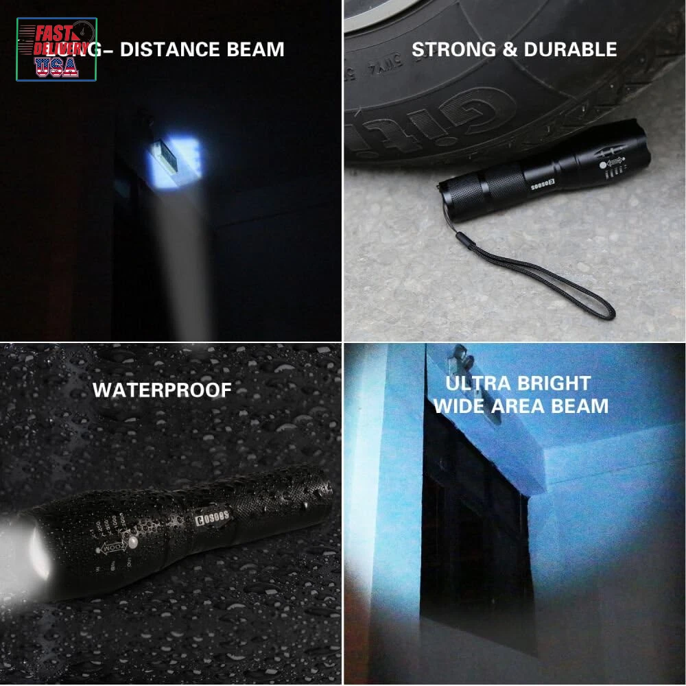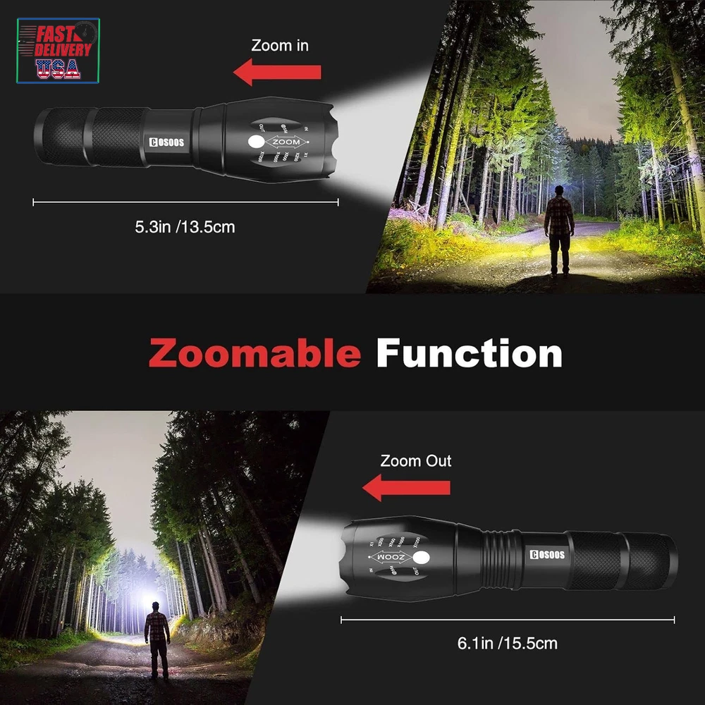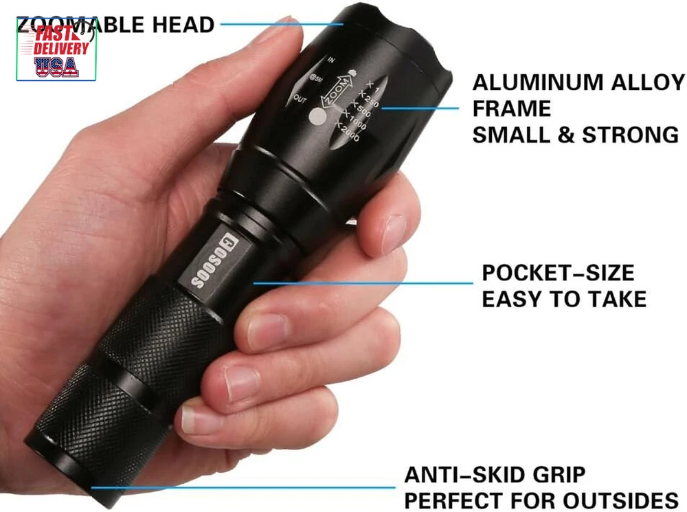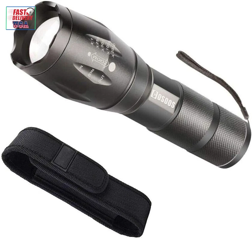Store New Arrivals Add to Favorite View Feedback Contact LED Flashlight with Holster, Bright Tactical Flashlight 1000 Lumen, Zoomable 5-Mode Portable Waterproof Flash Light for Emergency, Hiking, Outdoor Camping Gear Accessories, No AAA Battery Description Light Source Type LED Style Must- have tool in car, truck, boat or when electricity is not supplied Power Source 4.2v rechargeable battery or 3*AAA batteries (not included) Battery Cell Composition Alkaline Light Path Distance 500 Meters Performance Description Super Bright,Durable,Handy,Easy to USE, Portable Country of Origin China Warranty Description Manufacturer warranty for 1 year from date of purchase. Switch Style Push button Batteries Included? No Measurement System English/Standard Usage Patrolling, General Purpose, Everyday Carry, Camping, Hiking, Fishing, Reading,Running, Dog Walking, Power Outages, Emergency, Everyday Use, Backup, Car, Boat,Home, Indoor, Outdoor Sound Level 1 dB Battery Description Support 3*AAA Batteries(not included) or 3.7 Rechargeable Battery(not included) Batteries Required? Yes Runtime 100000 hours Product Dimensions 5.3"D x 1.1"W x 1.1"H Material Aluminum Installation Method Battery '+' goes inside first,press button. Number of Batteries 3 AAA batteries required. Is Discontinued By Manufacturer No Item Package Quantity 1 White Brightness 1000 Lumens Brightness 1000 Lumen Water Resistance Level Waterproof Warranty Type Manufacturer and Seller Combination Item Weight 4.1 ounces Head Style Zoom,Zoomable,Adjustable Special Features Tactical light /handheld flashlight, adjust its focus for different usage, internal wiring applies the high efficient booster circuit, working voltage is wide and can utilize the batteries in the largest extent, waterproof design, 5 switch modes: high /middle /low /strobe /SOS, made of high quality aluminum alloy, flashlight is sturdy and durable enough for long time daily using, high power LED, 1000 lumen Laser Beam Color White,Bright,from Wide Circle to Square Beam Special Feature function(f) {var _np=(window.P._namespace("DetailPageProductOverviewTemplatesJava"));if(_np.guardFatal){_np.guardFatal(f)(_np);}else{f(_np);}}(function(P) { P.when('A').execute(function(A){ A.on('a:truncate:po-attribute-truncate-0:updated', function(data) { var isTruncated = !data.truncateInstance.getIfTextFits(); var seeMoreElement = document.getElementById('po-attribute-see-more-id-0'); if(seeMoreElement) { seeMoreElement.style.display = isTruncated ? '' : 'none'; } }) }); })); Tactical light /handheld flashlight, adjust its focus for different usage, internal wiring applies the high efficient booster circuit, working voltage is wide and can utilize the batteries in the largest extent, waterproof design, 5 switch modes: high /middle /low /strobe /SOS, made of high quality aluminum alloy, flashlight is sturdy and durable enough for long time daily using, high power LED, 1000 lumen See more Description Pile Support 3*AAA Batteries(not included) or 3.7 Rechargeable Battery(not included) Part Number Bright Flashlight Color flashlight and flashlight holster Wattage 10 watts Accessory Connection Type with holsters for belt Batteries 3 AAA batteries required. Voltage 4.2 Volts Recommended Uses For Product Tactical, Cycling, Reading, Caving, Fishing, Camping, Hiking, Jogging Included Components User Guide (No AAA battery), 1 Flashlight Holster, 1* Tactical Flashlight Extension Length extend the flashlight to 6.1in/15/5cm for spotlight, unextended length is 5.3inch/13.5 for floodlight Size 1-Pack 2025 New Year Gift, Hiking & Camping Gear Essentials: Made of high quality aluminium alloy. Keep dark & baddy away, great gear/backup for your home, basement, car, especially electricity is not supplied because of hurricane, tropical storm, blizzards or snowfall AAA or Rechargeable 3.7 V Battery Available: LED makes COSOOS 1000-lumen flashlight much brighter than most ordinary flash lights. Dual power supply, runs on either a 4.2 V lithium ion battery or 3 AAA batteries. (Not included) Portable Small Size: Weather or water resistant, anti-abrasive, skid proof, compact design makes COSOOS tactical flashlights the top pocket size flash lights for outdoor activities, trip, hunting, camping, hiking, fishing, walking dog at night, home use, and as a bright lamp, can be useful while meeting severe weather or power outage. Easy to carry 5 Light Modes & Zoom Function: Full brightness, medium brightness, low brightness, strobe brightness and SOS. Tail button allows you to cycle through 5 different output levels. Adjustable slide focus for close or far long range. Functions as a spot light that throws an intense beam of light up to 600 feet ahead or floodlight that brings illumination to a wide area Flashlights High Lumen Brightness: Come with 1 bright EDC flashlight and 1 flashlight holster. All COSOOS flashlights come with 1 year warranty, if there is any question, please let us know Product Description The video showcases the product in use. The video guides you through product setup. The video compares multiple products. The video shows the product being unpacked. Birthday Gift Great as mechanic tool, camping gear essentials, hurricane supplies & survival kits. Great gift for dad, husband, man, mum, wife, woman, kids, adults, friend, student, outdoor enthusiast, runner, cyclist, postman, delivery, mechanics, courier, carrier, tow truck driver, co worker,employee. Specification Blub Type: Super Bright LED LED Lamp Lifespan: 100,000 Hours Beam Type: Flood / Spot Brightness: White beam up to 1000 lumen Flashlight Body Material: Aluminum Alloy Range: up to 200m / 600ft Flash light Dimensions: 5.3"(L) x 1.4" (Head) (6.1" Extended length) Flash light Weight: 4.7oz /134g Brightness Dimming Modes: Full, Medium, Low, Quick Strobe, SOS Dual Power Supply Design: 1x 4.2V Big Battery (not included) or 3x AAA Batteries (not included) Bad weather, outdoor navigation, power outages, tactical defense? COSOOS flashlights with pouch hols