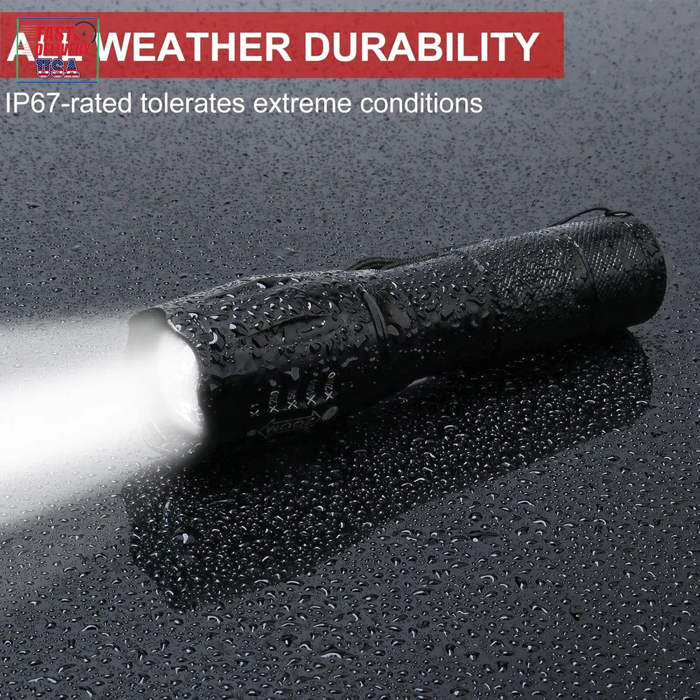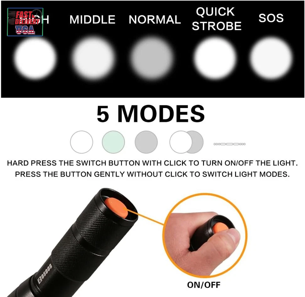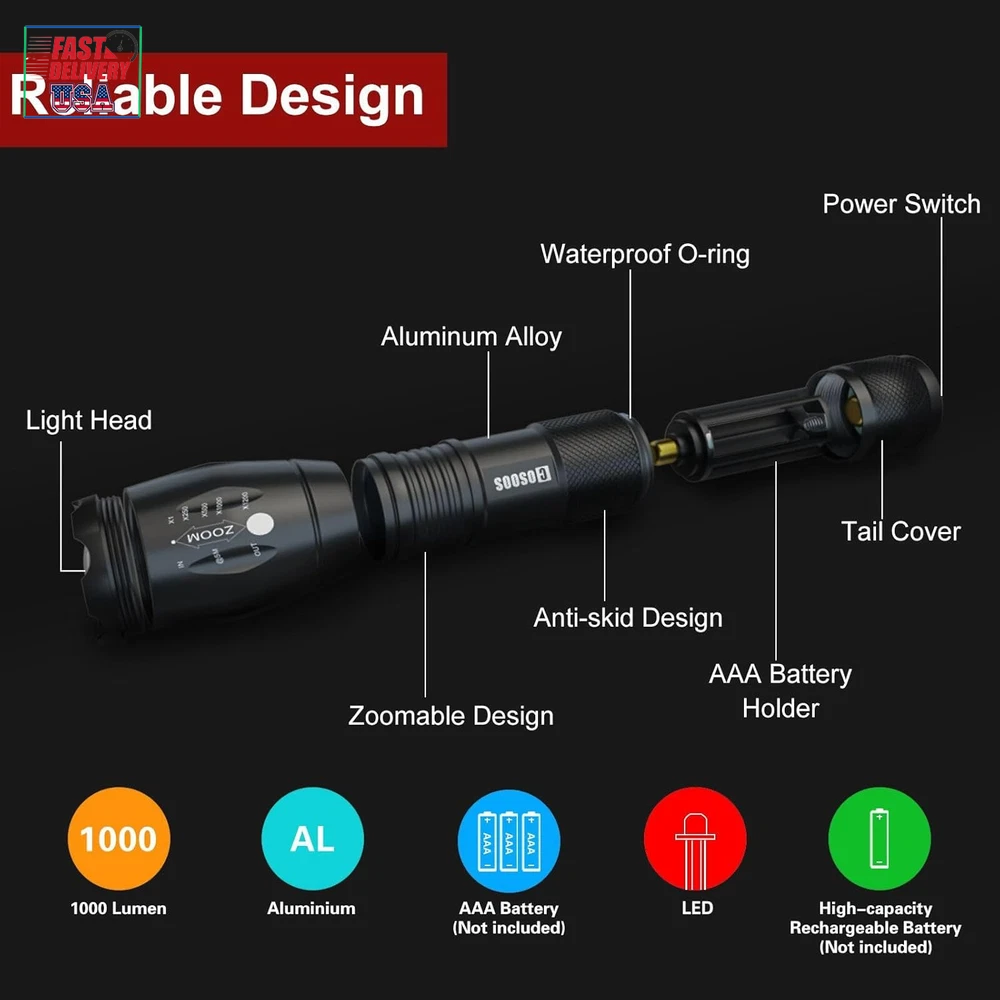 Store New Arrivals Add to Favorite View Feedback Contact LED Flashlight with Holster, Bright Tactical Flashlight 1000 Lumen, Zoomable 5-Mode Portable Waterproof Flash Light for Emergency, Hiking, Outdoor Camping Gear Accessories, No AAA Battery Description Light Source Type LED Style Must- have tool in car, truck, boat or when electricity is not supplied Power Source 4.2v rechargeable battery or 3*AAA batteries (not included) Battery Cell Composition Alkaline Light Path Distance 500 Meters Performance Description Super Bright,Durable,Handy,Easy to USE, Portable Country of Origin China Warranty Description Manufacturer warranty for 1 year from date of purchase. Switch Style Push button Batteries Included? No Measurement System English/Standard Usage Patrolling, General Purpose, Everyday Carry, Camping, Hiking, Fishing, Reading,Running, Dog Walking, Power Outages, Emergency, Everyday Use, Backup, Car, Boat,Home, Indoor, Outdoor Sound Level 1 dB Battery Description Support 3*AAA Batteries(not included) or 3.7 Rechargeable Battery(not included) Batteries Required? Yes Runtime 100000 hours Product Dimensions 5.3"D x 1.1"W x 1.1"H Material Aluminum Installation Method Battery '+' goes inside first,press button. Number of Batteries 3 AAA batteries required. Is Discontinued By Manufacturer No Item Package Quantity 1 White Brightness 1000 Lumens Brightness 1000 Lumen Water Resistance Level Waterproof Warranty Type Manufacturer and Seller Combination Item Weight 4.1 ounces Head Style Zoom,Zoomable,Adjustable Special Features Tactical light /handheld flashlight, adjust its focus for different usage, internal wiring applies the high efficient booster circuit, working voltage is wide and can utilize the batteries in the largest extent, waterproof design, 5 switch modes: high /middle /low /strobe /SOS, made of high quality aluminum alloy, flashlight is sturdy and durable enough for long time daily using, high power LED, 1000 lumen Laser Beam Color White,Bright,from Wide Circle to Square Beam Special Feature function(f) {var _np=(window.P._namespace("DetailPageProductOverviewTemplatesJava"));if(_np.guardFatal){_np.guardFatal(f)(_np);}else{f(_np);}}(function(P) { P.when('A').execute(function(A){ A.on('a:truncate:po-attribute-truncate-0:updated', function(data) { var isTruncated = !data.truncateInstance.getIfTextFits(); var seeMoreElement = document.getElementById('po-attribute-see-more-id-0'); if(seeMoreElement) { seeMoreElement.style.display = isTruncated ? '' : 'none'; } }) }); })); Tactical light /handheld flashlight, adjust its focus for different usage, internal wiring applies the high efficient booster circuit, working voltage is wide and can utilize the batteries in the largest extent, waterproof design, 5 switch modes: high /middle /low /strobe /SOS, made of high quality aluminum alloy, flashlight is sturdy and durable enough for long time daily using, high power LED, 1000 lumen See more Description Pile Support 3*AAA Batteries(not included) or 3.7 Rechargeable Battery(not included) Part Number Bright Flashlight Color flashlight and flashlight holster Wattage 10 watts Accessory Connection Type with holsters for belt Batteries 3 AAA batteries required. Voltage 4.2 Volts Recommended Uses For Product Tactical, Cycling, Reading, Caving, Fishing, Camping, Hiking, Jogging Included Components User Guide (No AAA battery), 1 Flashlight Holster, 1* Tactical Flashlight Extension Length extend the flashlight to 6.1in/15/5cm for spotlight, unextended length is 5.3inch/13.5 for floodlight Size 1-Pack 2025 New Year Gift, Hiking & Camping Gear Essentials: Made of high quality aluminium alloy. Keep dark & baddy away, great gear/backup for your home, basement, car, especially electricity is not supplied because of hurricane, tropical storm, blizzards or snowfall AAA or Rechargeable 3.7 V Battery Available: LED makes COSOOS 1000-lumen flashlight much brighter than most ordinary flash lights. Dual power supply, runs on either a 4.2 V lithium ion battery or 3 AAA batteries. (Not included) Portable Small Size: Weather or water resistant, anti-abrasive, skid proof, compact design makes COSOOS tactical flashlights the top pocket size flash lights for outdoor activities, trip, hunting, camping, hiking, fishing, walking dog at night, home use, and as a bright lamp, can be useful while meeting severe weather or power outage. Easy to carry 5 Light Modes & Zoom Function: Full brightness, medium brightness, low brightness, strobe brightness and SOS. Tail button allows you to cycle through 5 different output levels. Adjustable slide focus for close or far long range. Functions as a spot light that throws an intense beam of light up to 600 feet ahead or floodlight that brings illumination to a wide area Flashlights High Lumen Brightness: Come with 1 bright EDC flashlight and 1 flashlight holster. All COSOOS flashlights come with 1 year warranty, if there is any question, please let us know Product Description The video showcases the product in use. The video guides you through product setup. The video compares multiple products. The video shows the product being unpacked. Birthday Gift Great as mechanic tool, camping gear essentials, hurricane supplies & survival kits. Great gift for dad, husband, man, mum, wife, woman, kids, adults, friend, student, outdoor enthusiast, runner, cyclist, postman, delivery, mechanics, courier, carrier, tow truck driver, co worker,employee. Specification Blub Type: Super Bright LED LED Lamp Lifespan: 100,000 Hours Beam Type: Flood / Spot Brightness: White beam up to 1000 lumen Flashlight Body Material: Aluminum Alloy Range: up to 200m / 600ft Flash light Dimensions: 5.3"(L) x 1.4" (Head) (6.1" Extended length) Flash light Weight: 4.7oz /134g Brightness Dimming Modes: Full, Medium, Low, Quick Strobe, SOS Dual Power Supply Design: 1x 4.2V Big Battery (not included) or 3x AAA Batteries (not included) Bad weather, outdoor navigation, power outages, tactical defense? COSOOS flashlights with pouch hols