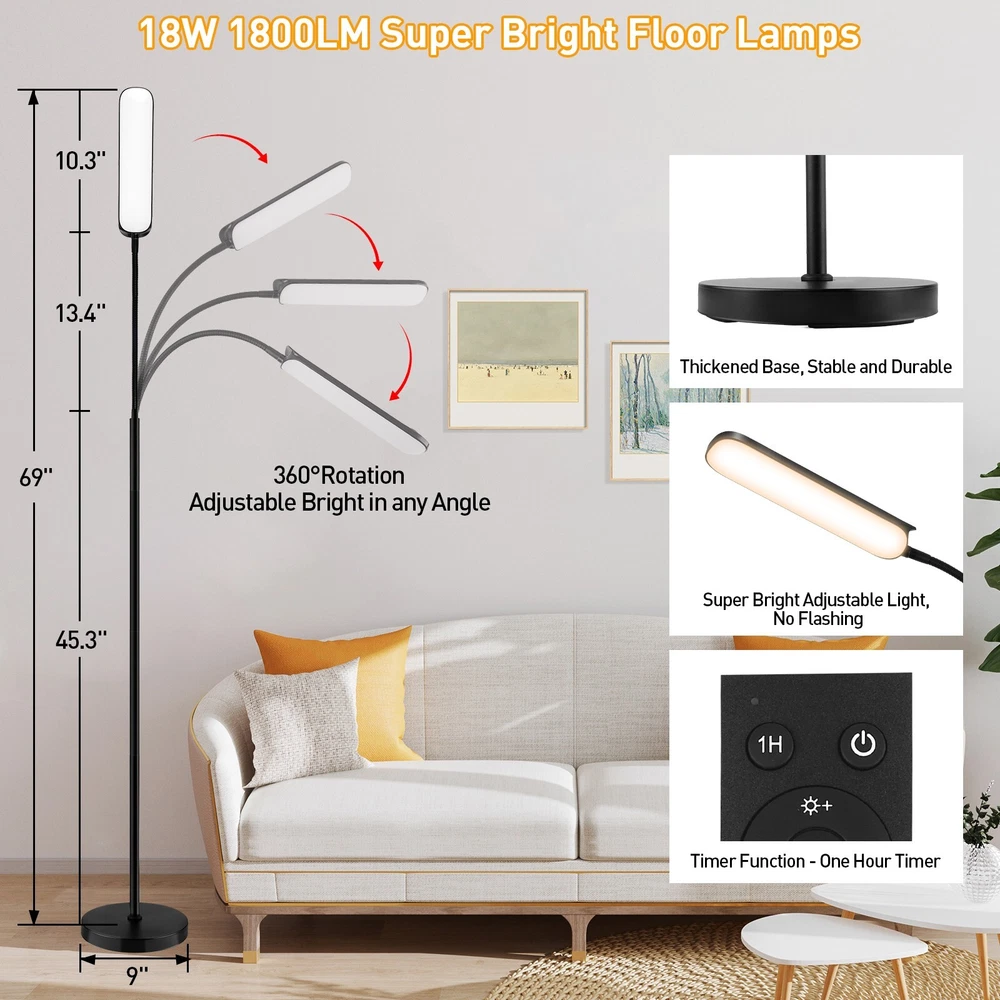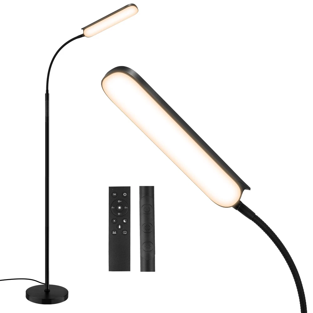 18W Upgrade Floor Lamp Different Color Temperature Options --- Meeting daily requirements ! Remote Control has a 50feet Range --- Easy to Use Product Features Flicker- Free Eye Protection Use Premium LED technology and equipped with a light guide plate, soft and natural light, no flicker. Easy to Install Installation is very easy and can be done in less than a minute, no other tools or parts required. Stable Base The stable base is designed to be safe and easy to use, even if the floor lamp is hit by a pet, there will be no problem. 360° Adjustable Lamp Head Unique lamp head shape and flexible gooseneck, perfectly satisfies your needs, and lights up every corner. 5 Mode Functions ---- Bright Up Your Life ! Enjoy Reading Time Best Present Choices Also be used as a Christmas present and birthday present for your family and friends!
