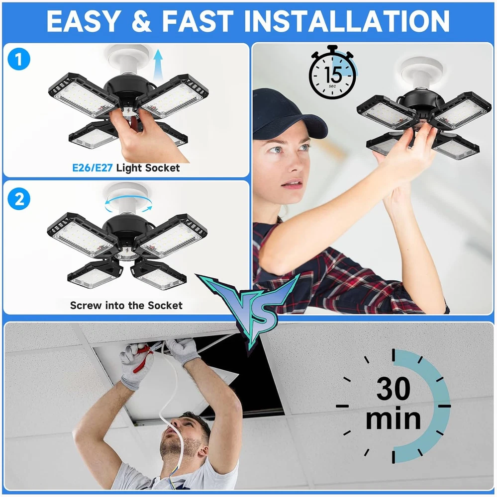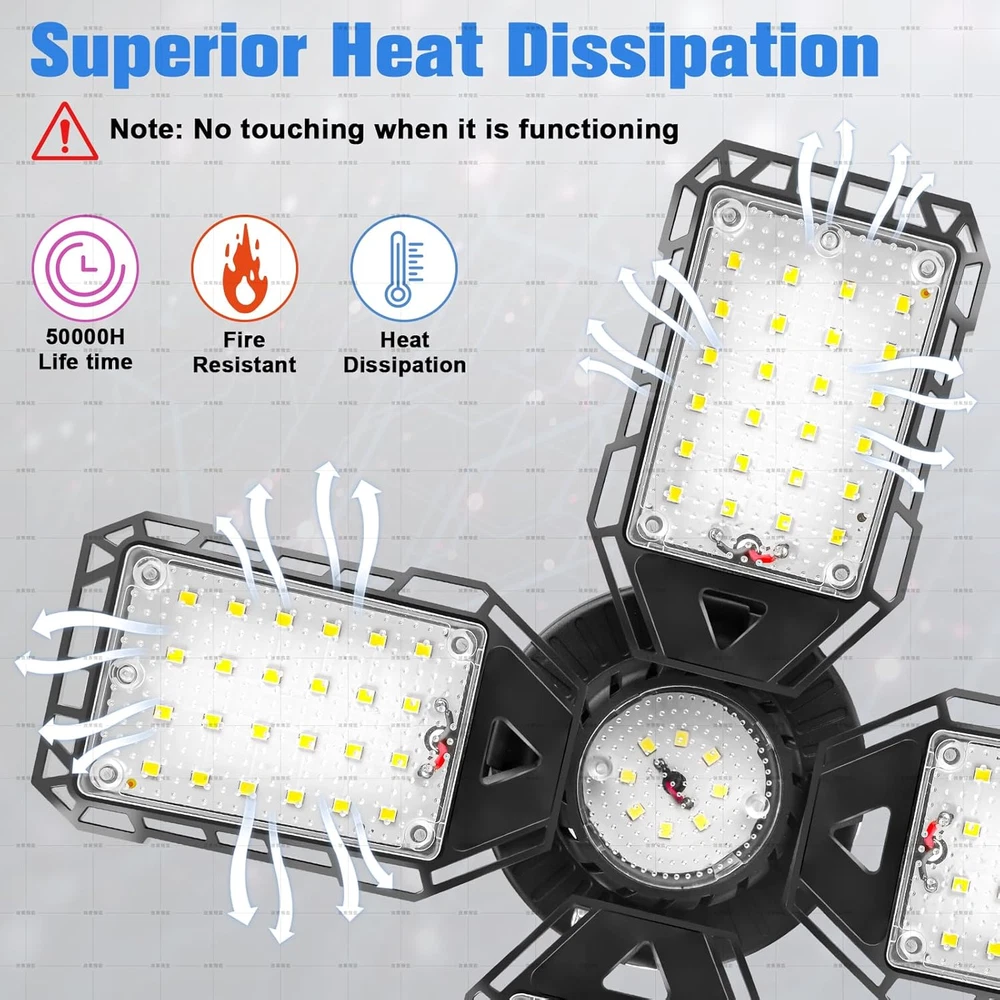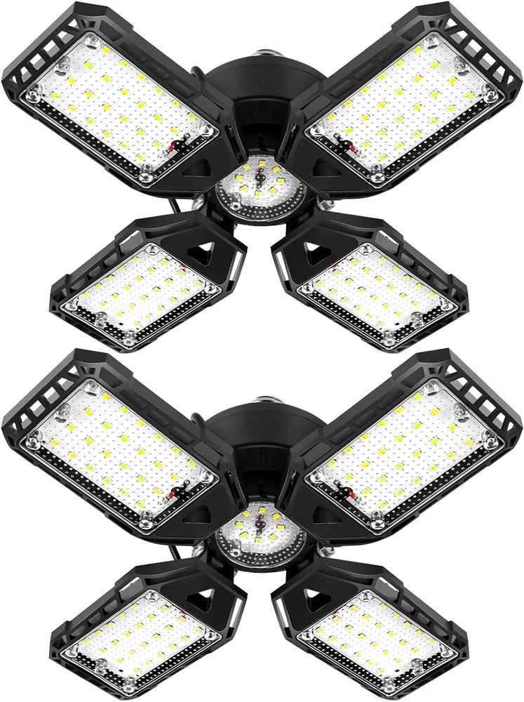 【Ultra Bright 12000 Lumens 】360°Super Brighter Illumination with 96 pieces of LED lights, total 160W,Produce 16000lumens. In addition, it provides 6500Kdaylight source and CRI> 80Ra color rendering index.This led garage light can provide the best indoor lighting experience. 【4+1 Newest Garage Lights】With 4+1 deformable panels,the garage lights can be adjustable from 0 to 90 degree, which illuminate each corner of your garage in 360 full coverage without visual blind spots and dizziness. They will provide better light than 3, 4 and 5 panel garage lights on the market. 【Safety & Energy Saving】Upgraded Garage Lighting Bulb is made of high quality aluminum heatsink and each panel features a unique hollow-out design that make a better heat dissipation. Make lifespan more than 50000 hours , and equivalent to 6 traditional light bulbs, more than 85% energy saving than traditional lamp. 【Easy Installation】 Our shop lighting, garage lighting can supper fit for the E26/E27 socket, it is as simple as installing it in a ordinary a light bulb. You only needs 30 seconds for done. no need of any tools, wiring, or professional electrician. They are good led lights for shop. 【Wide Application】 :Our New Garage Ceiling Light, with the distinctive design and excellent lighting effect, is suitable for large area lighting, such as garage, barn, exhibition area, stadium, utility room, warehouse, shop, office, basement,workshop,work place,barn and so on. An ideal choice for commercial and indoor lighting solution. 6000 lumen max blast tri 8000 lumen best garage lights hanging socket ultra folding attic gym 80 watt utility illuminator 360 basement