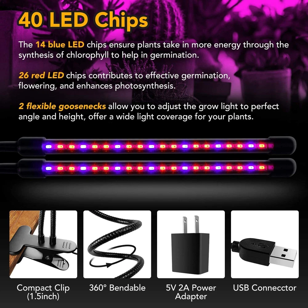 About this item The red and blue spectrum adjustable gooseneck lamp provides the optimal wavelengths for chlorophyll absorption and photosynthesis, promoting healthy plant growth and increasing yields. The grow light is suitable for a variety of indoor growing setups, including hydroponics, aeroponics, and soil-based systems, making it a versatile and adaptable choice for indoor gardening enthusiasts. The auto ON/OFF function with timing options ensures that your plants receive the appropriate amount of light each day, without the need for manual intervention. The 11 dimmable levels allow you to create a customized lighting schedule for your plants, ensuring that they receive the ideal amount of light at each stage of their growth cycle. The dual head LED grow light has a compact and lightweight design, making it easy to install and move around as needed. The grow light suitable for a number of potted landscape and indoor garden plants that include: flowering plants: roses, chrysanthemum, peony, tulip and many others. greens: like tomatoes, chili, choy, herbs etc. succulents: ball cactus, burros tail, ball cactus, and others. 360° Flexible Goosenecks Three 360° independent adjustable gooseneck ,which can be rotated to any angle according to your requirements. Sturdy Non-slip Clip Non-slip clip that can be attached anywhere for more efficient lighting for plants 40 LED Beads Equipped with 26 Red + 14 Blue LEDs, the growing light is similar to the full-spectrum sunlight at noon, that is professionally designed for indoor garden plants. USB Adapter The led growing light has a USB connector which makes it convenient to connect. 5 Brightness Levels ROM 10%-100%. Adjust grow light intensity for different stage of plant growing. Line-in Controller 3 Lighting Modes 6000K Red&Blue Light: The growing light is similar to the full-spectrum sunlight at noon, that is professionally designed for indoor garden plants. Red light, Blue lights or Mix lights can be controlled. Auto Cycel Time Function Please keep both the "time button" and "power button" on 3Hous working time: 9 a.m.-12 p.m. on (every day) 9Hous working time: 9 a.m.-18 p.m. on (every day)12 12Hous working time: 9 a.m.-21 p.m. on (every day) When keeping power, it can automatically turn on and off every day according to your settings, no more manual operation for you.
