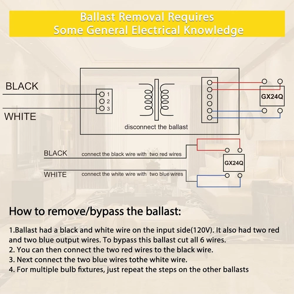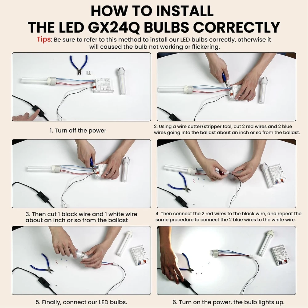 Store New Arrivals Add to Favorite View Feedback Contact LED Gx24Q 4-Pin Base Light Bulb, 12W Gx24 PL Retrofit LED Recessed Light Natural White 4000K 26W Compact Fluorescent Lamp for Ceiling Fixtures, 4-Pack (Remove/Bypass the Ballast) Description Item model number EU-ELC-0950-NWx4-F-FBA Light Source Type Light Emitting Diode (LED) Number of Items 4 Power Source Corded Electric Incandescent Equivalent Wattage 26 Watts Country of Origin China Batteries Included? No Controller Type Push Button Unit Count 4 Count Batteries Required? No Product Dimensions 1.41"W x 5.11"H Light Type LED Bulb Shape Size T Average Life 30000 Hours Material Aluminum Efficiency 112.5 lumens/watt Model Name EU-ELC-0950-NW Specific Uses For Product Lamp Item Package Quantity 4 White Brightness 1350 Lumens Indoor/Outdoor Usage Indoor Light Source Wattage 12 Watts Brightness 1350 Lumen Control Method App Light Color cool white Item Weight 8.8 ounces Connectivity Technology Normal bulb Special Features Energy Efficient Special Feature Energy Efficient Color Rendering Index 85 Part Number EU-ELC-0950-NWx4-F-FBA Color Temperature 4000 Kelvin Wattage 12 watts Beam Angle 360 Degrees Shape Tubular(T) Power Consumption 12 Watts Voltage 110 Volts Accepted voltage frequency 100 to 120 Volts and 60 Hertz [Gx24q LED Bulbs]: 12W LED Gx24 PL Lamp Bulbs, 26W CFL Equivalent, Natural White 4000K, is suitable for GX24Q Base like GX24q-1, GX24q-2 or GX24q-3 bases; Please don't use these G24q LED bulbs with photocells, timers and dimmers. [๐ต๐ถ ๐ฉ๐จ๐ณ๐ณ๐จ๐บ๐ป ๐น๐ฌ๐ธ๐ผ๐ฐ๐น๐ฌ๐ซ]: ๐ท๐๐๐๐๐ ๐๐๐๐๐๐๐๐ ๐๐ ๐๐๐๐๐๐ ๐๐๐ ๐๐๐๐๐๐๐ ๐๐๐๐๐๐ ๐๐๐ ๐๐๐๐๐๐๐ ๐๐๐๐ ๐ฎ๐ฟ24๐ ๐ช๐ญ๐ณ ๐๐๐๐๐ ๐๐๐๐ ๐๐๐ ๐ณ๐ฌ๐ซ ๐ฎ๐24 ๐๐๐๐๐. [๐๐๐๐๐๐๐๐๐๐๐๐ ๐๐๐๐]:๐.๐๐ก๐ข๐ฌ ๐๐๐๐ ๐๐๐ ๐ฅ๐๐ฆ๐ฉ ๐ข๐ฌ ๐ฎ๐ฌ๐ฎ๐๐ฅ๐ฅ๐ฒ ๐ฎ๐ฌ๐๐ ๐ญ๐จ ๐ซ๐๐ฉ๐ฅ๐๐๐ ๐๐ ๐ ๐๐ฎ๐ฅ๐๐ฌ, ๐ฌ๐จ ๐ฐ๐ก๐๐ง ๐ซ๐๐ฉ๐ฅ๐๐๐ข๐ง๐ ๐ข๐ญ, ๐ฒ๐จ๐ฎ ๐ง๐๐๐ ๐ญ๐จ ๐ซ๐๐ฆ๐จ๐ฏ๐ ๐ญ๐ก๐ ๐๐๐ฅ๐ฅ๐๐ฌ๐ญ ๐๐ซ๐จ๐ฆ ๐ญ๐ก๐ ๐ฅ๐๐ฆ๐ฉ ๐ก๐จ๐ฅ๐๐๐ซ ๐ข๐ญ๐ฌ๐๐ฅ๐ ๐๐ข๐ซ๐ฌ๐ญ. ๐๐จ ๐๐ฏ๐จ๐ข๐ ๐๐๐ฅ๐ฅ๐๐ฌ๐ญ ๐๐๐ฎ๐ฌ๐๐ ๐๐ฒ ๐ญ๐ก๐ ๐ฅ๐๐ฆ๐ฉ ๐๐จ๐๐ฌ ๐ง๐จ๐ญ ๐ฅ๐ข๐ ๐ก๐ญ, ๐ฌ๐ญ๐ซ๐จ๐๐, ๐ฌ๐ก๐จ๐ซ๐ญ ๐๐ข๐ซ๐๐ฎ๐ข๐ญ ๐๐ง๐ ๐จ๐ญ๐ก๐๐ซ ๐ฉ๐ซ๐จ๐๐ฅ๐๐ฆ๐ฌ. ๐. ๐๐ก๐ ๐ฅ๐๐ฆ๐ฉ ๐ก๐๐๐ ๐จ๐ ๐จ๐ฎ๐ซ ๐๐ฑ๐๐๐ช ๐๐๐ ๐ข๐ฌ ๐-๐ฉ๐ข๐ง, ๐ฉ๐ฅ๐๐๐ฌ๐ ๐๐ก๐๐๐ค ๐ฐ๐ก๐๐ญ๐ก๐๐ซ ๐ข๐ญ ๐ข๐ฌ ๐ฌ๐ฎ๐ข๐ญ๐๐๐ฅ๐ ๐๐จ๐ซ ๐ฒ๐จ๐ฎ๐ซ ๐ฅ๐ข๐ ๐ก๐ญ ๐๐ข๐ฑ๐ญ๐ฎ๐ซ๐๐ฌ ๐๐ข๐ซ๐ฌ๐ญ. [High Quality]: Gx24q Base LED Bulb is made of good quality aluminum and hard PC. Our 12W Gx24 PLC LED bulbs are 26W CFL equivalent, help you save 80% energy consumption. [Multiple Application]: Lustaled gx24 led bulb is suitable for GX24Q Base Lamps, Recessed Cans, Table/Desk Lamps, Portables, Pendant Lamps, Ceiling Fixtures, Wall Washers, Recessed/Surface-mounted Downlights, Wall Sconces, Family Rooms, Living Rooms, Kitchens, Dining Rooms, and Porches Lighting. Product Description Specification: Dimension:D36mm*H130mm(1.41*5.11 Inches) Power: 12 Watts LEDs: 95pcs Super Bright 2835 SMD LEDs Input Voltage: AC 85-265V Lumen: 1350lm (26W CFL ) Light Color: Natural White 4000K Beam angle: 360 degree Lamp Base: GX24Q/G24Q CRI๏ผโง85Ra Package: 4 x Lustaled Gx24q LED CFL Bulb INSTALLATION TIPS 1.This GX24 LED lamp is usually used to replace CFL bulbs, so when replacing it, you need to remove the ballast from the lamp holder itself first. To avoid ballast caused by the lamp does not light, strobe, short circuit and other problems. 2. The lamp head of our Gx24q LED is 4-pin, please check whether it is suitable for your light fixtures first. How to remove/bypass the ballast at the fixture? This GX24Q/G24Q LED light bulbs need to be removed or bypassed ballast. Otherwise, the ballast will cause flicker or damage the bulb, please remove or bypass ballast before installation. 1. Ballast had a black and white wire on the input side (120V). It also had two red and two blue output wires. To bypass this ballast cut all 6 wires. 2. You can then connect the two red wires to the black wire. 3. Next connect the two blue wires to the white wire. 4. For multiple bulb fixtures, just repeat the steps on the other ballasts. Energy Saving This Gx24Q LED lamp is 12W and replaces CFLs up to 26W, saving up to 60% in lighting energy while delivering high lumens. No Ballast Required Please be sure to remove or bypass the ballast from your existing CFL fixture before the installation of the bulb; Please do not use the G24q LED bulbs with photocells, timers and dimmers. Mutiple Application Suitable for Recessed/Surface-mounted Downlights, Recessed Cans, Table/Desk Lamps, Ceiling Fixtures, Wall Washers, Living Rooms, Dining Rooms, and Porches Lighting. ABOUT US We offer the best prices around on high quality products. Our E-store includes media such as books, movies, music and games while offering electronics, toys, sporting apparel, clothing, tools, general home, garden items and more. SHIPPING We are always working hard to ensure your package arrives as soon as possibl