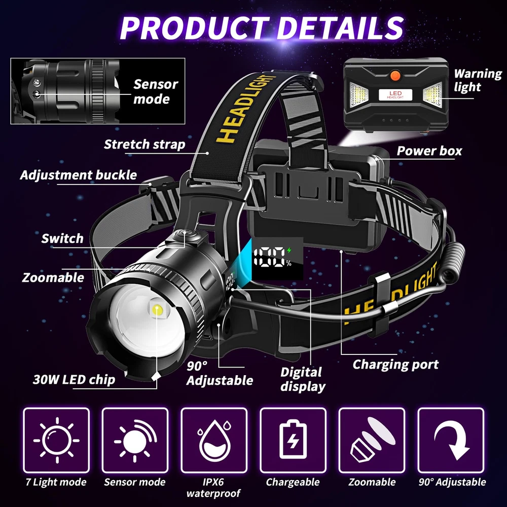 【Super Bright 100000 Lumens】 Illuminate your path with up to 100000 lumens of bright light from a 30W led headlamp, Distance max up to 500 meters/1640ft. illuminating even the darkest corners with ease, ensuring exceptional brightness and reliable performance, It can be used for a wide range of activities, including hiking, camping, fishing, caving, cycling, and various outdoor activities. 【Motion Sensing Headlamps】 Equipped with advanced motion sensors, Long press3-5S on/off switch to active the motion sensor function, Then wave your right hands to control the sensor on/off, providing convenient and efficient lighting whenever you need it.Perfect for situations where you need illumination but you need to use both hands to do your job. 【7 Lighting Modes Head Lamp】 This headlight offers a wide range of lighting options, including flood light modes (high, low, and strobe), spotlight modes (high, low, and strobe), sensor modes (long press on/off 3-5S), The backlight also have 2 modes: White light, red & blue flash light. Zoomable feature for precise lighting control. 【Upgrade Digital Display & Rechargeable Battery】 To quickly ascertain your current, the headlight's enhanced digital display indicates the remaining power, Equipped with large rechargeable battery capacity, they can continue work 8-12 hours as lower modes, this rechargeable headlamp offers a robust power supply for your outdoor activities. The high-capacity batteries ensure extended usage time, allowing you to focus on your activities without worrying about frequent battery changes. 【IPX6 Waterproof & Elastic Headband】: Designed to withstand extreme weather conditions, this headlamp is built to last. It can withstand lightning, heavy rain, snow, and high temperatures, ensuring normal lighting even in the harshest outdoor days.Designed with comfort in mind, the headlamp comes with an adjustable elastic headband. This headband offers a secure and comfortable fit, allowing you to wear it for extended periods without any discomfort 【90° Adjustable & Ergonomic Design】With its 90° adjustable angle feature, this headlamp allows you to direct the light exactly where you need it. The headlamp's ergonomic design ensures a flush fit on the forehead, providing optimal comfort during prolonged use. Don't worried to headaches or pressure points caused by poorly designed headlamps. you can easily adjust the angle for the perfect lighting position. 【3 Charge Port & Upgraded Aluminum Headlamp】2 charge input and 1 charge output choice, If you're on the go and don't have access to a traditional power source, you can utilize the power bank mode,Head lamp is meticulously crafted with an upgraded design featuring aviation aluminum material. The use of this premium material enhances the overall durability and structural integrity of the headlamp, ensuring it can withstand the demands of your outdoor activities. 【Excellent After-Sales Team】: You will receive the 1X Rechargeable Headlamp, 1X USB Cable, Our LED headlamp with 2-year replacement service and 7*24 hours customer service. If you have any problem with the rechargeable headlamp you received, please contact us and our team will find the best solution for your problem!