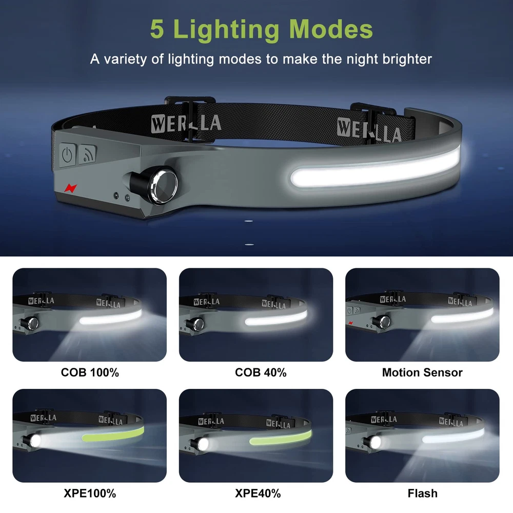 【Bright 230° Wide Beam & Spotlight】Offers high bright COB and XPE spotlights source, this led headlamp rechargeable have an excellent vision at night for walking, running and biking. Without moving your head, illuminate front the desired area with a wider range, to meet the needs of your different scenarios, such as camping, running, cycling, work and maintenance. 【5 Light Modes & Motion Sensor】The headlamps for adults rechargeable has 5 Light Modes, XPE LED: high (100%)/low (40%), COB: high (100%)/low (40%), Strobe: Press and hold mode; Using motion sensor design, you can easily control the headlight even when wearing gloves. When the light is on, short press the sensor key to make it enter the sensor mode (the indicator light changes from red to yellow), and then wave your hand within 10cm before receiving the sensor. Lights on/off. 【ADJUSTABLE COMFORTABLE WEAR】The head flashlight for adults fits all adult head sizes, consists of soft silicone and an adjustable elastic headband, and weighs only 2.47 ounces, even if you wear it all day, you won't feel it. It provides optimal comfort to your head. IPX4 water resistance means it's protected from splashes from all angles, so you don't need to worry if it rains or snows suddenly. 【USB-C convenient charging and long-term use】The head lights led is equipped with a USB-C rechargeable lithium battery and a Type-C USB input port, which can be fully charged for 2 hours. Working time is 3-8 hours in different light modes. If you need to illuminate for a long time, it is recommended to carry two at a time for emergencies. 【Perfect after-sales guarantee】Our outdoor running headlamp have undergone repeated tests and market research to meet the needs of different scenarios, such as outdoor running, mountain climbing, work and maintenance, and have been liked by the market and many customers. We have zero tolerance for quality. If you are not satisfied with the purchased product, please notify us immediately and we will refund you.