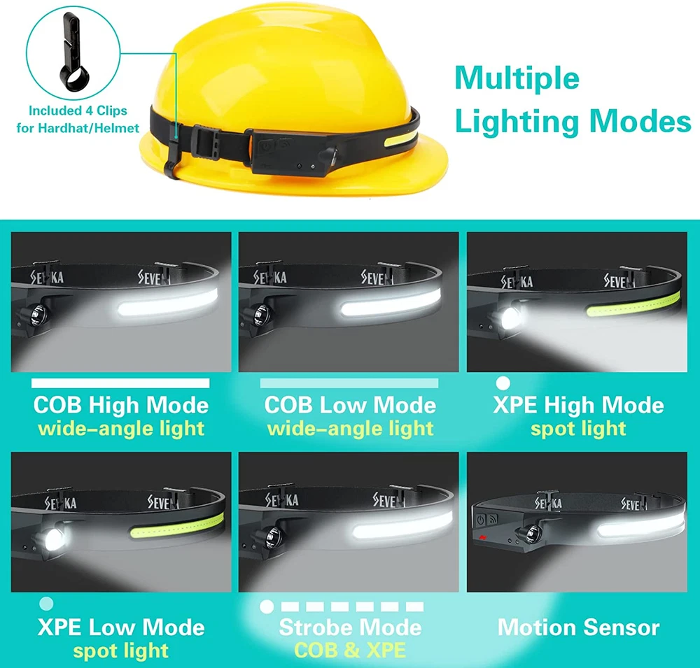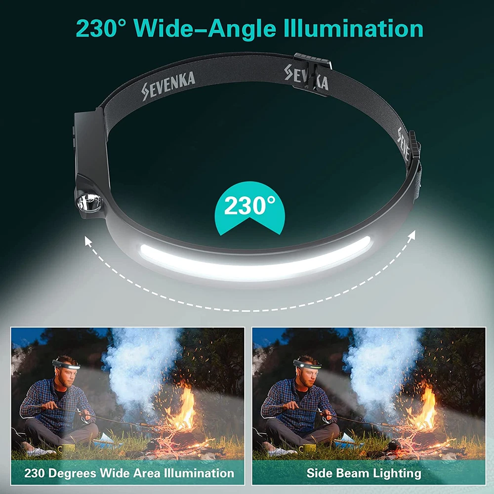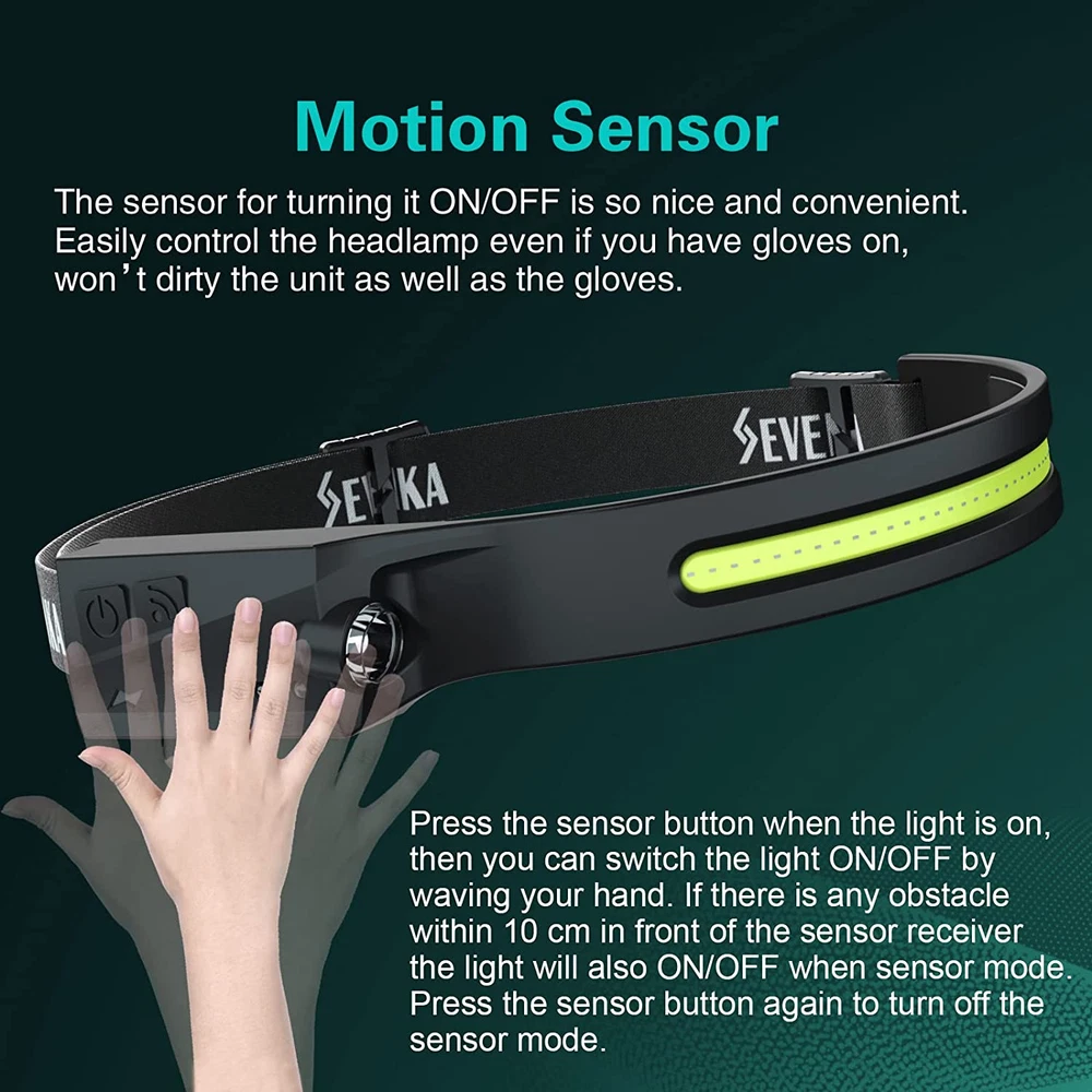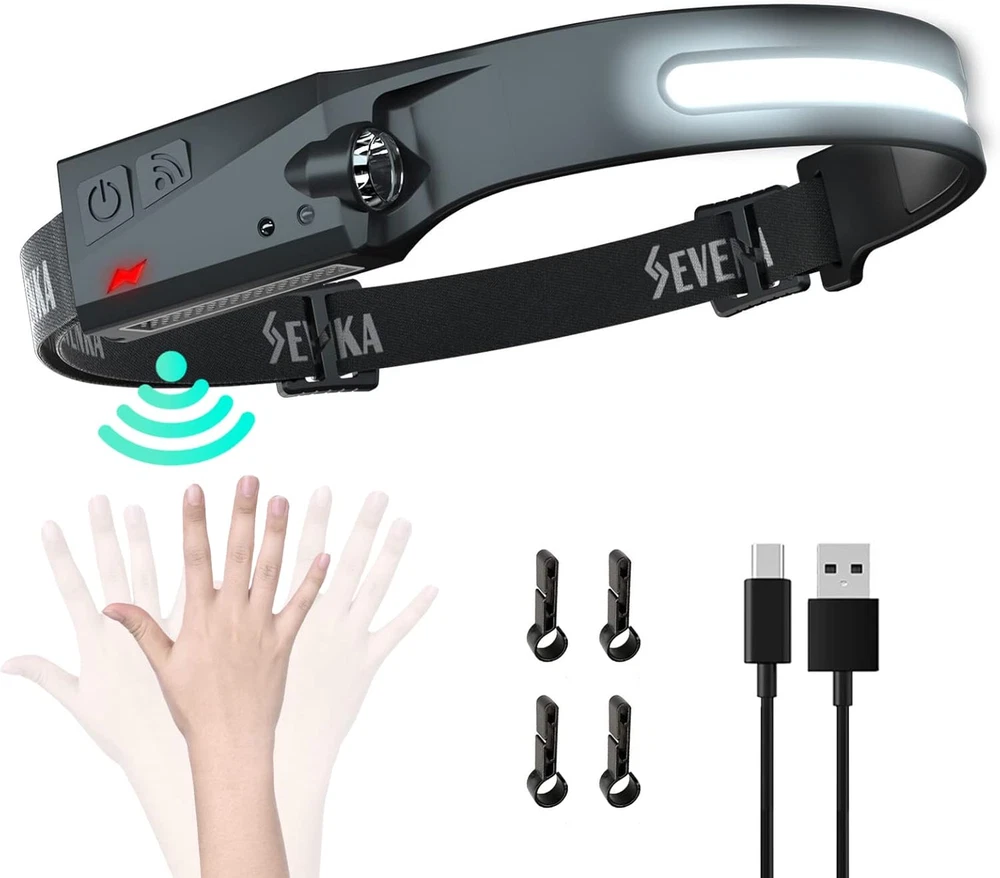 2025 New Year Gift, Spot light & Wide Beam, Headlamp Rechargeable: SEVENKA broad beam headlamp offers a 230° wide-angle illumination instead of lighting up only a small area in front of you, ensures you see everything that needs to be seen. You can also use its spot light to focus on some spot and see farther. Great gear/backup for your home, car or boat or when electricity is not supplied because of hurricane or snowfall. Ideal for distance or hands-on work, gift for outside adventure 【Motion Sensor & Hand-Free Light】This rechargeable induction headlamp designed with motion sensor mode, easily control the headlamp even if you have gloves on, won’t dirty the unit as well as the gloves. When light is on, you can short press sensor button and make it as sensor mode (Indicator light turns yellow from red.) Then you can turn light on/off by waving hand within 10cm in front of sensor reception. While it is on sensor mode, you can also change light mode by pressing power button 【Multiple Light Modes & Lightweight】SEVENKA comfortable headband light only weighs 2.47oz/70g with built-in 1200mAh lithium battery. You'll feel nothing even wearing it all day. Short press power button 5 times to cycle through COB high/COB low/Spot light high/Spot light low mode/OFF. Long press power button while light is on, it can turn as SOS strobe light for emergency situation. Adjustable headbands fit for adults or kids, and it is provided to make your head get the best comfortable condition 【Included Hardhat Clips & Durable Elastic Headband】With water resistant function, LED headlamps are built to last and protected against heavy rain or snow. Whenever you wear headlamp outdoors, you wouldn't need to worry if it rains unexpectedly. Suitable for camping, riding, running, night walking, mountaineering, fishing, hunting, reading, car repairing, DIY works or emergency situation like fire, hurricane, storm, power outage. Included headlamp clips for narrow-edged hardhat, helmet 【Adjustable & Easy to use】Adjustable strap is provided to make your head get the best comfortable condition, fit most hardhat and helmets. Package includes 1 head lamp with 1 USB-C charging cable and hardhat headlamp clamps. You'll love our SENVENKA COB headlamp and the fact that every headlight is individually tested, so you can be sure it will arrive in good working condition. ⚠️Note: Please charge it before use. Floodlight & spot light can not be on simultaneously 【Small Pocket Size & Outdoor Gears】Portable indoor/outdoor light with widespread & focused light can be stored in pocket, bag, ideal light source for exercising or working in low-light conditions, good mechanic tool, camping accessories, hurricane supplies, survival kits, night jogging hiking essentials Product Description Birthday Gift Pocket size as camping gear essentials, hurricane supplies, and survival kits. A great gift for friends, dad, husband, man, mum, wife, woman, kids, adults, student, outdoor enthusiasts, postman, delivery, mechanic, courier, carrier, tow truck driver, employee... Adjustable Headband & Lightweight A flexible and durable strip lens results in a low-profile design. Weighing only 2.47oz/70g with built-in 1200mAh li-ion battery, our headlights are so ultra-lightweight and comfortable, you will forget that you’re wearing it. Note: Please fully recharge the headlamp before use. Do not support USB-C to USB-C PD charger! Sensor Mode Turn on the sensor switch when the headlamp is on. Once it is on sensor mode,(indicator light turns yellow from red) you can turn light on/off by waving hand within 10cm in front of sensor reception. While it is on sensor mode, you can also change light mode by short pressing power button for a few times. Press the sensor button again to turn off the sensor mode. Note: Spot & flood light can not be on at the same time. USB-C Rechargeable & Headlamp Clips Included With included short usb-c charging cable, built-in 1200mAh lithium battery can be fully charged in 2 hours quicker and safer. Easily mount head lamp on narrow-edged hardhat or helmet. Secure the headlights to the helmet or hard hat and ensure that headlights do not fall down. Note: Please usb included usb-a to usb-c cable to charge it before use. 230° Wide -angle Illumination Offers a 230° wide-angle illumination instead of lighting up only a small area in front of you. The broad beam ensures you see everything that needs to be seen. Bright enough no matter indoors or outdoors. With this excellent headlamp, you will feel an unprecedented sense of security in the dark. Long Distance Spot Light Designed with one extra bright spot light which can provide an illumination distance of about 100m. It is protected against splashing water from all angles. Whenever you wear the camping headlamp outdoors, you don't need to worry if it rains or snow unexpectedly. Multiple Light Mode & Easy to Use Short press power button to cycle through COB High/COB Low/Spot Light High/Spot Light Low/OFF. Long press turn on SOS strobe mode for emergency situation when the light is on. Click the sensor button to switch the light ON/OFF by waving your hand within 10 cm from the sensor receiver. Press the sensor button again to turn off the sensor mode.