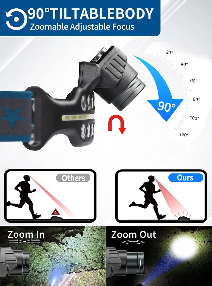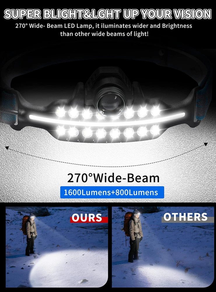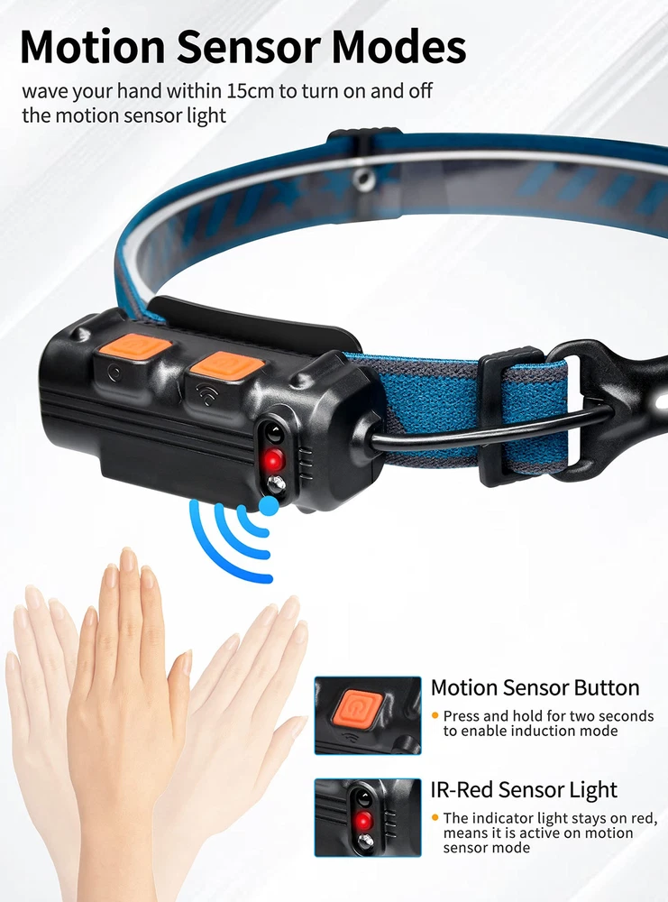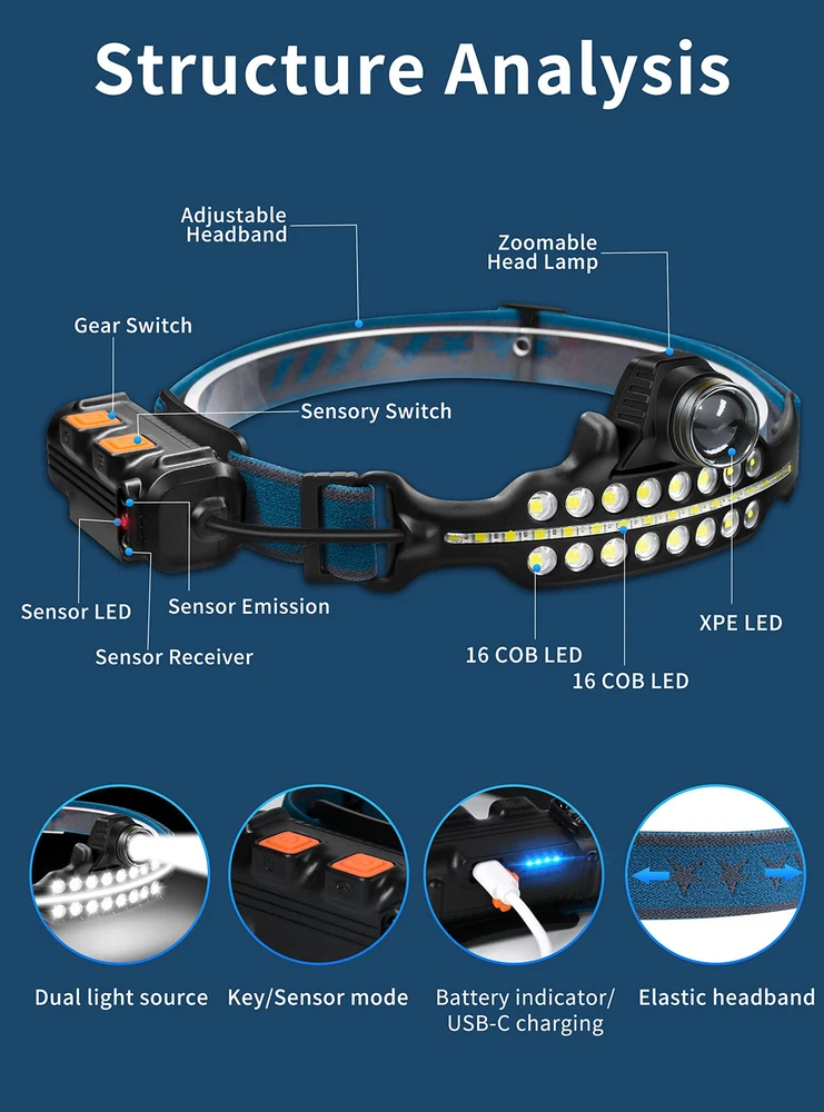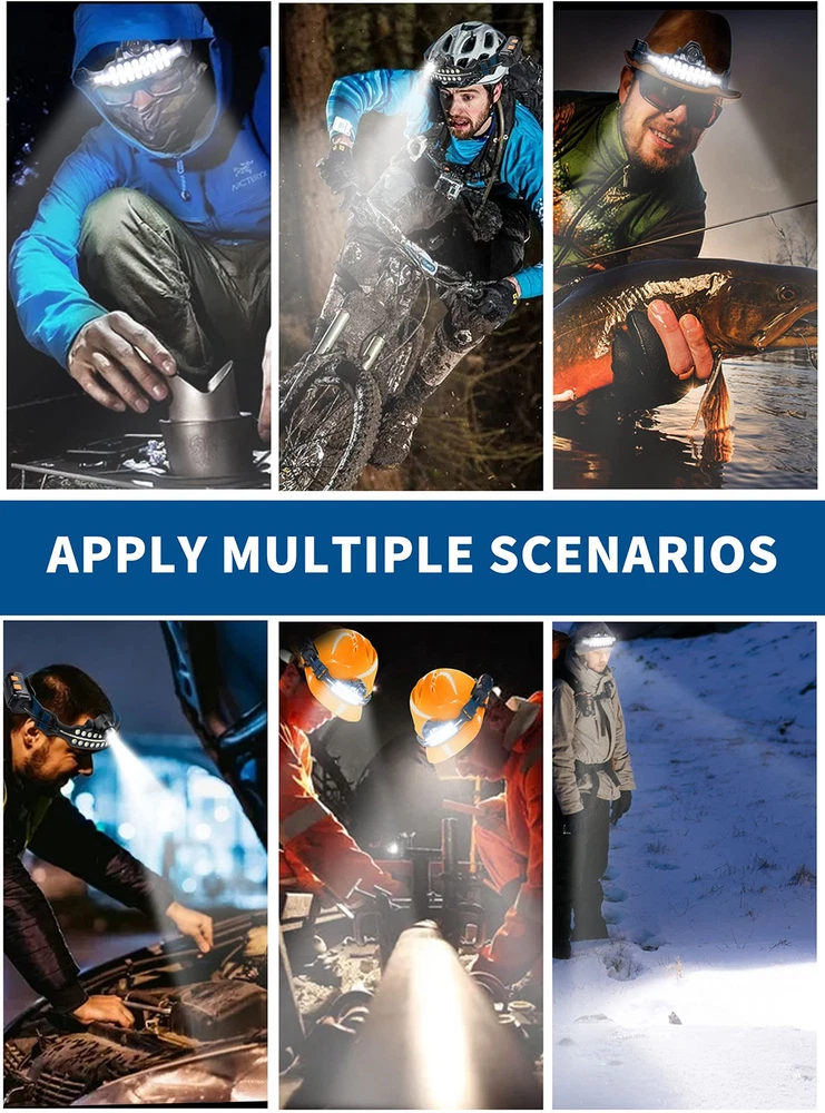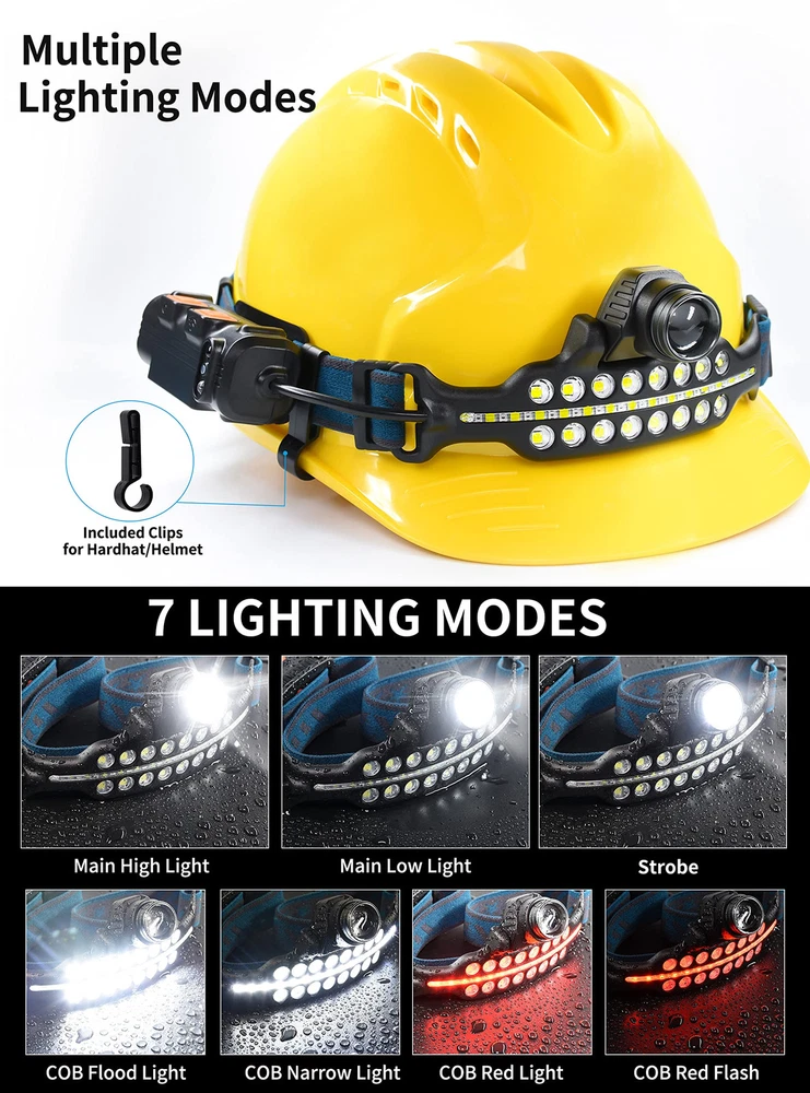 ✚【UPGRADED DUAL LIGHT SOURCES】- This rechargeable headlight has undergone upgrades to provide a combination of direct and 270º wide light. With a 90º swivel ability, you can rotate it to shine in any direction you desire! The upgraded zoomable XPG+32 COB LED ensures a longer range and brighter light. The motion sensor and power indicating settings cater perfectly to your needs, making it ideal for camping (800-1600 lumen COB-light), fishing & on emergency (red-light). ✚【MOTION SENSOR & 7 LIGHTING MODES】- The LED Headlamp features 7 working modes: 3 main light modes [high/low/strobe] + 4 COB Modes: White light [flood/narrow], Red light [strong/flash]. Simply wave your hand within 15cm to effortlessly power ON/OFF the light. The main zoomable light illuminates distant areas and the COB floodlight ensures a wide-angle coverage of 270°, perfect for repairing, camping, running, cycling, dogwalking, reading, and other outdoor recreational pursuits. ✚【EASY USB-C RECHARGING】- Say goodbye to the hassle of replacing batteries with this convenient USB-C rechargeable headlamp. Powered by a built-in 2400mAh (real measured data) rechargeable battery, simply connect the headlamp to any USB-C port for easy recharging. Even if you misplace the charging cable, it can be easily replaced with any other USB-C cable. Keep track of your battery life with the 4-level power display, so you know when it's time to recharge. ✚【LIGHTWEIGHT & ADJUSTABLE ANGLE】- This high lumen head flashlight is lightweight and won't make the wearer feel heavy, making it perfect for long-term use. It comes with a high-quality headband that is high-elastic, adjustable, breathable, and sweat-absorbing, suitable for people with different head sizes. It provides comfortable wear throughout usage. The 90° angle adjustment allows for easy control of the illumination angle, enabling you to light up exactly where you need it. ✚【IPX4 WATERPROOF & WIDELY USED】- The IPX4 waterproof camping headlight adopts high-quality shell materials and an upgraded leak-proof design, suitable for use in rainy and snowy weather. Additionally, it can serve as excellent emergency equipment for your home, car, or boat in situations where power is not available due to a hurricane or snowfall.【Worry-free Service】--- Please contact promptly if you need any assistance. We will respond within 24 hours with a satisfying solution.