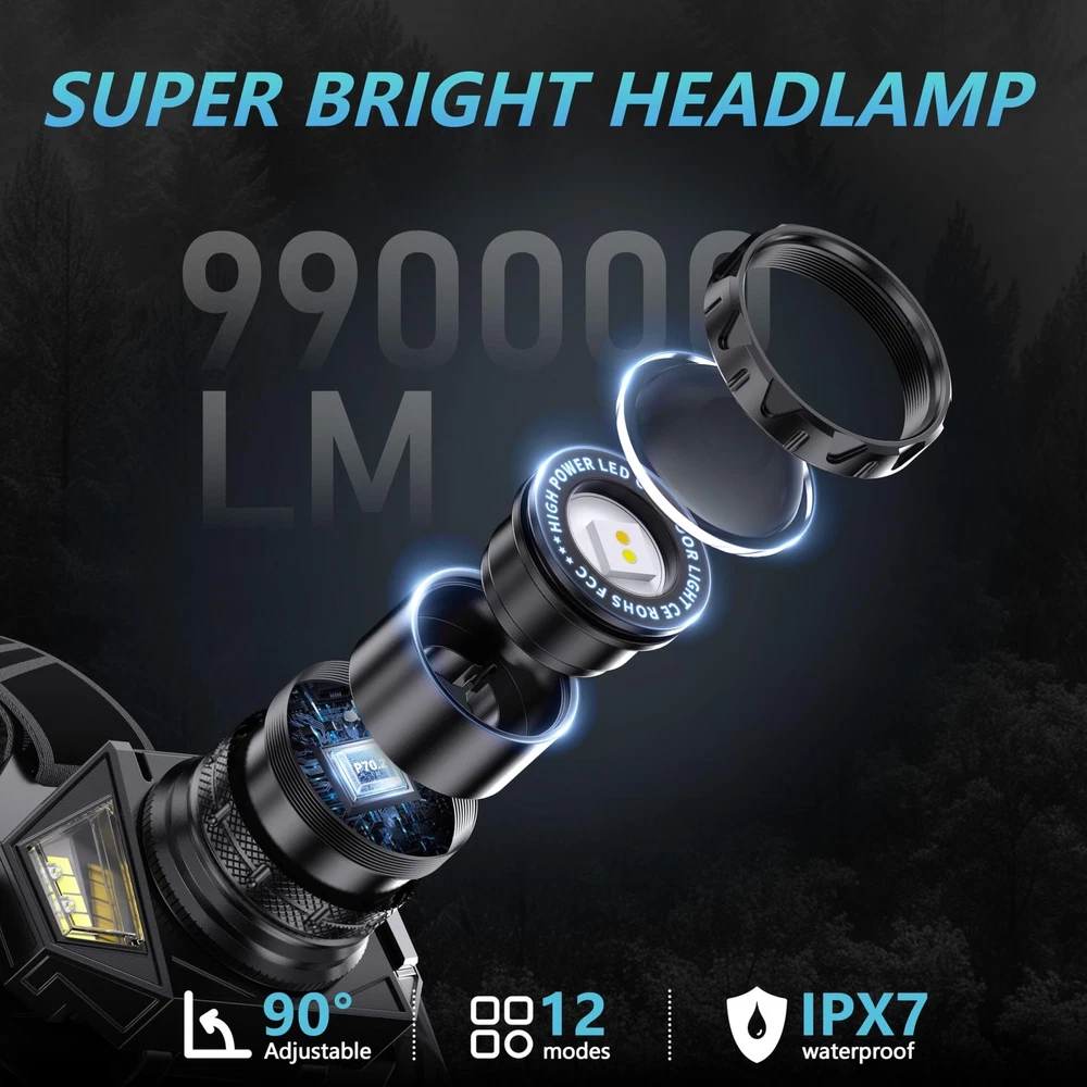 LED Headlamp Rechargeable,990000 Lumens Head Lamp with 12 Modes & 60H Lon