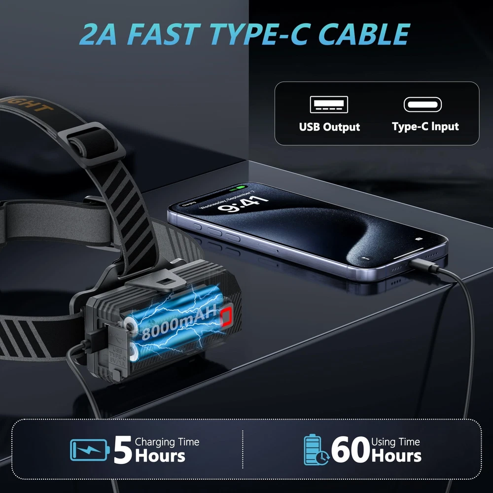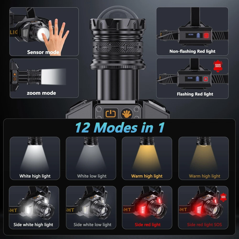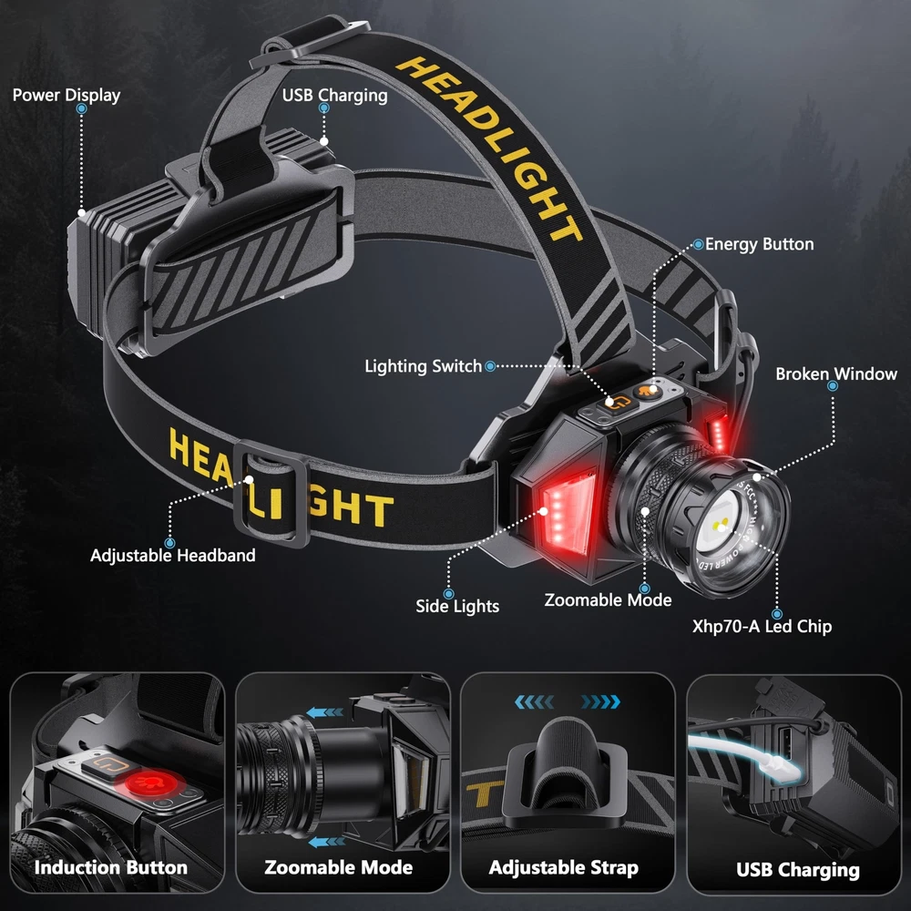 LED Headlamp Rechargeable,990000 Lumens Head Lamp with 12 Modes & 60H Long Battery Life & Motion Sensor & IPX7 Waterproof,90° Adjustable Headlight for Outdoor Camping,Cycling,Hiking Product Details Special Feature: 990000 LM Super Bright & 6000mAh High Capacity Rechargeable Battery, 12 Functions In 1 Headlamp Rechargeable & Type-C Charging, Adjustable Headband & IPX7 Waterproof & All Angles Head Lamp See more Color: Black Power Source: Battery Powered Light Source Type: LED Material: Aluminum Product Dimensions ‏ : ‎ 2.65 x 2.65 x 2 inches; 14.39 ounces Item model number ‏ : ‎ HRT-PT0001 Batteries ‏ : ‎ 2 Lithium Ion batteries required. (included) Date First Available ‏ : ‎ September 20, 2024 Manufacturer ‏ : ‎ LJCMN Country of Origin ‏ : ‎ China Customer Reviews: 4.6 4.6 out of 5 stars 38 ratings Special Feature: ‎990000 LM Super Bright & 6000mAh High Capacity Rechargeable Battery, 12 Functions In 1 Headlamp Rechargeable & Type-C Charging, Adjustable Headband & IPX7 Waterproof & All Angles Head Lamp Color: ‎Black Power Source: ‎Battery Powered Light Source Type: ‎LED Material: ‎Aluminum White Brightness: ‎990000 Lumens Included Components: ‎2* 3000mAh Rechargeable Battery, 1 * User's Guide, 1 * Thickened Box, 1* Type-C Charging Cable, 1* LED Headlamp Product Dimensions: ‎2.65"D x 2.65"W x 2"H Light Path Distance: ‎4.9E+3 Feet Battery Cell Composition: ‎Lithium Ion Number of Batteries: ‎2 Lithium Ion batteries required. (included) Water Resistance Level: ‎Waterproof Warranty Type: ‎Limited Brand: ‎LJCMN Brightness: ‎990000 Lumen Battery Description: ‎Lithium-Ion Runtime: ‎60 hours Style: ‎Outdoor activities, including camping, fishing, hiking, backpacking, running, camping, night work, teaching, searching, hunting, everyday use Bulb Base: ‎Wedge Finish Type: ‎Anodized Specification Met: ‎True Mounting Type: ‎Head Mount Recommended Uses For Product: ‎Camping, Hiking, Fishing, Running, Night Work, Teaching, Emergencies Manufacturer: ‎LJCMN Age Range (Description): ‎Adults Part Number: ‎WFH-PT0001 Item Weight: ‎14.4 ounces Country of Origin: ‎China Item model number: ‎HRT-PT0001 Batteries: ‎2 Lithium Ion batteries required. (included) Item Package Quantity: ‎1 Finish types: ‎Anodized Special Features: ‎990000 LM Super Bright & 6000mAh High Capacity Rechargeable Battery, 12 Functions In 1 Headlamp Rechargeable & Type-C Charging, Adjustable Headband & IPX7 Waterproof & All Angles Head Lamp Batteries Included?: ‎Yes Batteries Required?: ‎Yes Date First Available: September 20, 2024 Industrial Grade Multifunction HeadlampHeadlamp rechargeable combines the needs of functionality, comfort and fashion, with 990,000 lumens, 12 functions in 1, IPX7 waterproof, 90adjustable, Type-C charging & 6000mAh mobile power supply, high elasticity headband & sponge cushion, dual-button design, power indicator, etc. Head lamp is lighter than regular aluminium metal headlight and is designed for people with specialist functional needs. 990,000LM Darkness Terminator Head lampRechargeable headlamp combines a 2025 XHP-Ultra LED light source with a precision optical design to achieve a high brightness output of 990,000 lumens, with an even light and a range of 4,900 ft / 1,500 metres. Headlamp rechargeable wide range of illumination gives you peace of mind when in the dark, and the powerful penetration ensures you can clearly see obstacles in the distance, making it a must-have for nighttime activities. 12 Modes Rechargeable headlampHead lights for forehead rechargeable include sensor mode, white high light white low light, warm high light, warm high light, side white high light, side white low light, side red light, side red light sos, tail warning light, tail warning light flashing, zoom mode. LED headlight for head yellow light penetrates better and is more suitable for foggy environment. Red light is able to send out warning signals in low visibility weather to reduce the risk of collision. Lighting Up The World from 360 90 LED headlamp and the assistance of side lamps can illuminate the surroundings in all directions, reduce the blind spot of illumination, improve the practicality of the product. Head lamp high elasticity and breathable headband specially designed for the head circumference of Americans, and the increase of the sponge cushion on the forehead to enhance the comfort of the product. Type-C Charging & 60H Long BatteryHead lamps led rechargeable super bright has Type-C charging and USB output, which can be fully charged in 3-5 hours. 6000mAh headlamp battery powered can be used for 60 hours at low, and could be used as mobile power to charge phones and other devices. Compared with ordinary head lamps, headlamps battery life has been increased by 50%, many users have commented that it lasts longer than expected, which makes them feel more trustworthy in night adventures. IPX7 Guardian of Wet EnvironmentsHeadlight for head shell is covered with a professional waterproof coating, the charging port is designed with a waterproof and breathable membrane, which prevents water from entering and maintains internal air circulation to avoid damage to the internal components, which is suitable for camping, work, hiking, running, riding, hunting, fishing, dog walking, emergencies, and garage work head lamps. 10 Years of Trusted Product ServiceLJCMN flagship shop has several offline direct shops, dedicated to become a high quality practical head light brand, this product will be provided with 1 * head lamp, 1 * Type-C charging cable, 2 * 3000mAh rechargeable batteries, 1 * user's guide, 1 * box, we have excellent customer support and 10 years replacement warranty, welcome to shop with us.