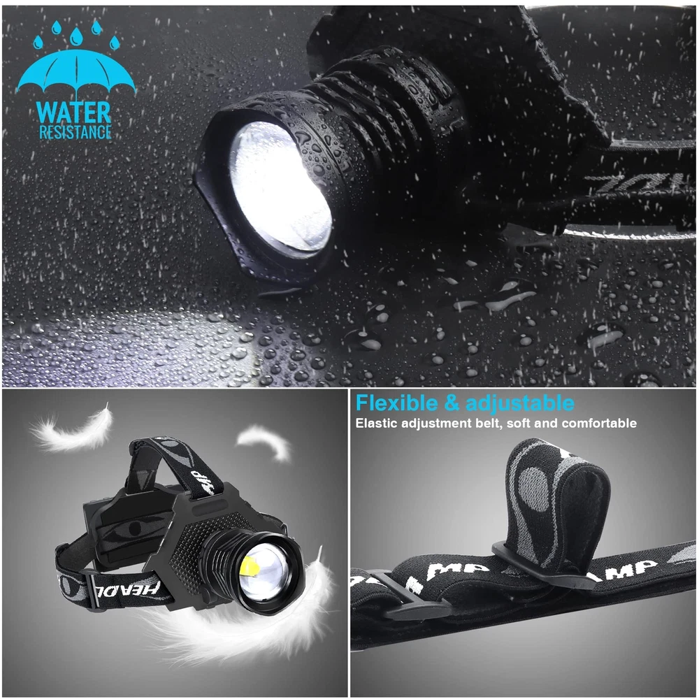 【Super Bright Headlamps】: Super bright headlamp use upgraded XHP70 LED bulbs to shine stronger, brighter, and longer than you ever thought possible. Provides max 90000 Lumens of brightness max up to 800 meter/2624ft . It is penetrating strong, good capacitor, bright for all sorts of activities at night 【Zoomable & 5 Lights Modes 】: High lumens headlamps with 5 lighting modes: Strong / Medium / Low / Flash / SOS, Zoomable headlamp to achieve zoom light, Rechargeable headlamp can emit large area of floodlights or spotlights. It is safe, reliable and easy to use, it is the perfect flashlight for camping, climbing, hiking, hunting, exploring 【 USB Charging & IPX6 Waterpoof】: Headlamps flashlights come in a premium aluminum casing and plastic, light and stable in use. Equipped with 3* rechargeable batteries and Mrico input port & USB Output charge, Working time up to 10 hours of light on low. With shock-proof, the IPX6 waterproof headlamp is suitable for inclement weather conditions 【Adjustable 90° & Comfortable】: Rechargeable lamp head can be rotated 90° and tightly fixed to avoid shaking and sliding when running. Suitable for running an adjustable ergonomically designed elastic headband, resulting in a secure yet comfortable fit for long-wearing sessions 【Life-Time Guarantee 】: Package content include: Rechargeable LED headlamp X1, Rechargeable Batteries X3, USB cable X1, Our 2 years of replacement service and 7*24-hour customer service. If you receive a defective product, Let us know and we will immediately send you a replacement 【USB Output, Long Lasting Headlamp】: Bright headlamp led high lumens with large capacity to rechargeable over 1000 times, headlamp lifespan of up to 100000 hours, when open the light max up distance to 1640ft .Rechargeable headlamp with usb output design could be as an emergency power supply for smartphone, PC, or other devices for charge it 【Zoomable Headlamp, Flooding and Spotlight】Flashlights headlamp with retracte and zoom function. Pull the power headlamp head to switch spotlight mode and pull back the head to switch to floodlight mode. Spotlight mode is suitable for long distance lighting, floodlight mode will more suitable for wide range lighting 【Power Indicator】: Rechargeable head lamp with 4 power indicator lamps, so you can see the power at a glance, and always know how much electricity and charge you have (100%, 75%, 50%, 25% )