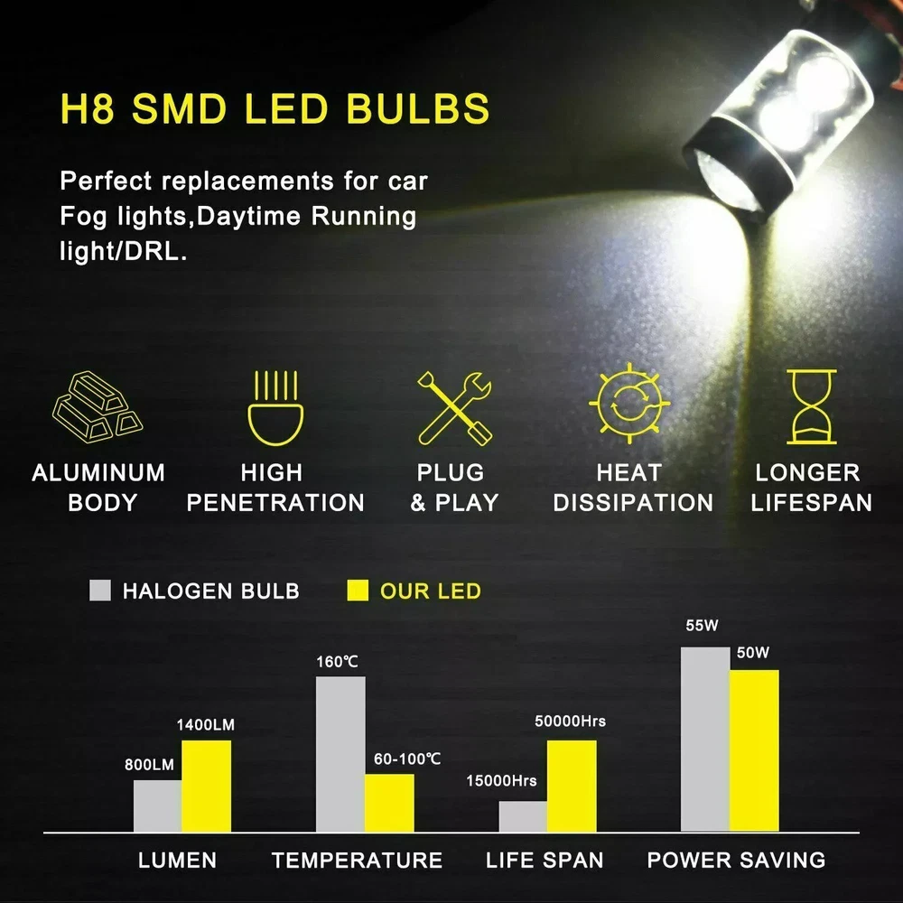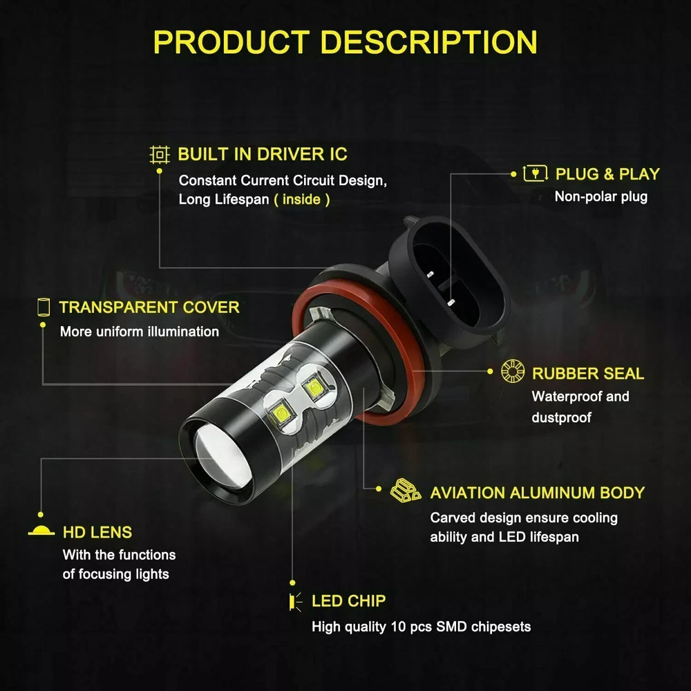 This package includes 9005 High Beam Headlight + H11 Low Beam Headlight + H11 Fog Light Bulbs. LED Headlights Bulbs: 9005/H11 LED replacement bulbs are engineered for superior performance, exceptional looks, and increased safety. Especially designed for upgrading the Headlight bulb Bulb Size: 9005(=HB3), H11(=H8) Beam Type: High Beam / Low Beam Color Temperature: 6000K - White Wattage: 50W Lumens: 5500LM Working Voltage: DC 9V to 36V Waterproof Level: IP68 Material: Aluminum alloy Lifespan: > 50,000 Hours Product Advantages: High brightness: The latest cob with 6000K cool white LED chip; 300% brighter than the existing halogen headlights. Advanced technology ensures perfect beam patterns without any black spots. Glow on all sides: 360 degree no dead angle lighting, use more clear and bright at night Strong heat dissipation: equipped with highly silent heat dissipation fan, speed up to 12000/min, heat dissipation efficiency, can avoid temperature accumulation on the beads, prolong the service life of the beads. IP68 waterproof: using integrated radiator and aluminium body self-cooling, waterproof and heat-proof. Even in extreme cases, the enclosure of the rainproof driver can work properly. Automatic short circuit protection. Simple Installation: Installation only takes 10 minutes. No relay. There is no capacitor. No additional wiring. Plug and play. LED Fog Lights Bulbs : Bulb Size: H11(=H8) Voltage: DC 9V to 36V Color Temperature: 6000K Wattage: 50W Lumens: 5500LM Color: White Lifespan: >50, 000 hrs This new product has high luminous efficiency, low power consumption and long service life. Easy installation, Direct plug in and play. Best used for Fog/ Driving lights/ Daytime Running Light DRL Faster on/ off response time Energy saving, environmental protection, Stable performance, through strict test, Use safer driving Why Use LED Headlight Bulb? If you find this listing, you are must looking for brighter white headlight bulbs with an excellent beam pattern for upgrade. Congratulations, you find what you want now! LED headlight bulbs is a successful replacement for Halogen bulbs, it is brighter and more reliable, perfect for high-beam (and also low beam, fog, & driving lights) use. With it, you will get much better night driving, and also, much better seen during the day. Package Included: 2 x LED High Beam Bulbs 2 x LED Low Beam Bulbs 2 x LED Fog Light Bulbs New and old packaging will be shipped randomly!! Install Caution 1. As a safety precaution, make sure that the car has had time to cool down properly before starting the installation process. 2. Put the vehicle into park or make sure it is securely in gear. 3. Make sure to have the ignition turned off and the keys removed. 4. Be careful to avoid burns, especially when turning on or off the vehicles lighting. 5. Be careful to avoid crushing or cutting the bulbs. Also make sure to not touch the bulbs with your fingers, as this will cause blotting. 6. Fully examine the connection of the contact points, ports and the wires as faulty connections can cause lighting problems. 7. Make certain that the end of the bulb does not come in contact with the interior light shield of the headlight when adjusting the bulb. 8. Please install car headlight dust cover to ensure the normal operation of the lamp (to prevent dust and small ribbons to reduce the chances of bulb cooling fan broken to ensure the normal operation of the cooling system) Note After installation, dust prevention measures must be done, LED lamp life depends on the cooling performance is good or bad. The lamp heat mainly active cooling (fan-cooling based, supplemented by the whole aviation aluminum heat dispassion ) as the main cooling method, the life of the fan in lamp bulb directly affects the life of LED lights On Nov 21, 2024 at 02:31:40 PST, seller added the following information: