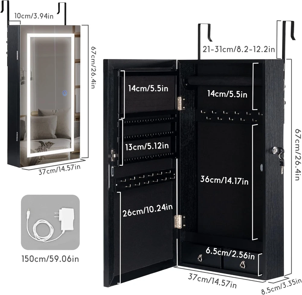 Store New Arrivals Add to Favorite View Feedback Contact Jewelry Armoire with LED Lighted Mirror, Wall/Door Mounted Frameless Mirror with 3 Color Lights, Lockable Jewelry Cabinet Hanging Jewelry Organizer with 2 Drawers - Black Description Item model number WGSSG007-Whi Style Modern Number of Items 1 Country of Origin China Batteries Included? No Jewelry Storage Type Jewelry Armoire Batteries Required? No Number of Compartments 1 Special Feature Jewelry Organizer Product Dimensions 3.35"D x 14.57"W x 26.38"H Material Engineered Wood, Glass Number of Drawers 2 Closure Type Key Lock Item Weight 14.3 pounds Occasion Wedding, Birthday Special Features Jewelry Organizer Target Audience Women Part Number WGSSG007-Bla Mounting Type Wall Mount Color Black Inner Material Engineered Wood Shape Rectangular Recommended Uses For Product Face Makeup 2-in-1 Design - It is not only a jewelry armoire, but also a frameless mirror that brings you a clearer and wider view. It allows you to wear jewelry or check your makeup before going out or attending a party. Chic frameless design adds elegance to your room and helps to make full use of limited space. 3 Color Lights - The LED lights are controlled by the round touch switch. Touch to switch on and press and hold to adjust brightness between cold, natural, and warm light to meet your practical or romantic needs. Lights are powered by an adapter and leave you no worry about changing batteries. Large Storage Space - This jewelry armoire is specially designed for securing and organizing your precious jewels. Comes with 60 earring slots, 30 ear stud holes, 44 ring slots, 24 necklace hooks,1 bracelet bar, 1 interlayer, and 2 small drawers. Fully functional compartments allow you to find what you want in no time. High Quality & Safe - P2 grade material features a smooth, bend-resistant, and a durable MDF surface. Soft velvet lining protects your jewels against scratches and damage. Our jewelry organizer also comes with a lock and keys for stopping naughty kids or pets from messing with your precious jewels. Space-saving Storage - Our jewelry armoire is already assembled. Just install the enclosed hooks on the back of door or on the wall and hang the jewelry organizer up. No sophisticated operations nor large area is required. Chic and stylish design fits very well in your home, bedroom, living room, and entryway decoration, and ensures you a convenient and organized life. Product Description Specifications Material: P2 grade MDF, glass, flannelette Color: black Product Size: 26.4 × 14.57 × 3.9 in Product Weight: 14.3 lbs Package Weight: 17.6 lbs Package Size: 29 × 16.8 × 6.6 in Jewelry Armoire with LED Lighted Mirror A must-have piece for your daily makeup and elegant life! Lavievert jewelry armoire is designed with a frameless full length mirror which features a chic, concise, and elegant look. It not only serves as your practical jewelry organizer, but also adds your room with elegance. From now on you have to worry about neither your messy jewels, nor no place to store all your jewelry. Our jewelry armoire may organize and store all your jewelry together. Best choice to save time and ensure a simple life. You may live a delicate life form now! Fashionable & Stylish Design Cold white, natural, and warm yellow light modes are available. Dedicated compartment design makes it easy to pick out what you want. 2 height options are available to hang on the door and meet varying heights of people. No matter you want it a present to friends or a treat to yourself, it is an ideal choice. Fully Functional Compartments Thanks to the spacious and reasonable partitions, you may sort and store your jewels like professionals. Soft Lining Black velvet lining protects your jewelry against abrasion and scratches. Touch Button Touch the switch button to switch between 3 light colors; touch and hold to do adjustments. Lockable Design Designed with keys and a lock to protect your jewelry against naughty pets and kids. Space-saving You may mount it on the wall or hang it on the door to save space. Ideal for small apartments or bedrooms. Powered by Adapter Unlike batteries, our adaptor is more friendly and features a 59 in long cable. ABOUT US We offer the best prices around on high quality products. Our E-store includes media such as books, movies, music and games while offering electronics, toys, sporting apparel, clothing, tools, general home, garden items and more. SHIPPING We are always working hard to ensure your package arrives as soon as possible. Please understand that some factors like weather, high postal traffic, and the performance of shipping companies are outside of our control. We offer free shipping to the lower 48 states and ship within 2 business days of payment, usually sooner. We do not accept P.O. Boxes. Please provide a physical address. For shipping outside of the continental USA, we only use eBay's Global Shipping Program.The item is shipped to KY and then sent to the rest of the world. International customers are responsible for all duties and taxes. Continue to check out in order to calculate costs for shipping the item to your country. Messages regarding eBay's Global Shipping Program MUST be directed at eBay EXCLUSIVELY. RETURNS We offer a 30-Day Return Policy on items which you are not completely satisfied with. You have the option for a full-refund or an exchange of the item. No returns are available on items shipped outside of the USA. PAYMENT We accept PayPal. CONTACT US This page content is yet to come Please ad us to your favorite seller and visit again later Thank You CUSTOMER SATISFACTION We try our very best to make sure every customer is completely satisfied. If there's a problem, message us! We're happy to help. WE ACCEPT Copyright © 2021 AutoDS. | All Rights Reserved
