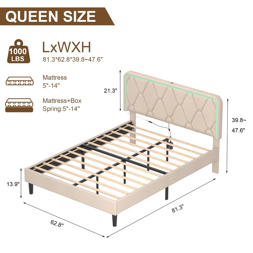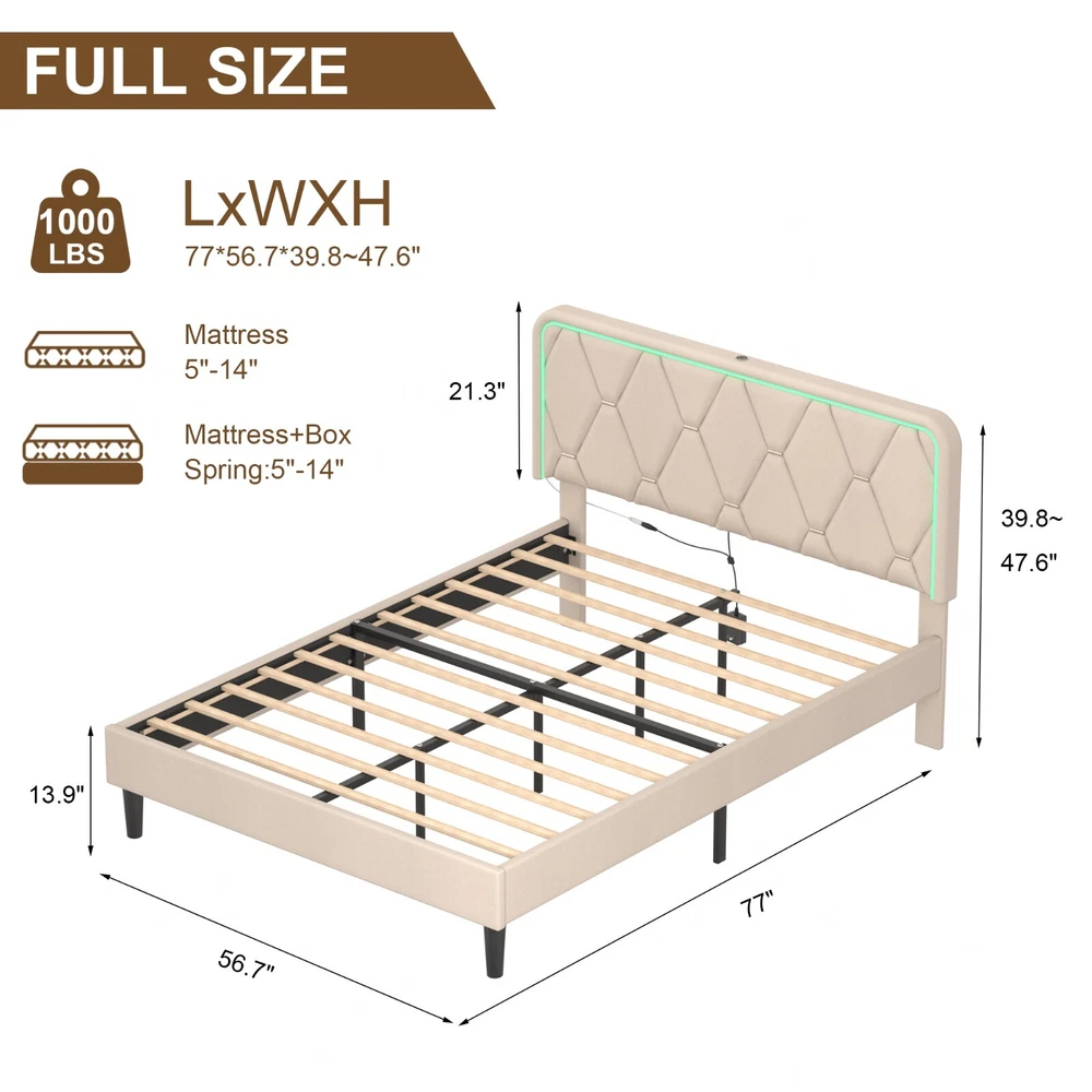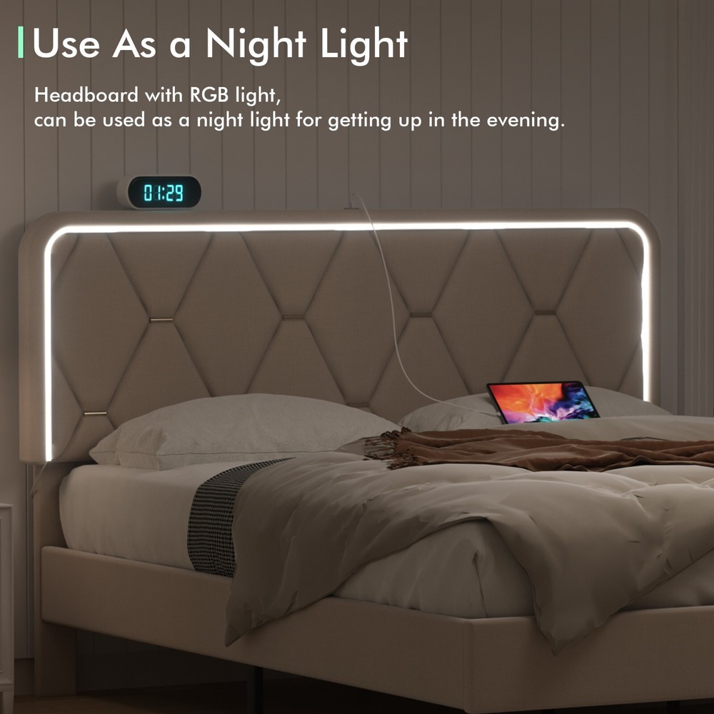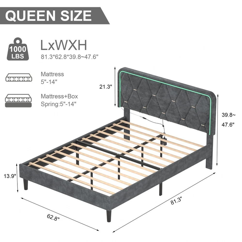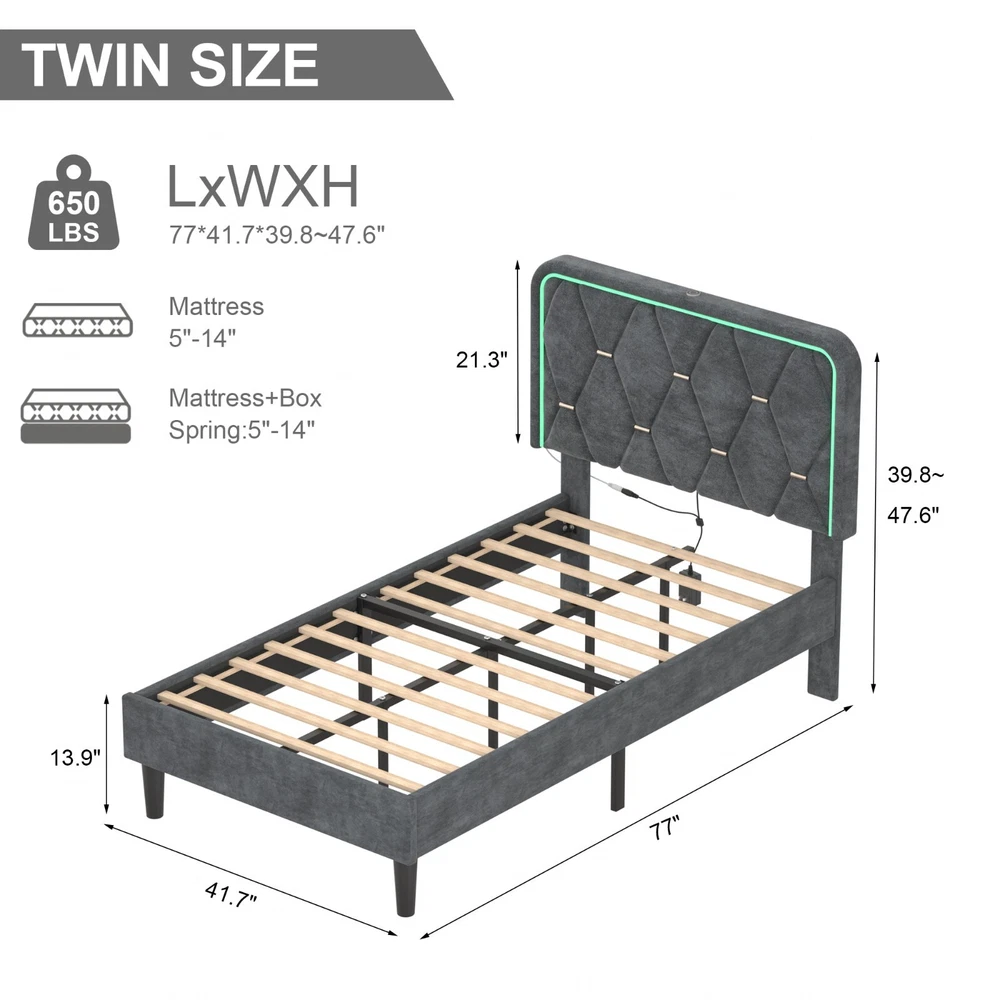 Features 💡Bed Frame with RGB LED Light: This upholstered bed frame supports the headboard RGB LED light. The light supports 12 scene modes, 3 speed level adjustments, and 3 brightness modes. The controller is installed on the headboard, convenient to change the light when you are lying on the bed. 💡 Storage Headboard with Charging Station: The LED bed frame with storage headboard keeps tiny essentials like phones, glasses, and books within easy reach. USB ports and 1 Type-C port keep your electronics at 100% power. 💡 Bed Frame with Height-adjustable Headboard: The headboard height can be adjusted from 39.8 "to 47.6" for 5-14 inch mattresses. The headboard is wrapped in high-quality velvet and filled with a soft and breathable high-stretch memory sponge for a comfortable backrest experience. 💡 Stable Structure & No Box Spring Needed: Sturdy integrated bed frame construction with bolt-on rails, evenly-spaced solid wood slats, and center support legs designed to provide solid support for up to 1000 lbs. No box spring is needed. 💡 Easy to Assemble: Each part of the bed frame is numbered and has a clear manual, no need to worry about installation. If any parts are missing or damaged, please follow the instructions and contact us for a new part or a new one. Specifications of Twin Size: Material: Metal Frame; Wood Slats;MDF; Fabric Overall dimensions: 77"L x 41.7"W x (39.8~47.6)" H Maximum weight capacity: 600 lb Ground clearance: 8'' Twin weight : 57.27 lb (No box spring needed) Specifications of Full Size: Material: Metal Frame; Wood Slats;MDF;Fabric Overall dimensions: 77" L x 56.7"W x (39.8~47.6)"H Maximum weight capacity: 800 lb Ground clearance: 8'' Full weight : 66.08 lb (No box spring needed) Specifications of Queen Size: Material: Metal Frame; Wood Slats;MDF;Fabric Overall dimensions: 81.3" L x 62.8"W x (39.8~47.6)"H Maximum weight capacity: 900 lb Ground clearance: 8'' Queen weight : 74.89 lb (No box spring needed) Packing list: 1 x Bed Frame 1 x Assembling hardware kits 1 x Instructions Note: 1.Please allow ± 1/0.5'' error due to manual measurement. 2.When viewing the color of the product on your monitor, it may differ from the actual color of the item. 3.Mattress, box spring, and bedding (comforter, sheets, pillows, etc.) are NOT included.