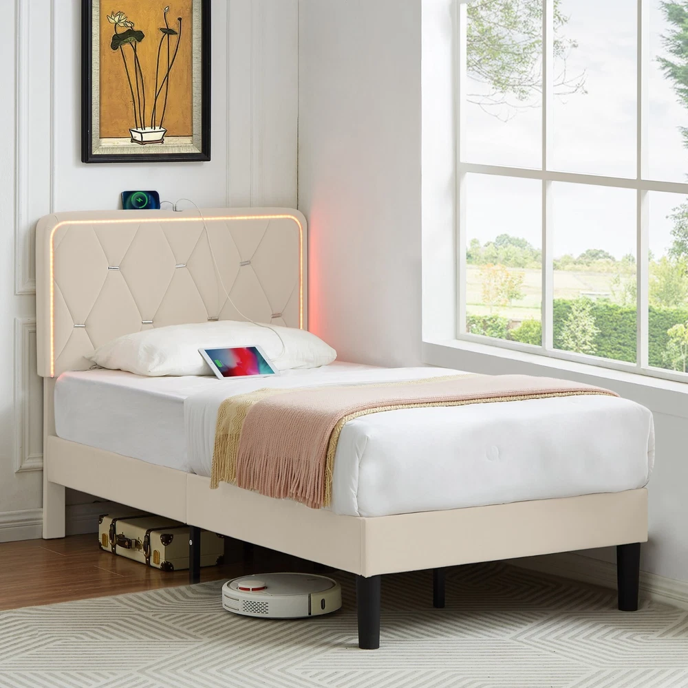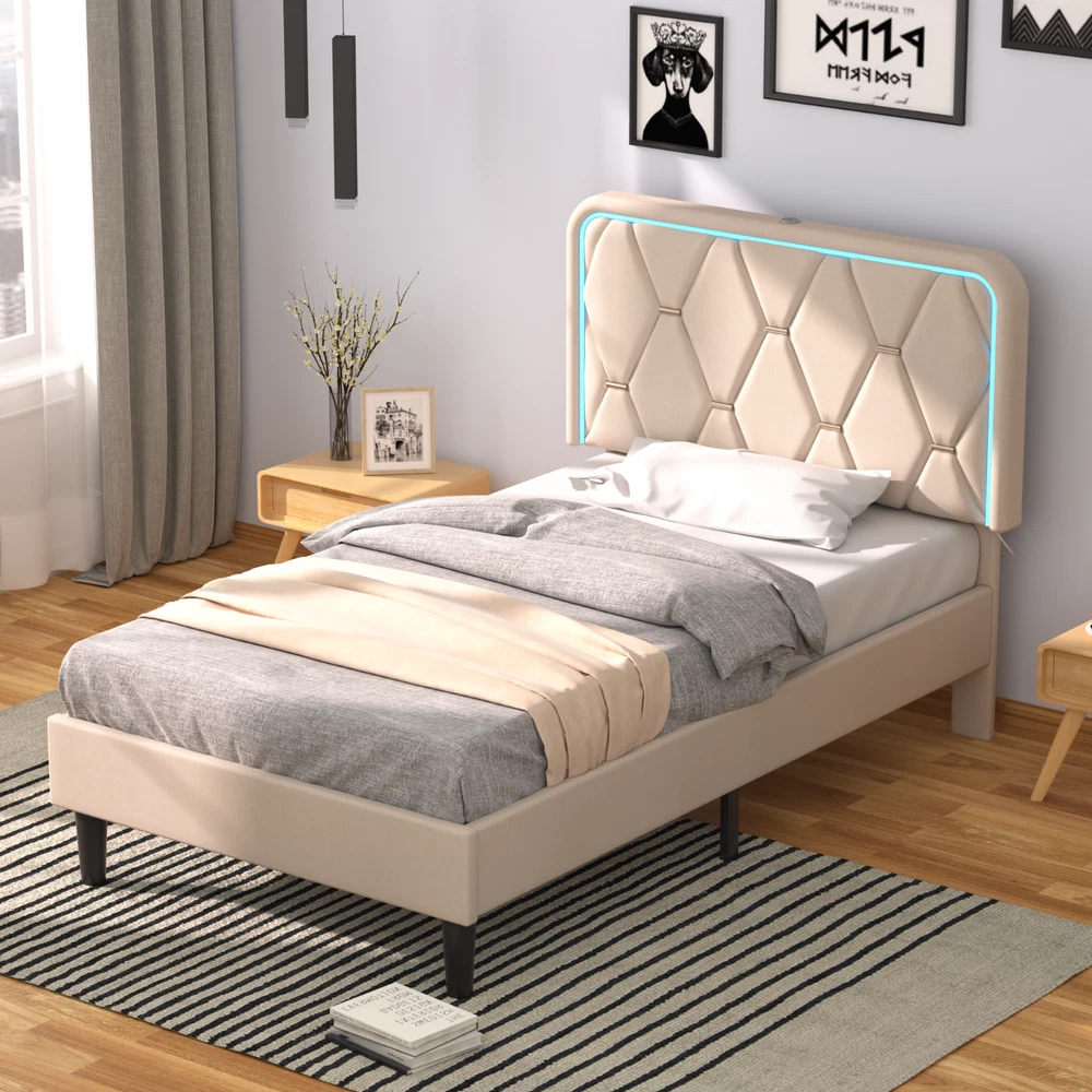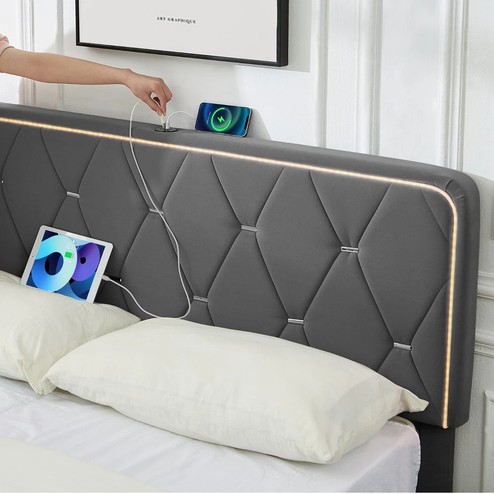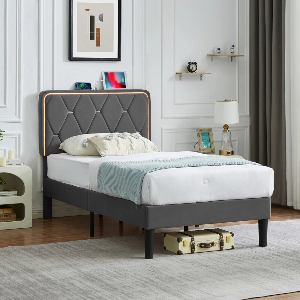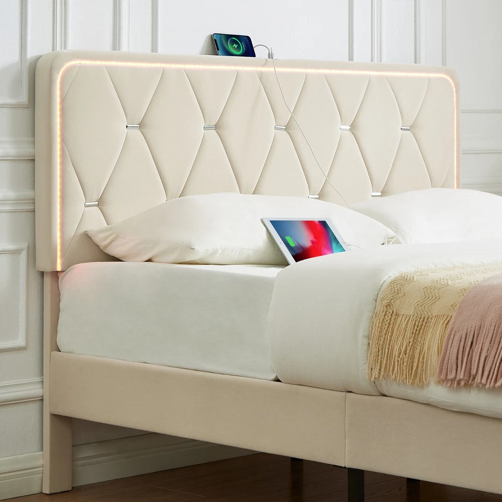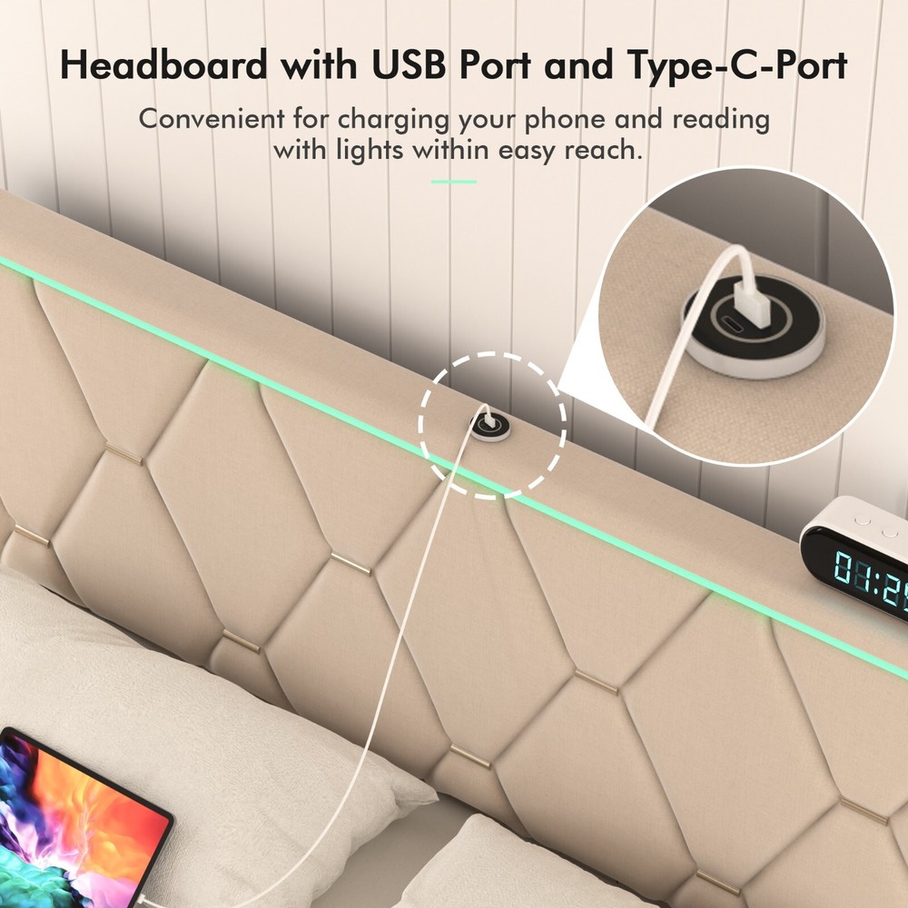 Features 💡Bed Frame with RGB LED Light: This upholstered bed frame supports the headboard RGB LED light. The light supports 12 scene modes, 3 speed level adjustments, and 3 brightness modes. The controller is installed on the headboard, convenient to change the light when you are lying on the bed. 💡 Storage Headboard with Charging Station: The LED bed frame with storage headboard keeps tiny essentials like phones, glasses, and books within easy reach. USB ports and 1 Type-C port keep your electronics at 100% power. 💡 Bed Frame with Height-adjustable Headboard: The headboard height can be adjusted from 39.8 "to 47.6" for 5-14 inch mattresses. The headboard is wrapped in high-quality velvet and filled with a soft and breathable high-stretch memory sponge for a comfortable backrest experience. 💡 Stable Structure & No Box Spring Needed: Sturdy integrated bed frame construction with bolt-on rails, evenly-spaced solid wood slats, and center support legs designed to provide solid support for up to 1000 lbs. No box spring is needed. 💡 Easy to Assemble: Each part of the bed frame is numbered and has a clear manual, no need to worry about installation. If any parts are missing or damaged, please follow the instructions and contact us for a new part or a new one. Specifications of Twin Size: Material: Metal Frame; Wood Slats;MDF; Fabric Overall dimensions: 77"L x 41.7"W x (39.8~47.6)" H Maximum weight capacity: 600 lb Ground clearance: 8'' Twin weight : 57.27 lb (No box spring needed) Specifications of Full Size: Material: Metal Frame; Wood Slats;MDF;Fabric Overall dimensions: 77" L x 56.7"W x (39.8~47.6)"H Maximum weight capacity: 800 lb Ground clearance: 8'' Full weight : 66.08 lb (No box spring needed) Specifications of Queen Size: Material: Metal Frame; Wood Slats;MDF;Fabric Overall dimensions: 81.3" L x 62.8"W x (39.8~47.6)"H Maximum weight capacity: 900 lb Ground clearance: 8'' Queen weight : 74.89 lb (No box spring needed) Packing list: 1 x Bed Frame 1 x Assembling hardware kits 1 x Instructions Note: 1.Please allow ± 1/0.5'' error due to manual measurement. 2.When viewing the color of the product on your monitor, it may differ from the actual color of the item. 3.Mattress, box spring, and bedding (comforter, sheets, pillows, etc.) are NOT included.