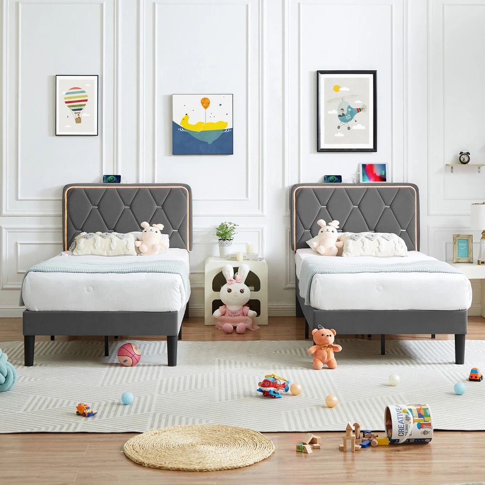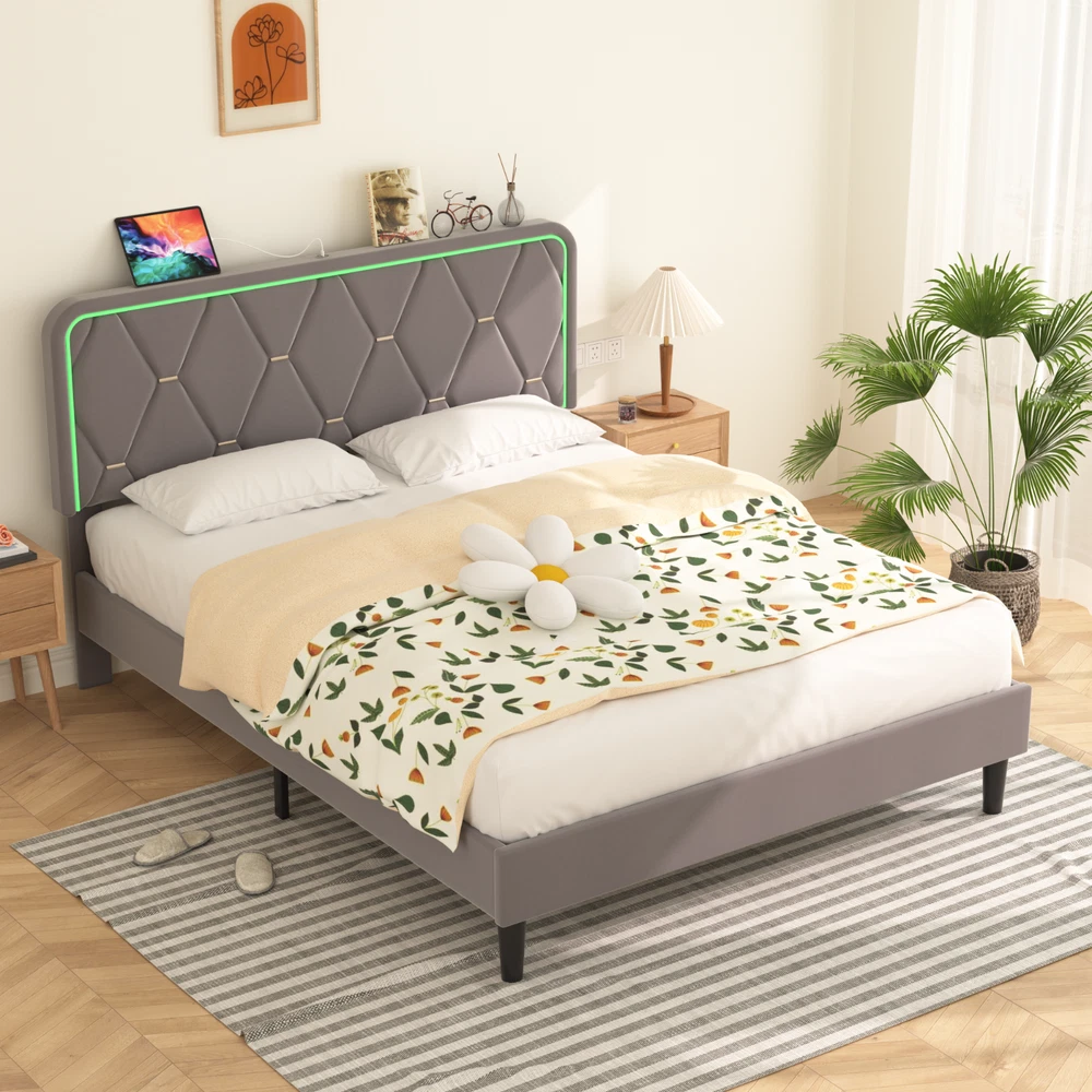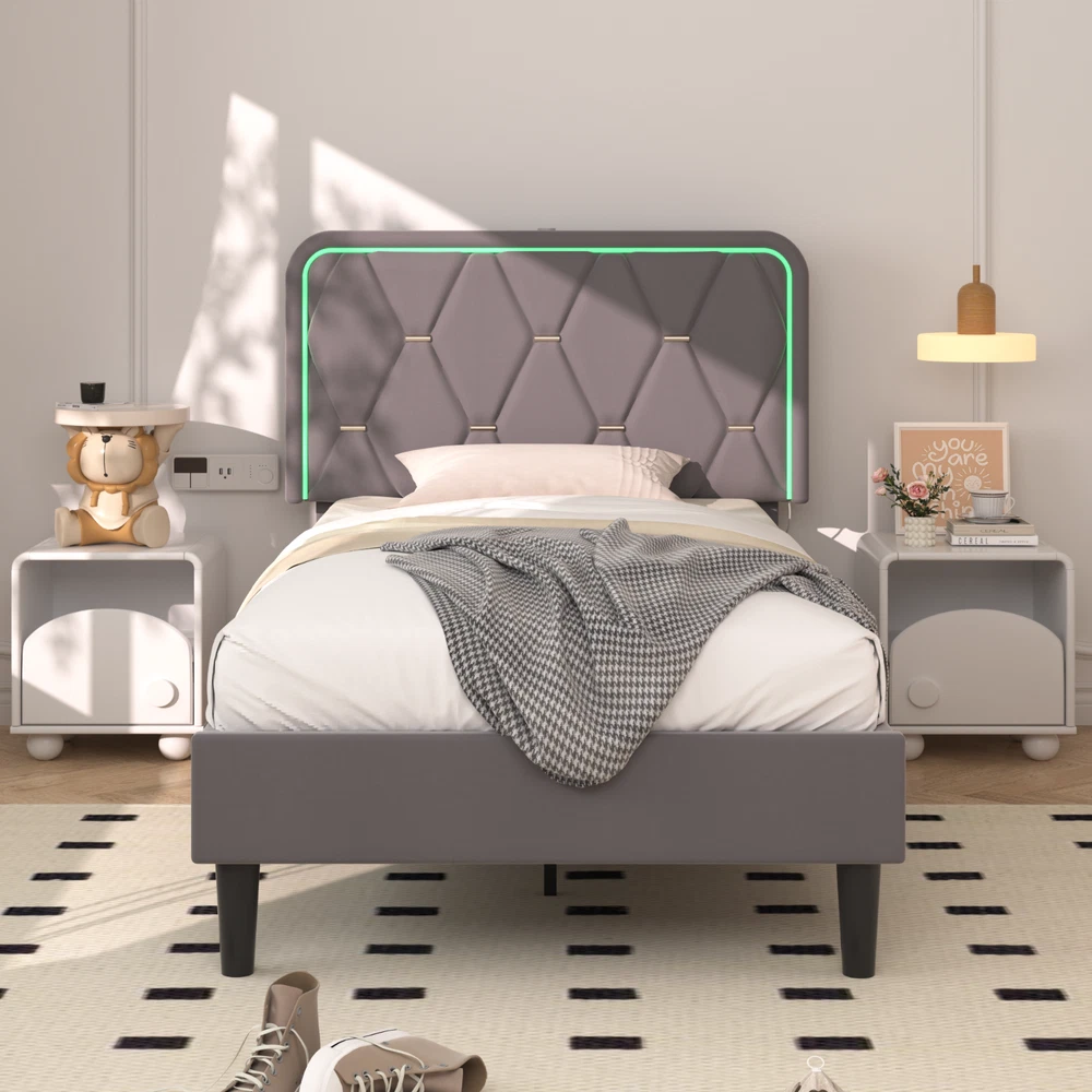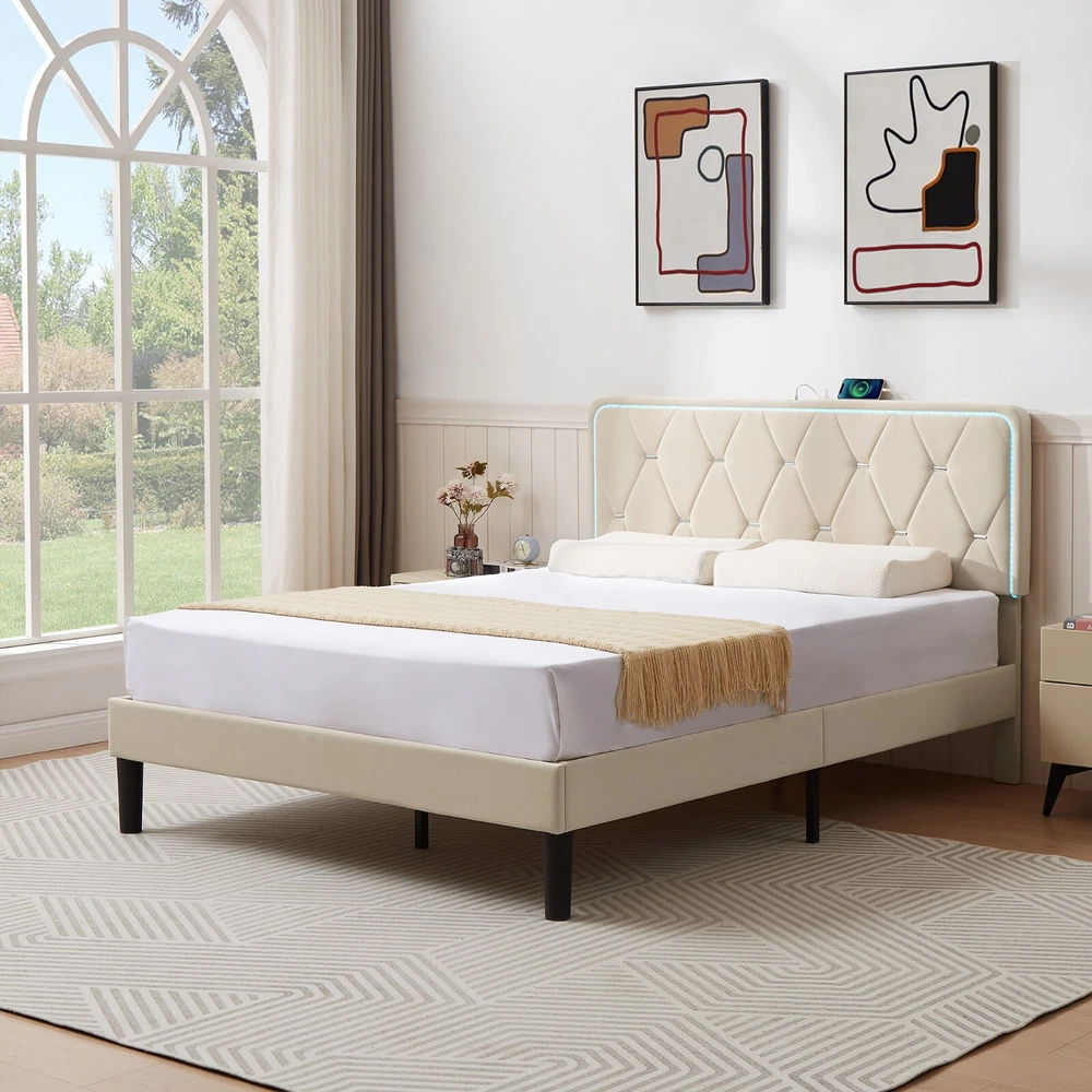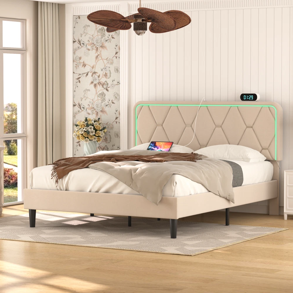 Features 💡Bed Frame with RGB LED Light: This upholstered bed frame supports the headboard RGB LED light. The light supports 12 scene modes, 3 speed level adjustments, and 3 brightness modes. The controller is installed on the headboard, convenient to change the light when you are lying on the bed. 💡 Storage Headboard with Charging Station: The LED bed frame with storage headboard keeps tiny essentials like phones, glasses, and books within easy reach. USB ports and 1 Type-C port keep your electronics at 100% power. 💡 Bed Frame with Height-adjustable Headboard: The headboard height can be adjusted from 39.8 "to 47.6" for 5-14 inch mattresses. The headboard is wrapped in high-quality velvet and filled with a soft and breathable high-stretch memory sponge for a comfortable backrest experience. 💡 Stable Structure & No Box Spring Needed: Sturdy integrated bed frame construction with bolt-on rails, evenly-spaced solid wood slats, and center support legs designed to provide solid support for up to 1000 lbs. No box spring is needed. 💡 Easy to Assemble: Each part of the bed frame is numbered and has a clear manual, no need to worry about installation. If any parts are missing or damaged, please follow the instructions and contact us for a new part or a new one. Specifications of Twin Size: Material: Metal Frame; Wood Slats;MDF; Fabric Overall dimensions: 77"L x 41.7"W x (39.8~47.6)" H Maximum weight capacity: 600 lb Ground clearance: 8'' Twin weight : 57.27 lb (No box spring needed) Specifications of Full Size: Material: Metal Frame; Wood Slats;MDF;Fabric Overall dimensions: 77" L x 56.7"W x (39.8~47.6)"H Maximum weight capacity: 800 lb Ground clearance: 8'' Full weight : 66.08 lb (No box spring needed) Specifications of Queen Size: Material: Metal Frame; Wood Slats;MDF;Fabric Overall dimensions: 81.3" L x 62.8"W x (39.8~47.6)"H Maximum weight capacity: 900 lb Ground clearance: 8'' Queen weight : 74.89 lb (No box spring needed) Packing list: 1 x Bed Frame 1 x Assembling hardware kits 1 x Instructions Note: 1.Please allow ± 1/0.5'' error due to manual measurement. 2.When viewing the color of the product on your monitor, it may differ from the actual color of the item. 3.Mattress, box spring, and bedding (comforter, sheets, pillows, etc.) are NOT included.