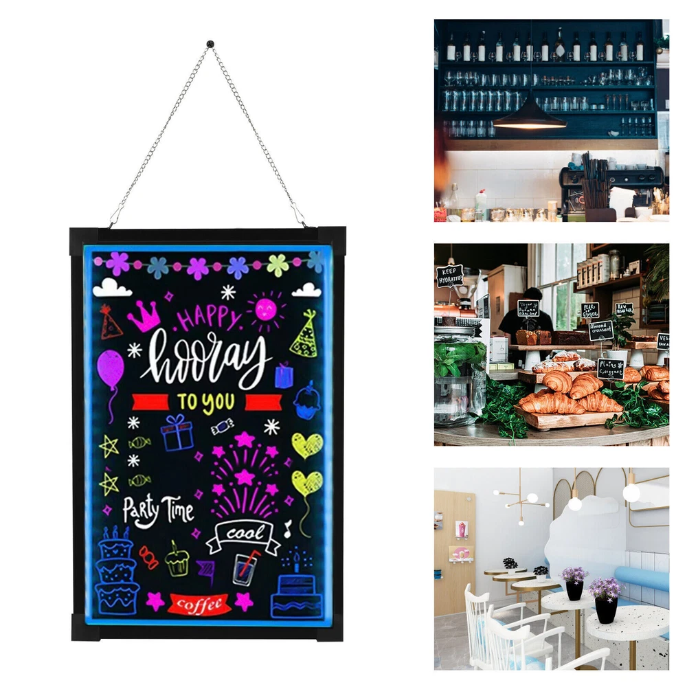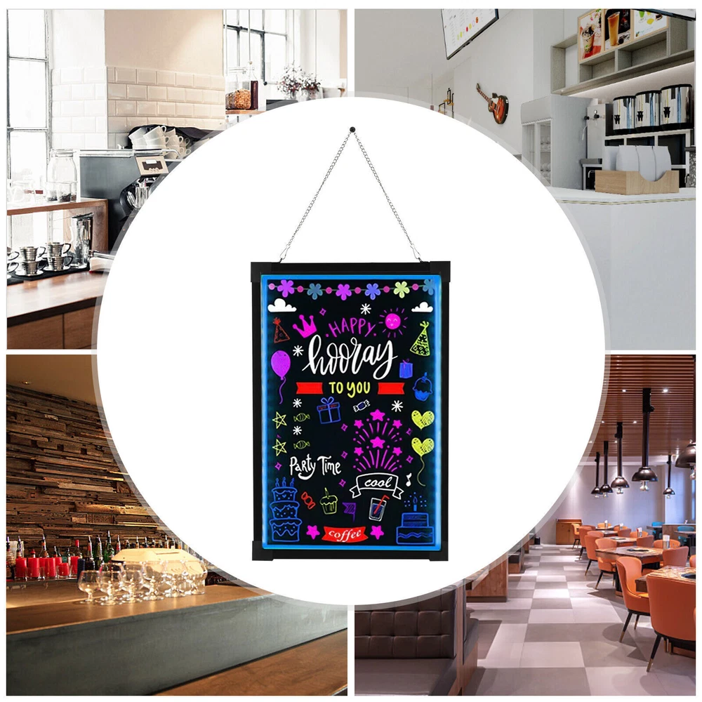 Illuminated LED Message Writing Board Specification Material: Tempered Glass, Aluminum Alloy, PP Color: Black Light Source: LED(5050) Plug: US Standard Power: 0.36W Voltage: AC110-240V DC12V 1A Power Supply: Plug-in/8*AA Batteries(Not Included) Light Colors: Red, Green, Purple, Yellow, Pink, Blue, White Fluorescent Colors: Red, Green, Purple, Yellow, Pink, Blue, White, Orange Number of Light Effects: 18 Length of Power Cord: 2m/6.56ft Working Temperature: -40~60℃/-40-140℉ Product Size: 50*70cm/20*28in 40*60cm/16*24in 60*80cm/24*32in Package Included 1x Led Writing Board 8x Fluorescent Pens 1x Remote Control 1x USB Controller 1x Cloth 1x Clear Chain 1x Power Cord with Plug 1x English User Manual LED Light Up Writing Board Flashing Illuminated Message Menu Sign Board 3-Size Description Description This LED message writing board with 7 color variations and 18 combinations of light effects can attract customers' attention with its eye-catching highlighter and brilliant light effects to bring excellent promotional effects. Such an innovative and unique promotion assistant is a must-have for milk tea stores, bars, and restaurants. Specification Material: Tempered Glass, Aluminum Alloy, PP Color: Black Light Source: LED(5050) Plug: US Standard Power: 0.36W Voltage: AC110-240V DC12V 1A Power Supply: Plug-in/8*AA Batteries(Not Included) Light Colors: Red, Green, Purple, Yellow, Pink, Blue, White Fluorescent Colors: Red, Green, Purple, Yellow, Pink, Blue, White, Orange Number of Light Effects: 18 Length of Power Cord: 2m/6.56ft Working Temperature: -40~60℃/-40-140℉ Type Middle Size Small size Large Size Size 50*70cm/20*28in 40*60cm/16*24in 60*80cm/24*32in Package Size 77.8*59*5.5cm/30.62*23.22*2.16in 66*48.5*5.5cm/25.98*19.09*2.16in 86.5*59*5.5cm/34.05*23.22*2.16in Gross Weight 4kg/7.71lbs 3kg/6.61lbs 5.5kg/12.12lbs Net Weight 3.5kg/7.71lbs 2.5kg/5.51lbs 5kg/11.02lbs Package Included 1x Led Writing Board 8x Fluorescent Pens 1x Remote Control 1x USB Controller 1x Cloth 1x Clear Chain 1x Power Cord with Plug 1x English User Manual Key Features High-quality Materials : This LED message writing board is made of a white translucent tempered glass panel, aluminum alloy frame, and PP back panel. These high hardness and impact-resistant materials make the product sturdy and durable. Convenient and Harmless : The included highlighter will be wiped clean easily without dirt and dust keeping you away from the harmful chalk dust of traditional chalk, which is more healthy and convenient. Impressive and Attractive : The product features 7 colors of light and 18 combinations to bring you a dynamic, colorful and attention-catching display to attract more customers' attention for you. The black PP back panel contrasts with the colorful highlighter and light effect, presenting a visual feast. Energy-saving and Environmental Friendly : The product's power of only 0.36 watts makes it more energy-saving and environmentally friendly as it does not consume too much power even for long-time use. The long-life, recyclable LED light source is more eco-friendly. DIY Fun : Equipped with eight colors of highlighters and an easy-to-wipe glass panel, the message writing board is also an ideal tool for drawing and doodling. Travel with your child to the ideal kingdom of imagination and color! Large Area : The enlarged LED message writing board (3 sizes) provides you with enough space to write slogans, prices, products, and other content to attract customers. And the larger layout with gorgeous lighting is more eye-catching. Simple Operation : The product is equipped with a remote control that allows you to adjust the light color and combination of light effects with just one click, which is very convenient and flexible. Dual Power Supply : The product can be powered by both a power cord and battery to suit different scenes indoors and outdoors. Multi-functional : This LED message writing board is a good substitute for conventional blackboard, teaching board, party decoration, electronic message board, light-up whiteboard, wedding decoration board, digital signage, etc. Protective Packaging : The product is carefully packed in cardboard boxes to avoid damage during transportation. The protective packaging allows the product to reach you intact. Customer Service : We aim to provide quality products and services. If you have any problems, please feel free to contact us. We will reply and solve the problem for you as soon as possible. Details Hooks : Both sides of the product are equipped with hooks to allow you to hang it horizontally and vertically to present different effects. Anti-collision Corners : The four corners of the product are equipped with anti-collision protectors to effectively prevent collisions. Transparent Chain : Transparent chain with hooks allows you to hang the writing board easily. Controller : Connect the controller to the LED board, and adjust the light by pressing the button above. When using the remote control, you can adjust the light and switch by pointing at the controller. Application This product is used for decoration, billboards, blackboards, etc. at home, in shops, bars, restaurants, etc. How to Use the Fluorescent Pen 1. Cover the pen with the cap and shake it up and down several times to make the ink flow more smoothly. 2. Press the pen tip up and down against the contact surface. 3. The pen is ready to write when the ink comes out. 4. Please remember to cover the pen after use to prevent staining elsewhere. Notes Wiping with a towel dipped in water is not recommended. Please use the included cleaning cloth. Please read the user manual carefully before use. Please note that the batteries are not included because of aviation safety policy, you need to prepare eight AA batteries. Please allow the slight color difference caused by the shooting light and 1-3cm error due to manual measurement. Please make sure you do not mind before you order. Welcome to the yiyiukmall ! We are committed to 