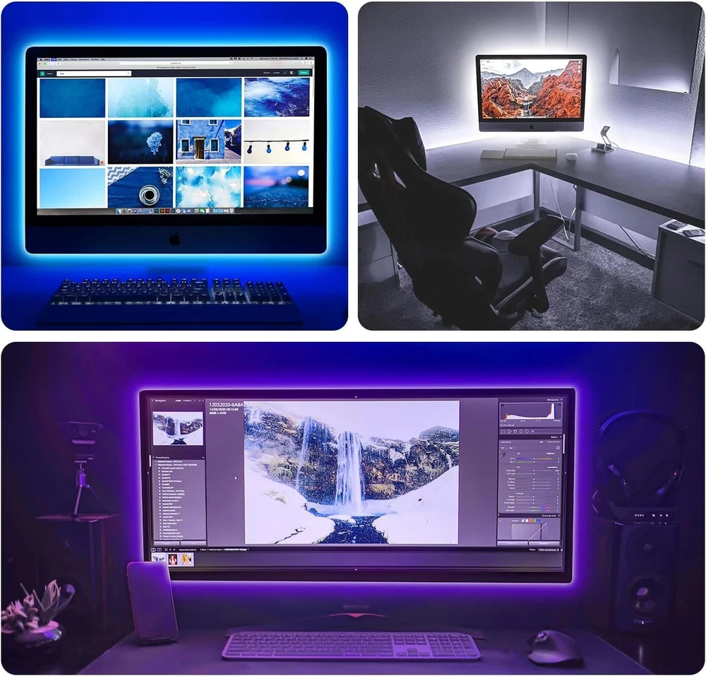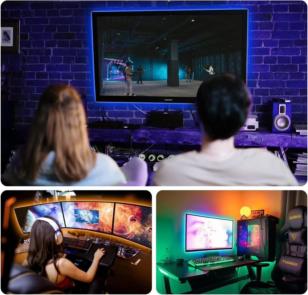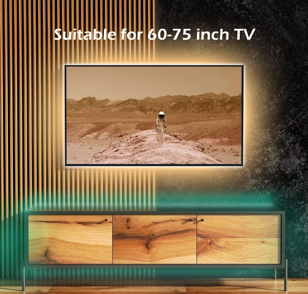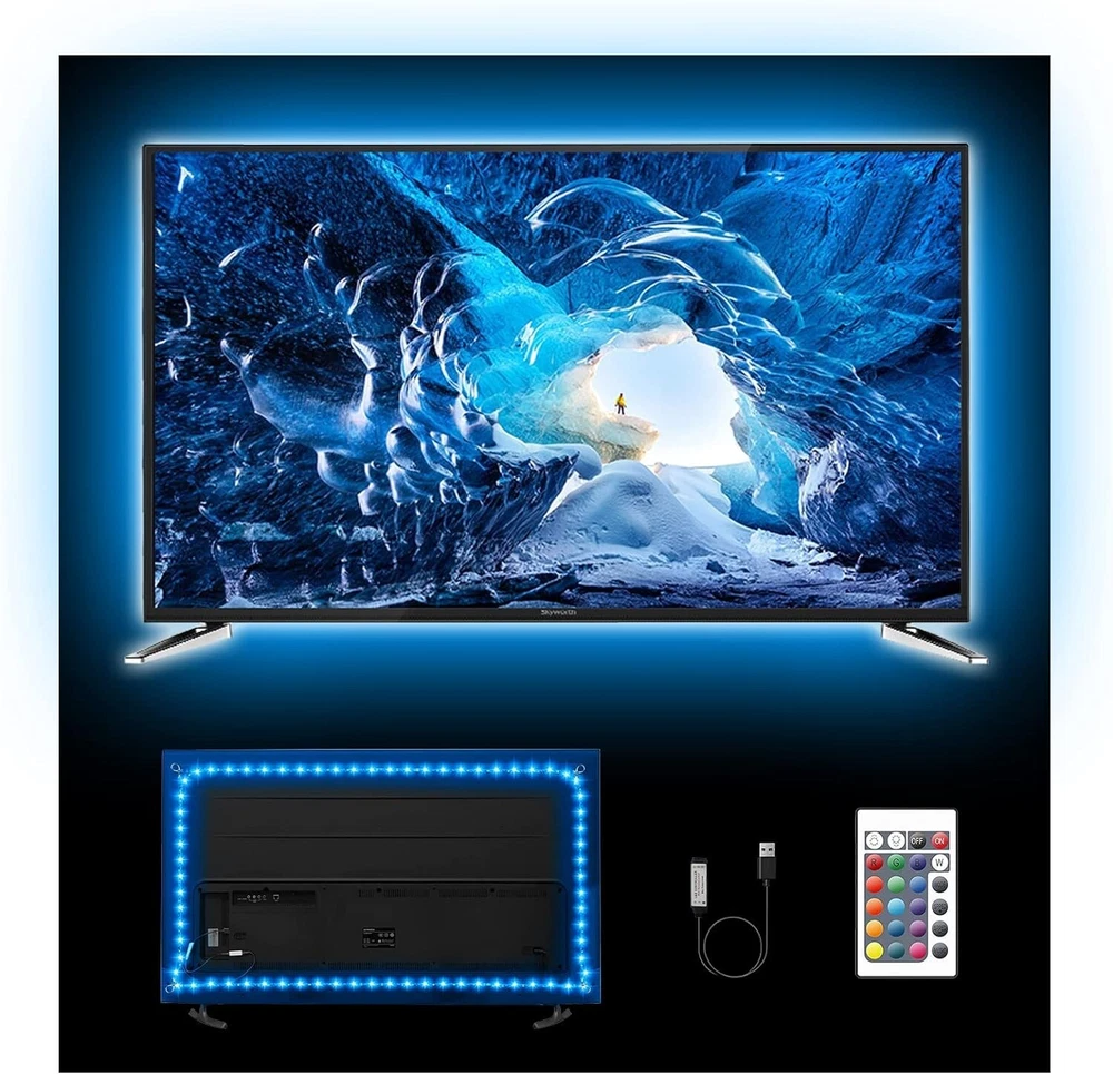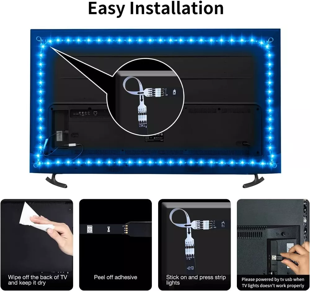 LED Lights for TV 15 Ft, LED Strip Lights for 65-75 Inch TV Backlight About this item [ LED strip lights 15 ft ] : TV Led Backlight kit includes (2*4.9ft+2*2.5ft) Mini controller box, 20 keys remote control and USB power cable, it is suitable for 65-75 inch TV, computer. [ USB Powered Safe Use ] : led lights voltage is 5V which is extremely low-heat, touchable and safe. USB powered behind tv led lighting colors are beautiful and vibrant, they turn on and off automatically with the tv. [ TV Backlight ] : EDIYSUNG led tv lights is the perfect offset to a dark room to help ease strain on your eyes. Make the living room super cozy and add an extra touch and bit of brightness to the room. Perfect for you to spruce up the home entertainment. [ Multiple scene modes ] : RGB TV backlight has many different scene modes (date, party, vibrant, twinkle, romantic, etc.)Make parties, games, home theatre, better cater to your mood. [ Easy to install ] : TV LED light has a strong adhesive and easily to a clean surface by means of an adhesive. They bend at corners without additional connectors or breaking the strips.