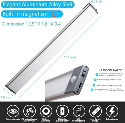 Connectivity Technology: USB Country of Origin: China Type: Does Not Apply Base Material: Metal Product Dimensions: 12.5"D x 1.6"W x 0.4"H Lamp Type: Night Light Batteries Included: Yes Special Feature: Rechargeable, Motion Sensor Shade Material: Metal, Aluminum, Iron Room Type: hallway, Indoor use only,cupboard, drawer,anywhere need a guide l MPN: Does Not Apply Material: The aluminum alloy shell and anodizing Mounting Type: Wall Mount Item model number: DI030CZ123 Finish Type: Polished Included Components: 3*cabinet light+1*user manual+1*usb cable+3*magnet strip with dou Item Width: 1 gtin13: Does Not Apply Light Source Type: LED Specific Uses For Product: Indoor use only Color: Silver Number of Items: 1 Power Source: Battery Powered Size: 54LED Special Features: Rechargeable, Motion Sensor Batteries Required: Yes Part Number: DI030CZ123 EAN: Does Not Apply Item Length: 1 UPC: Does Not Apply Date First Available: May 20, 2024 Style: Modern Brand: Does Not Apply Manufacturer: Does Not Apply Item Weight: 0.5 Pounds Batteries: 1 Lithium Polymer batteries required. (included) Finish types: Polished Indoor Outdoor Usage: Indoor Item Height: 1
