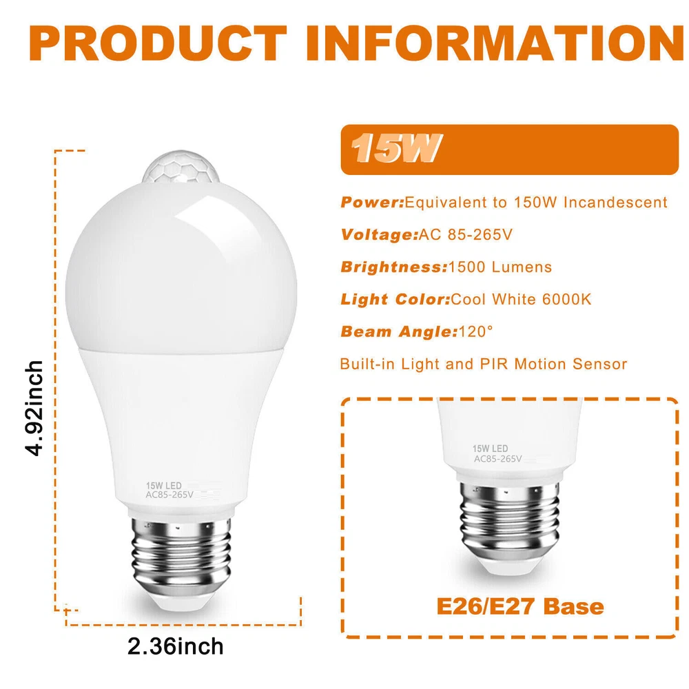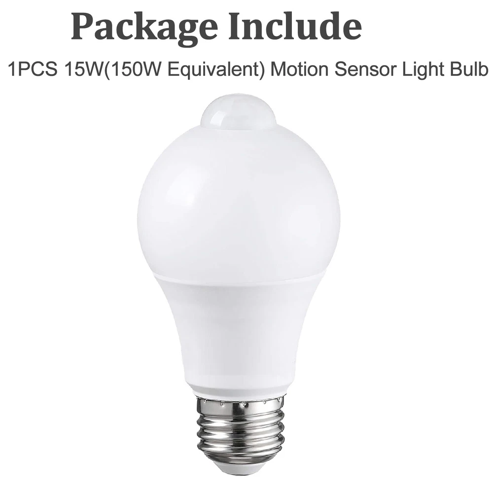 Number of Bulbs: 1/2pcs(as your choice) Custom Bundle: No Light Color: Clear White Diameter Range: 9.8ft Color Temperature: Daylight (5000K - 6500K) Finish: Soft White Indoor/Outdoor: Indoor & Outdoor Installation Area: Indoor & Outdoor Bulb Shape Code: E26; E27 Item Width: 5W(Eq.50W);7W(Eq.70W);9W(Eq.90W);12W(Eq.120W);15W(Eq.150W) MPN: Does Not Apply Lighting Technology: LED Features: Energy Saving, Heat Resistant, Motion Sensor, Wide Beam, Light Sensor Bulb Shape: Classic Bulb Life Hours: 50,000 hrs + Beam Angle: 120 Degrees Type: LED LED Chip Code: 2835 Brand: Unbranded Bulb Wattage: 15 W/12 W/9 W/7 W/5 W Energy Star: A+++ Model: PIR Motion Sensor Light Bulb Lumens: 800 lm - 1500 lm Output Voltage: 15 W/12 W/9 W/7 W/5 W Connectors: Screw Material: Aluminum+ABS Manufacturer Warranty: 6 Months Style: Modern