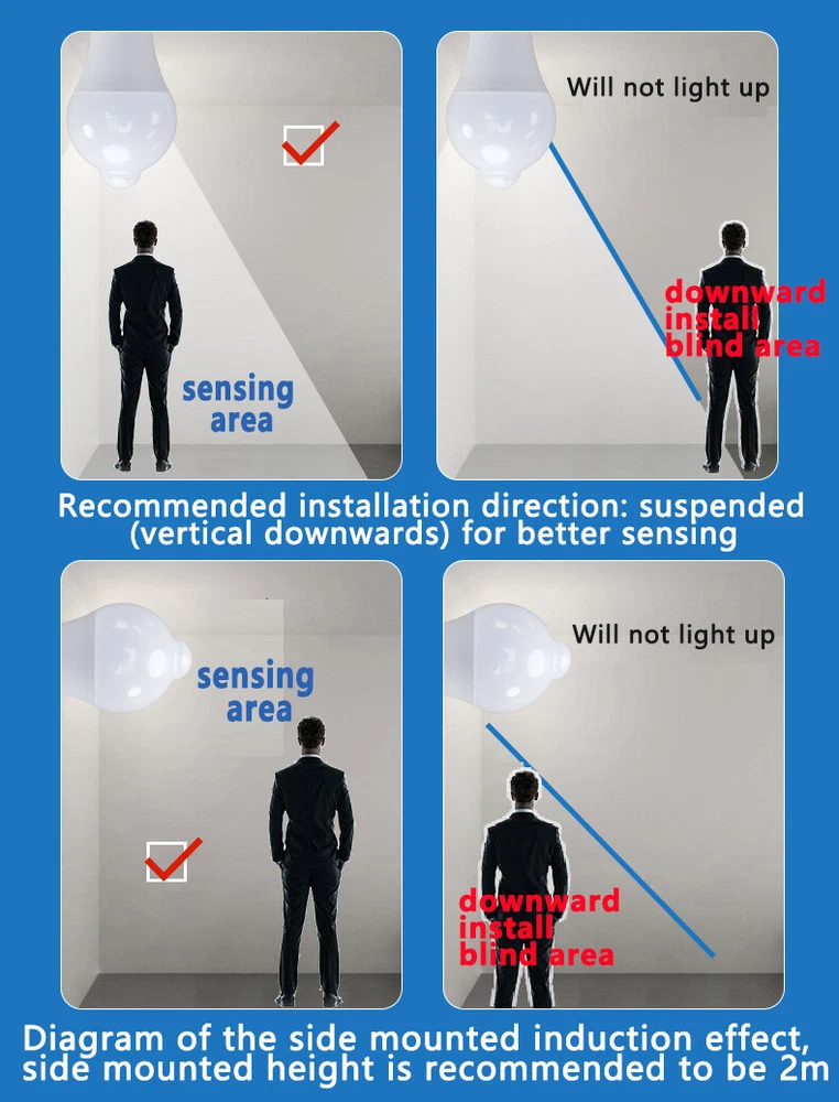 LED Motion Sensor Light Bulb 50/70/90/120/150W Equivalent Energy Saving Lamp US 2x Motion Sensor Light Bulb 15W/12W/9W/7W/5W Motion Activated LED Lamp E26 LED PIR Motion Sensor Light Bulb E27 Infrared Auto Energy Saving Lamp E27 E26 Automatic On/Off Lamp Dusk to Dawn LED Sensor Light Bulb Features: ✅ Specs: Input Voltage: AC85-265V; Output Power: 5W/7W/9W/12W/15W ; Daylight (Color temperature: 6000-6500K); Lamp Style:E26/E27; ✅ PIR Motion Sensor Included: High quality PIR infrared sensor is installed at the tip of bulb, so the motion sensor bulb will light up automatically while it detects motion within 8-10 FT in the dark, and automatically off after the motion ceased or disappeared about 30secs. NOTE: Make sure the sensor is pointing down within proper distance and angle. To increase the bulb's sensitivity, you can adjust the Angle and Height of the bulb installation, make the sensor toward the direction people. ✅ Built-in Dusk to Dawn Sensor: This motion sensing light bulb will automatically switches ON at dusk when the movement sensor is activated and OFF at dawn. NOTE: Will not turn on in the daytime even when they detect motion. And if you use it for the first time during the day, it will turn on for 30 seconds and off when you turn on light switch. ✅ LED Light bulbs: Our motion sensor light bulbs provide 500~1500 Lumen of cool white light, equivalent to 50/70/90/120/150-watt incandescent with 80% less energy use, Last longer and energy saver. ✅ Easy Use: Make sure the sensor is pointing down within proper distance and angle. To increase the bulb's sensitivity, you can adjust the Angle and Height of the bulb installation, make the sensor toward the direction people. ✅ Energy Saving: These movement sensor light only light up in the detective range at night or in dark environment, energy-saving, environment protecting and long life, can be use in stairs, hallway, bathroom, front door, storage room, garage, closet, balcony, gate and so on. The higher you hang the bulb, the larger detection range it achieves as the highest could be 10 feet vertically ✅【User Friendly】Motion sensor light bulb frees your hands, no need to switch on/off physically. Ideal applications include entrance, stairs, hall way, bathroom, basement, garage, storage room, laundry room, balcony, porch, hallway, gate and so on. ✅【Energy Efficient】 50 watt equivalent motion activated bulb uses only 5 watts, saving up to 80% energy than its incandescent equivalent. Long lifespan of 15,000 hours, effectively reduces frequency of changing light bulbs 1. Keep off in the daytime There is a dusk to dawn sensor inside the bulb, so it will not turn on in the daytime even if it detect motion. 2. Auto turn on in the dark when detect motion High quality PIR infrared sensor is installed at the tip of bulb, so the motion sensor bulb will light up automatically while it detects motion within 8-10 FT in the dark 3. Auto turn off in 30 seconds Auto turn off after the motion ceased or disappeared about 30 seconds, save your power effectively. Specification: Power: 5/7/9/1215W(50/70/90/120/150Watt Equivalent); Input Voltage: AC85-265V; Lamp Style: E26/E27 base; Detection angle: 120°, height: 8 ft-10 ft Color rendering index: >80 Package: 1/2 x White Motion Sensor Light Bulbs, NOTE 1 Because with a clear glass cover or fixture will educe the radius of motion detection, we don't recommend you install the bulb into a closed lamp fixture. If you have to do this to make it avoid get wet, please let the motion sensor exposed outside, so it can detect motion well NOTE 2 The bulb should be installed downward and no higher than 10 feet, or the sensor will not work. To increase the bulb's sensitivity, you can adjust the Angle and Height of the bulb installation, make the sensor toward the direction people are coming. NOTE 3 If you use it for the first time during the day, it will turn on for 30 seconds and then keep off Please keep a distance: Don’t install 2 led light bulbs into 1 fixture or too close(less than 10ft), the bulbs function will be affected by each other. Payment Delivery details Terms of sales About us Contact us Payment 1.We only accept PayPal as payment method. 2.The item will be shipped to buyer’s CORRECT and VERIFIED Ebay Address. 3.We are not responsible for the package lost due to incorrect address. 4.Our price do not including any custom or duty, VAT and local tax. 5.Payment must be received within 7 days of winning the auction 6.Please contact us if you need file an extension for any late payment. Delivery details 1.All item are shipped via DHL eCommerce or USPS Frist Class express Service within 2 business days once full payment is settled.If you can't get your items in time,please contact to us first,we will check and solve it for you soon.We will reply your mail within 24 hours normally. Sometimes have a little delay due to the weekend or holiday.If you can't get our mail after 48 hours,please check your spam or contact to us with other mail address or via ebay. 2.We only ship to confirmed Ebay addresses. Your Ebay address MUST MATCH your Shipping address. 3.If you want to change the address please E-mail us right after you pay for the item. 4.SERVICE TRANSIT TIME is provided by the carrier and excludes weekends and holidays. Transit times may vary, particularly during the holiday season. 5.If you have not received your shipment within 30 days from payment, please contact us. We will track the shipment and get back to you as soon as possible with a reply. Our goal is customer satisfaction! Terms of sales 1.Please contact us via eBay Message if you have NOT received item in 30 days , we will check it with post office, and then resend or refund any missing item. 2.i n the unlikely event that your product is faulty in anyway, you must contact us ASAP and then return it within 7 Days of receipt. 3.Return shipping fee should be paid by buyer if wrong item you bought (wrong model or wrong color) and 