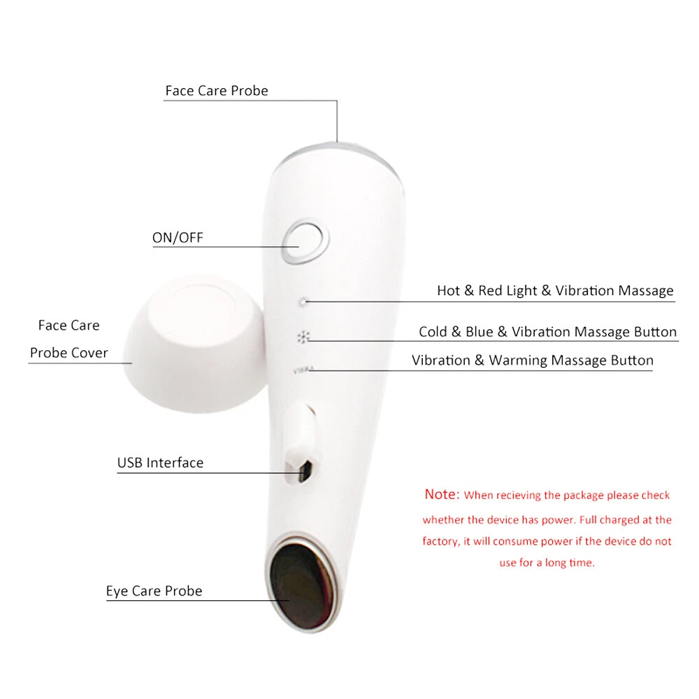 Description: Material:ABS Input:5V 1A Power:5W Charging time:About 2 Hours Battery lifetime: Heating 60mins ,Cooling 40Mins Size:16.2*4.8cm Working time: After fully charge, both ends of the thermal capability of the product can be used for about 60 minutes, the big refrigeration can be used for 40 minutes.Please use after charging,Do not use when charging. Usage: 1.Mode 1 ( facial skin care ) : Heating Massage +Red LED Light + vibration massage After cleansing face, apply serum or cream thoroughly in the face, Press the power key for 4 seconds turn on the heating function mode, promote absorption of skin care products double 2.Mode 2 ( facial skin care ) : Cooling Massage+ Blue LED Light + vibration massage After the skin absorption, and then press the power key once, turn on the cooling function mode, shrink pores, firm skin and effective skin care. 3.Mode 3 ( Eye Care ) : Vibration massage + Warm massage When the Face Skin massage is finished, press the power key once again, switching to eye care, effectively alleviate dark circles and fade eye bags. 4.After working for 10mins,the device will Auto power off. 5.If you need to use it again, press the power button for 4 seconds to power it up again. Function: 1.Anti-aging 2.Skin tightening 3.Face lifting 4.Remove wrinkles and smooth fine lines 5.Shrink pores and skin rejuvenation 6.Restore skin elasticity 7.Improve skin texture Light Therapy Functions: Red Light <650-730nm> It can stimulate the production of collagen.Collagen is an essential protein that use to repair damaged tissue and replace old tissue. Function: Skin rejuvenation, Reduce fine lines & Crow's feet, Repair damaged skin Blue Light <430-450nm> Acne contains prophyrins bacteria; the blue light is able to kill the prophyrins bacteria and achieve the effect of acne removal.The blue light furthermore has calming action for hypersensitivity. Function: Acne removal, Improve sensitive skin, Balance oil secretion Vibration Functions: 10K/RPM Vibration: speed up metabolism of skin cell, reduce Crow's fee, relieve fatigue,Effectively improve skin elastic Hot and Cold Function: Cold effect: 1 Help skin firmness, maintain flexibility, prevent allergies and other problems; 2 Shrink pores, lock moisture and reduce wrinkles; 3 Can soothe sore muscles, relieve skin fatigue, soothe the skin sense of tension, reduce skin redness,pain, Resistance to repeated growth of acne. Hot effect: 1. Warming, makes people feel warm and comfortable, helps to relax muscles, relieve pain; 2. Stimulate the blood circulation acceleration, so the pores opens can help the skin to quickly import all kinds of skin care products absorb double skin. Make the skin more elastic and moist; 3. Putting a sponge to deep cleaning, better able to export the face toxins, blackheads,dirt. Note: 1.The real color of the item may be slightly different from the pictures shown on website caused by many factors such as brightness of your monitor and light brightness 2.Please allow slight deviation for the measurement data 3.Please allow 1-2cm error due to the hand measurement 4.If have any discomfort after using the product,please stop using. 5.BEFORE USING THIS TOOL,STUDY THIS MANUAL TO ENSURE SAFETY WARNING AND INSTRUCTIONS 6.Do not use water to cleaning this product Product Include: 1 x Device 1 x USB Cable 1 x English Manual On Dec 29, 2024 at 05:54:56 PST, seller added the following information: On Dec 30, 2024 at 19:02:46 PST, seller added the following information: