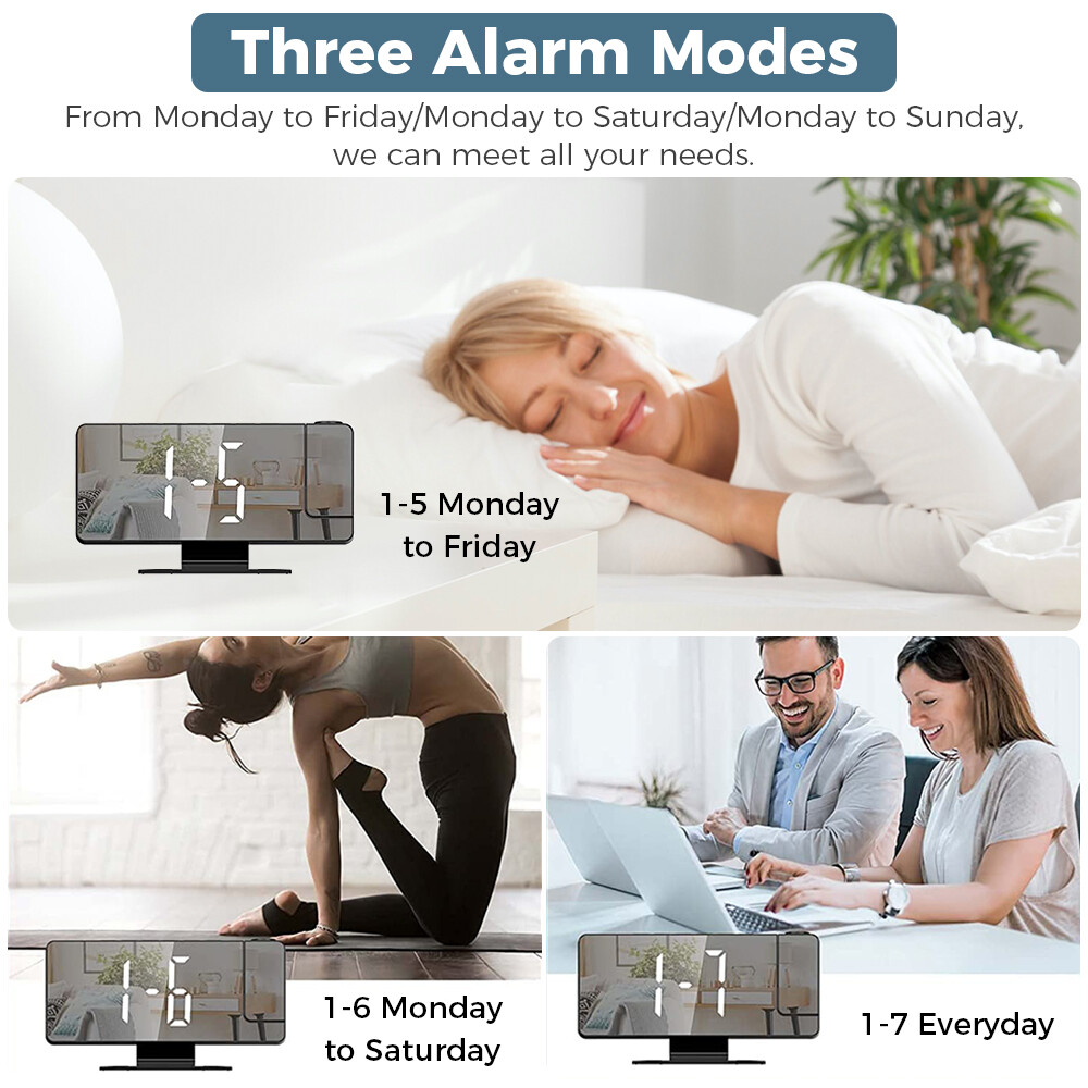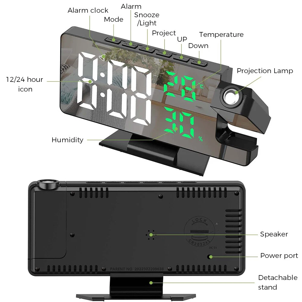 Features: 1.180° Projection Alarm Clock: This adjustable 180° projection clock can project ultra-clear time onto the ceiling or wall at a distance range of 2-5 meters, and is equipped with 2 adjustable projection brightness. When you're in bed, you don't need to touch anything to keep track of your time. 2. USB charging port and memory function: This large 7.8-inch LED digital clock includes a 5V/1A USB output port, which can charge mobile phones, tablets and other electronic devices while charging the LED alarm clock. In addition, the projection alarm clock has a built-in battery backup to remember the time setting even in the event of a power outage. 3. Adjustable brightness and night mode: There are 4 levels of adjustable brightness to meet your requirements. You can adjust the brightness or set the clock in night mode. In night mode, it automatically goes into low light from 18:00 to 5:59 in the evening by default. 4. Snooze function with alarm clock: The projection alarm clock has an alarm clock function with three modes, which can meet all your needs - Monday to Saturday/Monday to Sunday/Monday to Friday. The projection clock has a snooze function. Just press the "Sleep" button and you can get 5~60 minutes of extra sleep or press any other key to cancel the alarm. 5. Simple operation and wide range of applications: Our LED digital alarm clock has a unique design, temperature and humidity with the same screen display, 12/24H, date function, USB charging port and modern design and other updated functions, which is a perfect gift for family, friends and children. Specification: Product Name: LED Mirror Projection Alarm Clock Product size: 18.5x5.5x10.2CM Time display with 4 levels of brightness adjustment: high, medium, low, and off. Manually adjustable Projection Level 3 Brightness Adjustment: High Brightness Low Brightness Off Temperature display: -10°C~50°C(14°F~122 °C); Error: ±1°C Humidity display: 20%~95%, error: +5% Snooze function: adjustable for 5-60 minutes Packing List: 1x clock projector 1x USB cable 1x base 1x User Manual Note: 1. The LED screen is always on when using the USB cable plug that is not included 2. The built-in CR2032 battery is mainly a memory function, and there is no need to reset the time if the power goes out 3. This projection alarm clock must be plugged in and the LED screen will be on all the time. 4. USB cable included, 59 inches in length, but plug not included. 5. The indicator alarm clock can only be displayed towards the back of the alarm clock, if it is forward, the number will be reversed