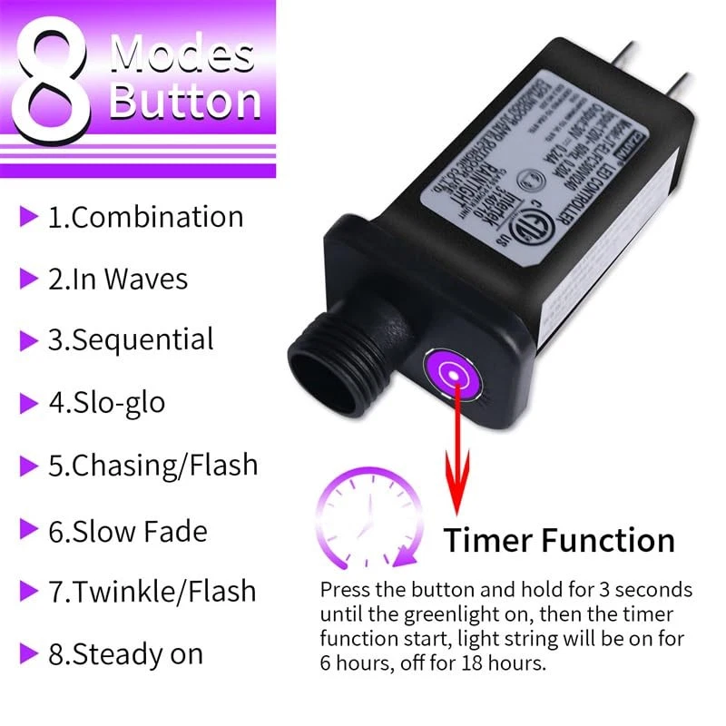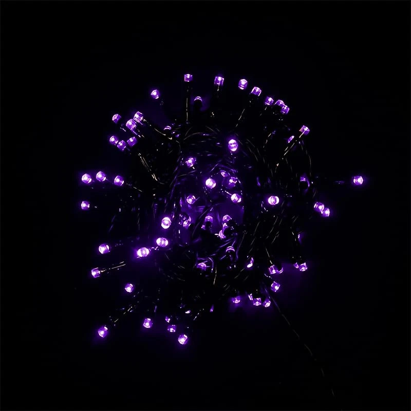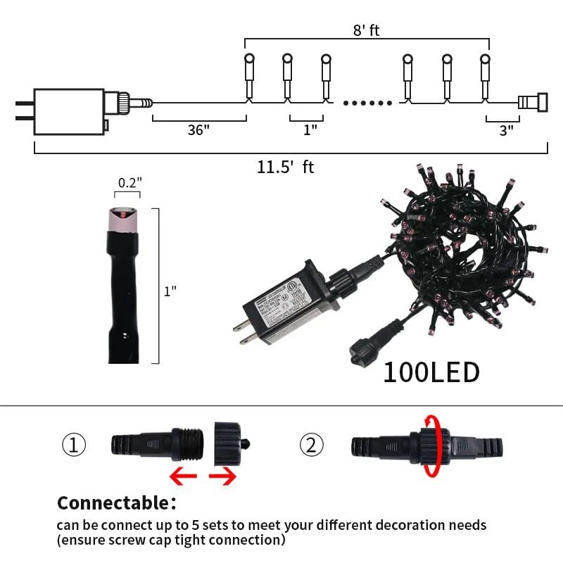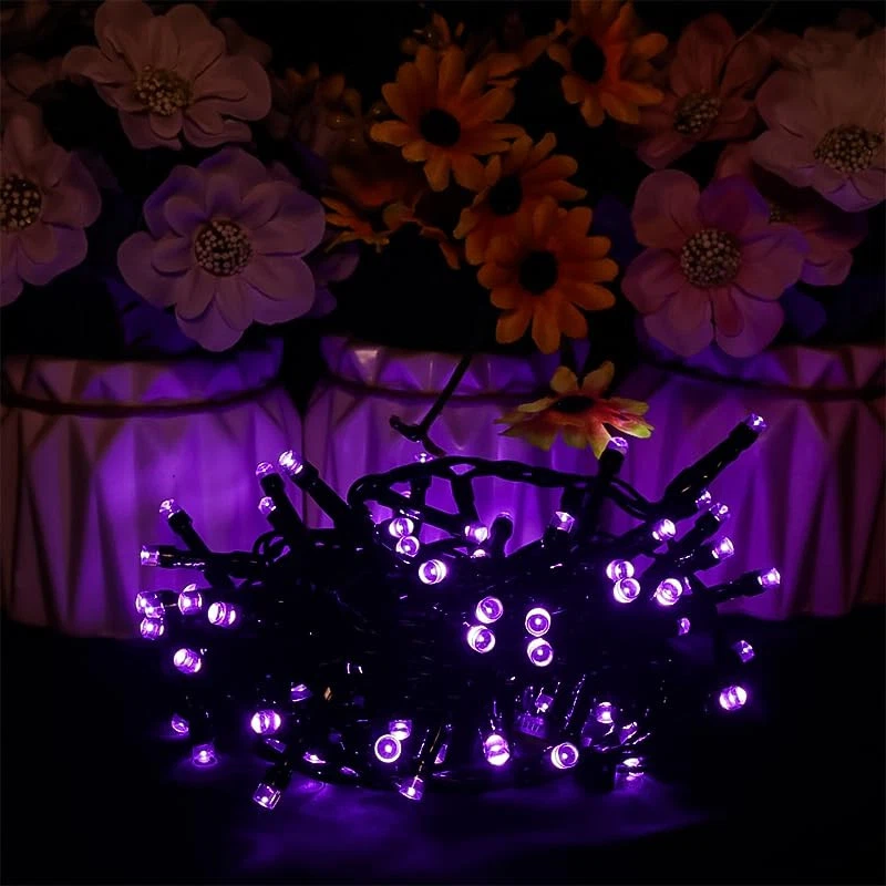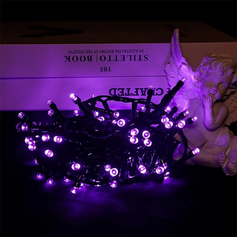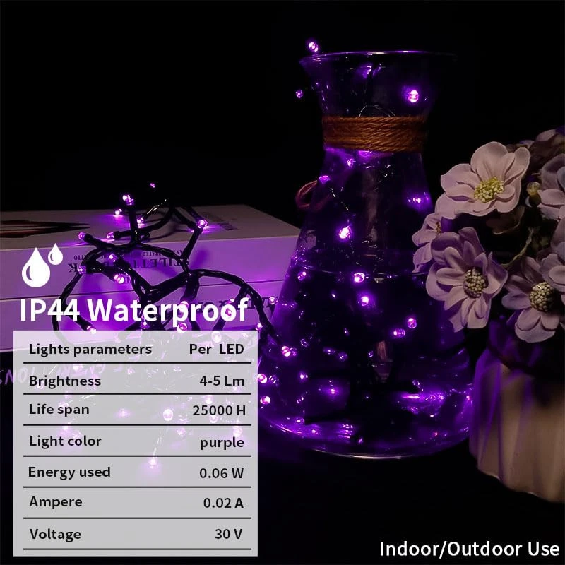 【Halloween String Lights Specification】: 100 count purple led lights are included, total length 11.5 ft, lights length 8 ft and each led is 1 inch apart, lead wire 36 inch, tail wire 3 inch 【Premium and Safe】: Low voltage purple halloween lights can keep at a low temperature state after lighting up for hours, ensure using , IP44 waterproof , great idea for indoor and outdoor halloween decorations 【8 Modes】: halloween decorative mini lights has 8 lighting modes(Combination / In waves / Sequential / Slo glo / Chasing flash / Slow fade / Twinkle flash / Steady on), just press the button on the transformer to change the lighting mode 【Memory】: Outdoor halloween string lights has memory function, when turned on again, will continue the lighting mode used last time. 【Connectable】: Halloween tree lights can be connect up to 5 sets(500 LED) to meet your different decoration needs, this is the great idea for your bedroom, stair railing, garden, porch, patio, gate etc