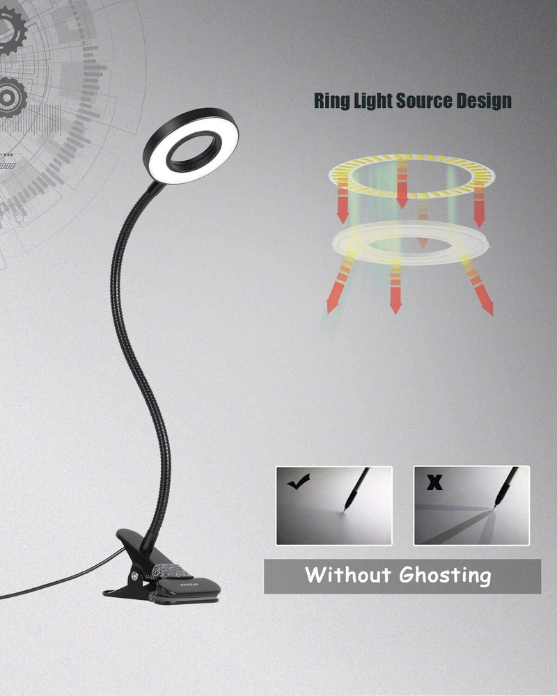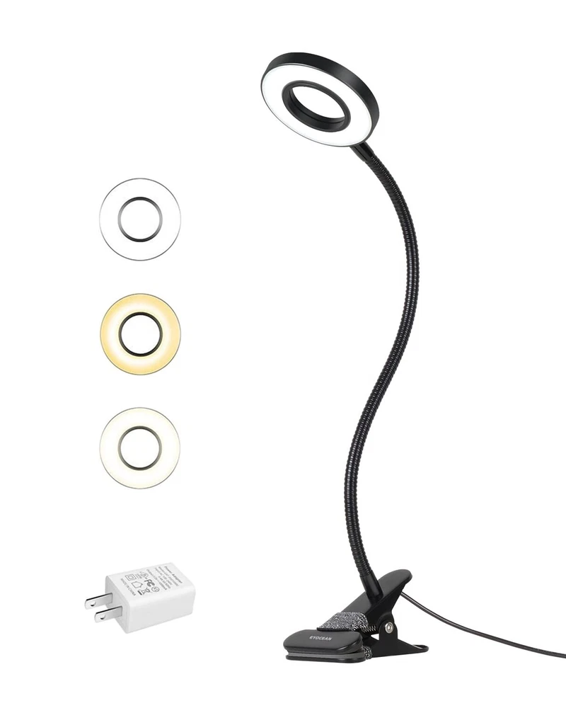 Eye Protection Soft, comfortable and non-flickering design, the lighting is friendly to your eyes and reduces eye fatigue, so you can enjoy what you're doing for longer. Choose Your Mode 3 lighting modes for you to choose: warm light, white light, and cool light. And 9 brightness levels you can adjust: dim and bright. 360° Flexible Gooseneck The 360° flexible gooseneck allows you to easily adjust the light to perfect angles as needed. Multiple Uses With sturdy clamp, so it can be used anywhere, such as computer desk, bed headboard, shelf. Specifications Wattage: 7W Body Material: ABS plastic & Aluminum Alloy LED Color: Warm white, Natural white, Cool white USB Charging Port: 5V/2A Color Temperature: 3000K ~ 6500K Neck Length: 15.6inch/40cm LED Panel:6.3*2.7inch/16*7cm USB chrage cable: 5.25ft/160cm Clamp Width :2.4inch Operating Temperature: -10℃ ~ 50℃ Net Weight: 15.2 ounces Certification: CE RoHS Package Content: 1 x Clamp Light 1 x Power Adapter 1 x User Manual Seller Warranty Lifetime Support Guarantee, 100% LIFETIME MONEY BACK GUARANTEE 【3 Lighting Modes & 10 Brightness Levels】- Clip On Light built-in 24 LEDs (12 Cool LEDs, 12 Warm LEDs). 3 Lighting Modes, warm white, natural white, and cold white. Each mode has 10 adjustable brightness, variety of choices lets you create the most comfortable and perfect lighting mood 【High-grade Materials & USB Powered】- The desk lamp is made of high-grade materials to ensure better dissipation of heat and it won't get hot when working. The light came with a 1.6 m USB-powered cable and can be powered by any USB device 【Ring Design & Eye Protection 】-reading lights, have a larger light-emitting area, and better heat dissipation The reading light provides a soft Eye-Care lightning source, flicker-free, anti-glare light without ghosting to relieve eye fatigue 【Flexible Gooseneck & Strong Clamp】- The clamp lamp of a flexible gooseneck allows you to adjust the light to where you need it. The Strong metal clamp opens up to 2.4 inches and with Non-slip pads can be used perfectly with music stands, pianos, office tables, computer desks, and headboards 【Energy-saving】- The desk light only costs 20% more energy as an incandescent lamp does in the same brightness. No lead or mercury, No UV or IR Radiation. 5V, 2A ADAPTER INCLUDED