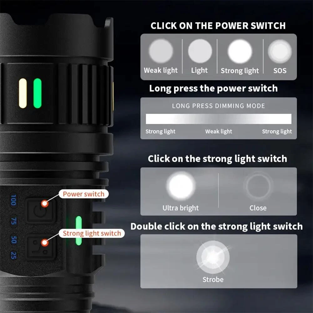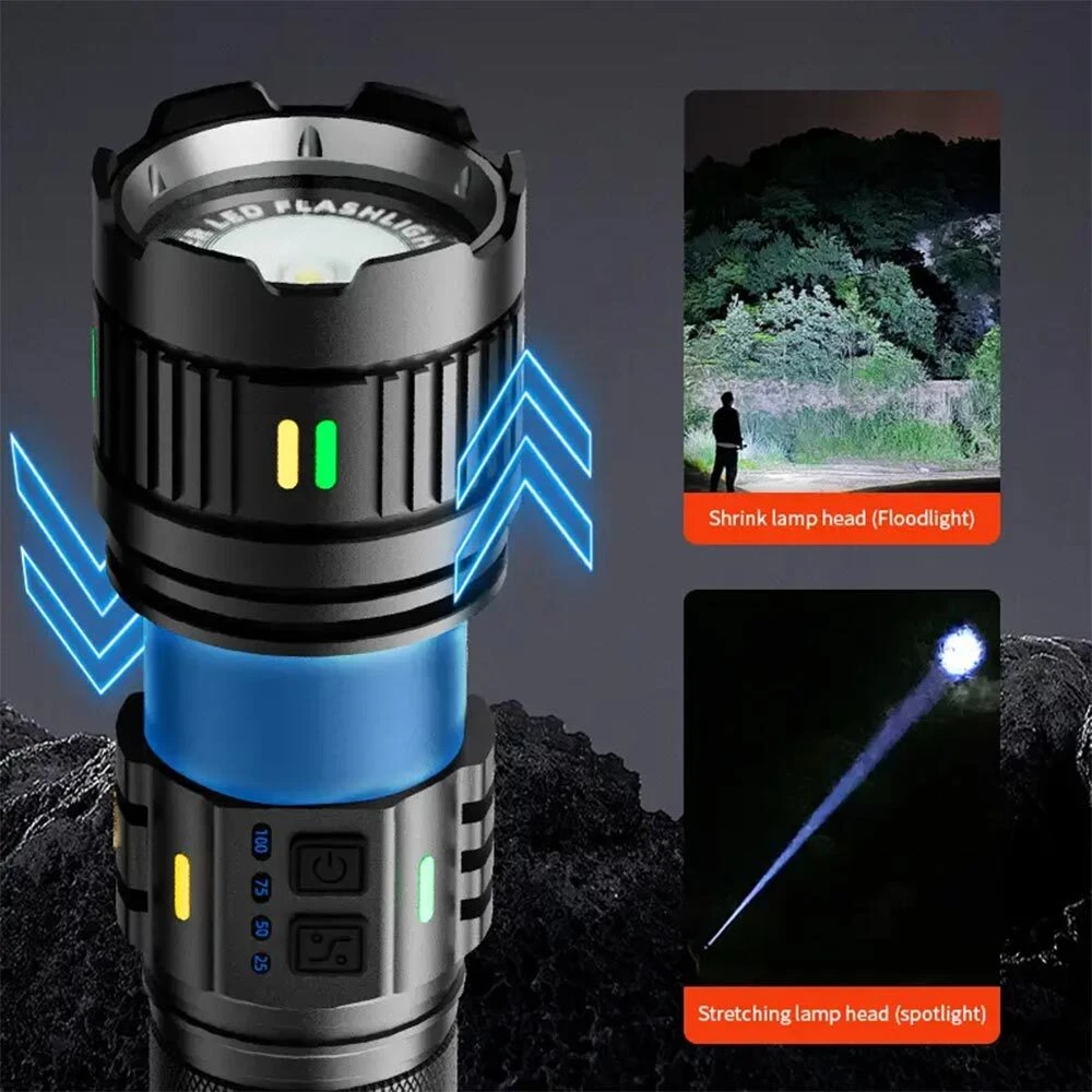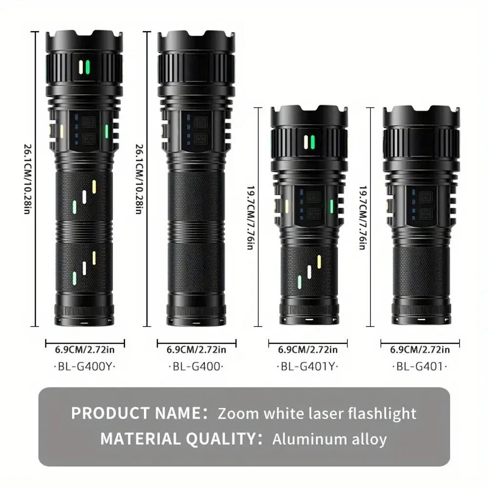 You may also like TAC 2 in 1 Hunting LED Rifle Flashlight & Green Laser Sight Combo For 20mm Rail 35.99 USD Free shipping 1000Miles Green Laser Pointer Pen USB Rechargeable Visible Beam Light Lazer 6.99 USD Free shipping 5mW Adjustable Blue BLaser Pointer Visible Dot Torch Light 37.99 USD Free shipping Red Laser Pointer Red Light Visible Beam Lazer Rechargeable USB Rechargeable 5.99 USD Free shipping Tactical 45 Degree Offset 1" Scope Ring Flashlight Picatinny Light Laser Mount 7.99 USD Free shipping Tactical Red Laser Beam Dot Sight Scope For Rail Weaver 8.88 USD Free shipping Tactical Mini Red Dot RMR Reflex Sight Scope for Glock 17 19 W/20mm Mount 29.88 USD Free shipping 2 MOA Shake Awake Red Dot Sight Scope for 1x20mm Sig Sauer Romeo5 SOR52001 M1913 52.99 USD Free shipping 14250 CR2 Battery 280mAh Li-ion 3.7V Rechargeable Batteries For Laser Light 3.59 USD Free shipping US STOCK compact 4X32 Compact Scope 223/ 308/ Crossbow Scope /w Rings With Clip 26.99 USD Free shipping 3 Slots 1" Scope Riser Mount Fit 20mm Picatinny Rail for Optics Red Dot Sight 7.89 USD Free shipping Tactical Rail Red dot Scope Sight Polymer Base Mount for Glock G17 G19 11.89 USD Free shipping 1000M USB Rechargeable 1mW Green Laser Pointer Pen Visible Beam Light Lazer US 5.99 USD 3.67 USD Set of Bike Turn Signals Light Tail Rear w/ Smart Wireless Remote Control USB 14.89 USD Free shipping Tactical Green/Red Laser Lazer Beam Dot Sight Scope Mount Rifle Hunt# 8.88 USD Free shipping 2000Miles Rechargeable Lazer Red Laser Pointer Pen Astronomy Visible Beam Light 12.88 USD Free shipping 11mm Dovetail to 20mm Rifle Base Scope Mount /20mm Extend Picatinny Rail Adapter 5.99 USD Free shipping Universal Barrel Clamp for Shotgun Rifle Flashlight Scope Tube Gun Mount Adapter 8.99 USD Free shipping Product Description LED Rechargeable White Laser Flashlight Tactical Torch LED Camping Hiking USB Function: 1. The concentrated energy absorbing fluorescent strip can last for 5 minutes, making it convenient to find the flashlight body at night. 2. The same type of spotlight, high transparency Fresnel lens, and "black technology" lens are used in lighthouses. 3. Strong light power LED beads, white laser circular spot, a new generation of explosive bright white laser LED beads. 4. Dual mode switch switching, suitable for more field conditions. G400Y: Power switch: weak light - medium light - strong light - SOS (long press infinite dimming) Strong light switch: burst light - double click to burst flash G401Y: Power switch: weak light medium light strong light SOS (long press infinite dimming) Strong light switch: burst light - double click to burst flash 5. Stretching and zooming are suitable for adjusting distance and proximity. 6. Super large capacity lithium battery, with long-lasting high brightness illumination, 4X18650 (2500MAH)/181350 (4000MAH) specification lithium battery 7. Two interfaces for charging and discharging, making universal devices more convenient. The perfect combination of TYPE-C fast charging and USB-A reverse charging 8. Standard threaded interface, can be used with brackets, brackets are not included in the product list 9. Waterproof design for daily life, fearless of wind and rain erosion (unable to be used underwater) Specifications: Size: BL-G400Y: 26.1 * 6.9cm BL-G401Y:19.7*6.9cm Weight: BL-G400Y: 1450g BL-G401Y: 950g Actual lumen: BL-G400Y: 1500LM BL-G401Y: 1500LM Illumination distance: greater than 1000m Power: 30w Package: BL-G400Y: Flashlight * 1 Charging cable * 1 181350 lithium battery * 4 BL-G401Y: Flashlight * 1 Charging cable * 1 18650 lithium battery * 4 Payment Shipping Terms Returns Contact Us About Taxes 1. We accept payment via PAYPAL ONLY . 2. Payment must be made within 4 days of auction closing. (Non-payment may result in a UPI (Unpaid Item) being put on your account. eBay will automatically close your account if you accumulate 4 UPI's total.) 3. TOTAL AMOUNT DUE includes the final auction price plus S&H(Shipping and Handling). 4.S&H will be determined based upon the SHIP TO address, Tax and customs. PLEASE NOTE: S&H DOES NOT INCLUDE DUTIES, LOCATL TAXES OR ANY OTHER IMPORTATION FEES. We are not responsible for any custom duty or import tax. 5. Please list your special requests (color, packages, etc.) in the PAYPAL NOTES SECTION when you make payment. Our working hours Beijing time from 9:00 a.m. to 18:00 p.m . Monday to Friday Item will be shipped from US/DE/UK warehouse;within 1 days after payment received, usually delivery time 24-72 hours. Warranty: 1. One Year Manufacturer's Warranty for defective items (excluding items damaged and/or misused after receipt). Accessories come with a 3-month warranty. 2.If buyer requests a return when there is no quality problem of the item he received,return postage has to be paid by buyer,and postage for the item won't be returned. 3.If item is damaged or defective on arrival,buyer can either requests a refund or replacement,and postage will be paid by us,meanwhile,the item must be returned. Note: A. Customs duties is neither included in the item value nor the postage,which should be in the responsibility of buyers. B. Please check with your country's customs office to determine what these additional costs will be prior to bidding/buying. 1. You have 7 days to contact us and 10 days to return it from the date it was received. WE WILL ISSUE YOU A REFUND OR REPLACEMENT ! 2. All returned items MUST BE in the original packaging and you MUST PROVIDE us with the shipping tracking number , specific reason for the return, and your eBay ID . 3. We will refund YOUR FULL WINNING BID AMOUNT, upon receipt of the item in its original condition and packaging with all components and accessories included, AFTER BOTH Buyer and Seller cancel the transaction from eBay. OR, you may choose to have a replacement. 4. Return shipping is to be paid by the Buyer . Our office hours are: 9:00 a.m to 6:00 p.m (GMT +8) of Monday to Saturday. And our office is closed on Sunday and