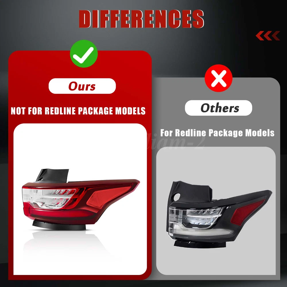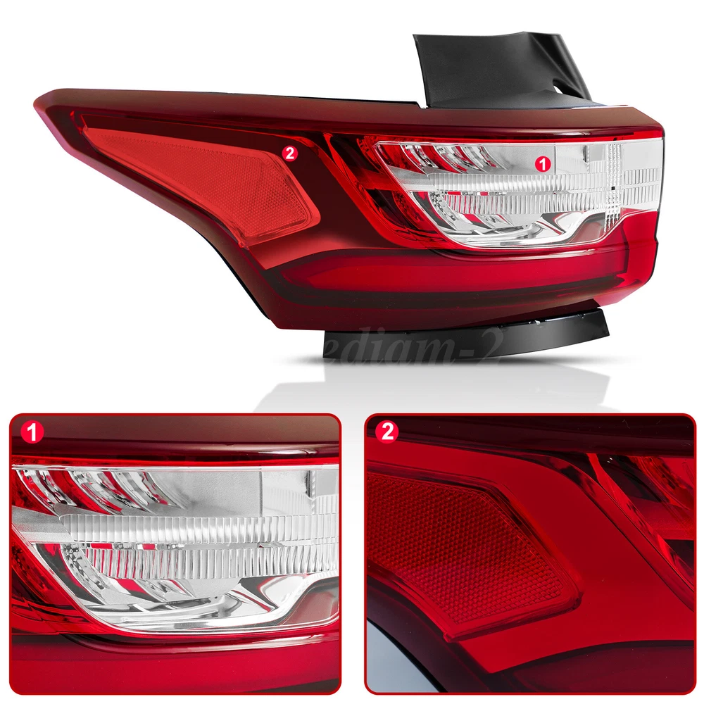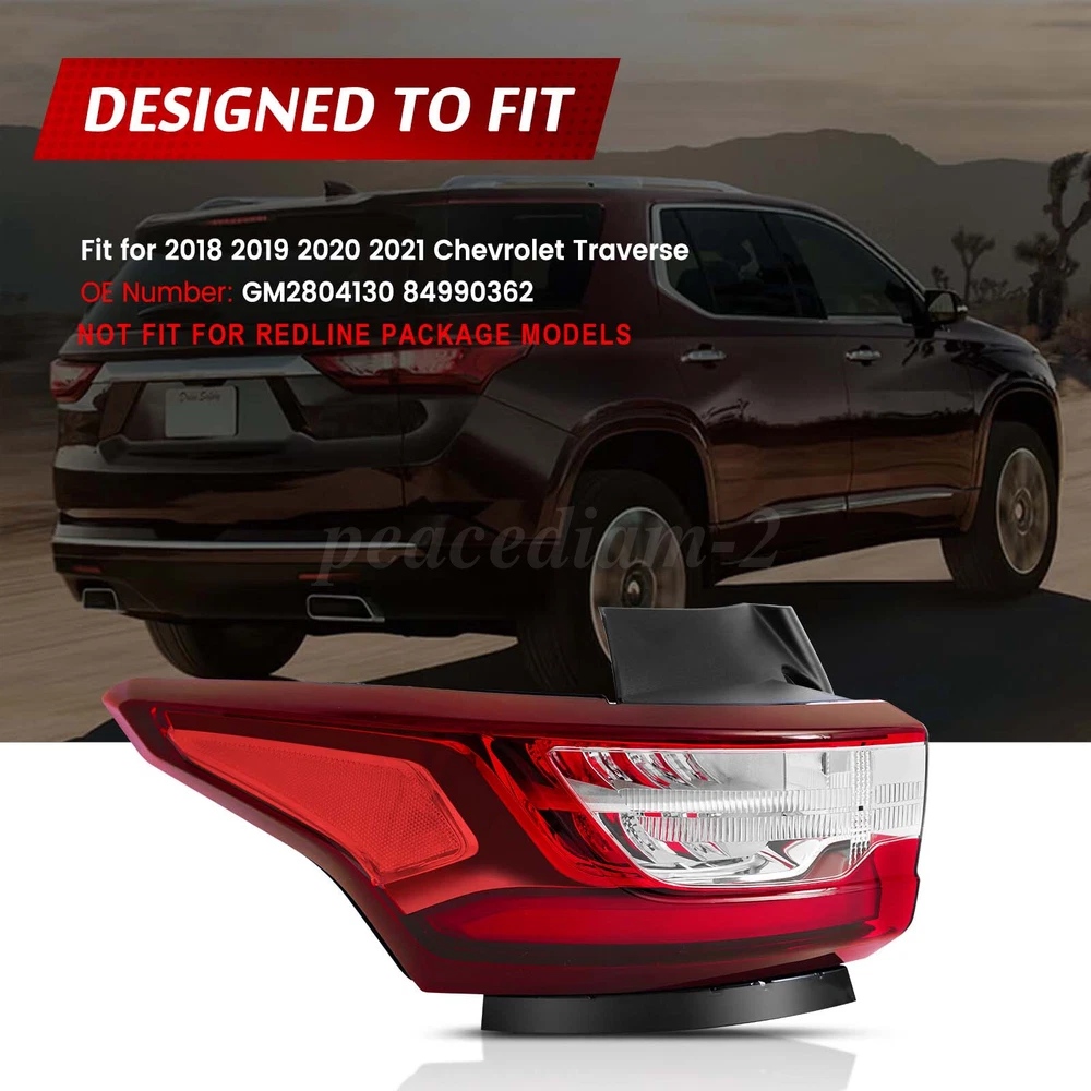 LED Red Tail Light For 2018-2021 Chevy Traverse Rear Lamp Left Driver Side Outer PRODUCT DETAILS Description: This car tail light assembly is 100% brand new in original factory packaging, ensuring excellent quality. It is perfectly compatible with your vehicle for a plug-and-play installation without any adjustments, allowing your car to quickly regain its optimal state. The lightweight design significantly reduces weight and improves energy efficiency. The high-efficiency LED light source provides greater brightness, longer lifespan, and energy savings. At night, this tail light enhances vehicle visibility, emitting a clear warning signal to build a safety barrier for you and other road users. Choose this tail light for a safer, more efficient, and eco-friendly driving experience. Specification: Type: Tail Light Assembly Light Type: LED Bulb: Included with and wiring harness OE Number: GM2804130, 84990362 Housing Color: Chrome Lens Color: Red Clear Material: Heavy-duty polycarbonate Placement on Vehicle: Rear, Outer, Left, Driver Side Fitment: Fit for 2018 2019 2020 2021 Chevrolet Traverse Not Fit for Redline Package Models Package Contents: 1×Tail Light (Outer Left, Driver Side) With LED bulbs and wiring harness Features: 【Brand New Factory Packaging】This tail light comes in 100% new factory packaging, unopened and untouched, preserving its original condition. It reflects confidence in product quality and is a testament to our commitment to your choice. 【Seamless Replacement, Plug-and-Play】Designed for convenience and peace of mind, this tail light is perfectly suited to your vehicle without requiring modifications or adjustments. The installation and performance match the original parts seamlessly for a true "plug-and-play" experience, restoring your car to its best condition quickly. 【Lightweight and Energy Efficient】With an advanced lightweight design, this tail light maintains strength while significantly reducing weight, contributing to overall vehicle efficiency. Combined with the high-efficiency LED light source, it delivers higher brightness and longer life while reducing energy consumption, supporting eco-friendly driving. 【Enhanced Safety for Night Driving】Nighttime journeys are safer with this tail light, which improves vehicle visibility and emits clear, attention-grabbing warning signals at crucial moments, providing a protective safety barrier for you and others on the road. Note: 1.Please confirm compatibility with your vehicle before purchasing. 2.Ensure the installation is secure before driving for safety. 3.Due to differences in display and lighting, the actual product may vary slightly from the images. 4.Installation instructions are not included; professional installation is highly recommended. PAYMENT We only support transactions on the ebay, do not support offline or private transactions. Please make sure the address is accurate before you pay. SHIPPING We do not ship to PO Box, Alaska/Hawaii, APO/FPO, and US Protectorates. Item(s) would be shipped out within 1~2 working days after received your confirmed payment. Weekends and holidays are not working days. We will choose different warehouses according to the customer's address and item stock, shipped from CA and PA in the United States. RETURN Buyers may return or exchange an item which damaged within 30 days. eBay & PayPal money back guaranteed. CUSTOMER SERVICE We are committed to provide the best purchase experience for our customers. If you have any questions, just feel free to contact us, we respond queries within 24 hours in business days.