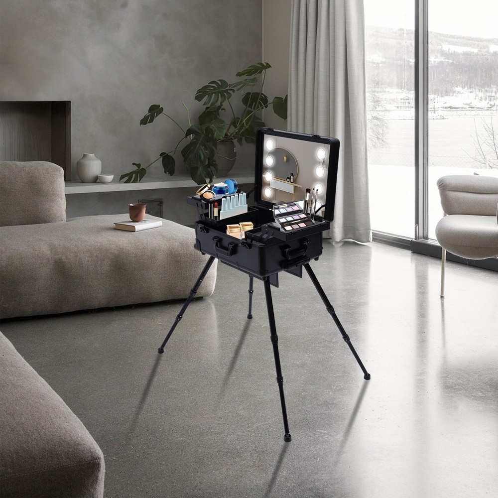 Specification Color: Black Material: Aluminum Alloy, Decorative High-pressure Laminate, Aluminium Bars Wheel Material: Nylon Surface Treatment: Oxidation Number of Wheels: 4 Shape: Rectangular Voltage: 12V Bulb Type: 8pcs 5W LED Bulbs (Included) Plug: US Standard Mounting Type: Free Standing Light Color Type: White, Yellow, Yellow-White Mix Max. Load-bearing Capacity: 50kg/110.23lbs Gross Weight: 14kg/30.86lbs Net Weight: 12kg/26.46lbs Light Source Diameter: 5cm/1.97inch Size: 22" Mirror Size: 49*36cm/19.3*14inch Tray Size: 16.5*26.5*3cm/6.5*10.4*1.2inch Top Cover Size: 52*40cm/20.5*15.7inch Overall Case Height: 133cm/52.4inch Supporting Leg Max. Height: 82cm/32.3inch Tray Distance From Floor: 96cm/37.8in Package Size: 67.5*51*29cm/26.57*20.08*11.42inch Rolling Makeup Train Case Cosmetic Trolley Organizer Travel w/LED LIght & Mirror Description Whether you are working or traveling, a professional make-up case will take a lot of convenience of your work. This make-up case is made of high-quality aluminum alloy, and decorative high-pressure laminate, which is strong and durable. With huge compartments and multiple trays, this case is ideal for professional makeup artists and beauticians. Specification Color: Black Material: Aluminum Alloy, Decorative High-pressure Laminate, Aluminium Bars Wheel Material: Nylon Surface Treatment: Oxidation Number of Wheels: 4 Shape: Rectangular Voltage: 12V Bulb Type: 8pcs 5W LED Bulbs (Included) Plug: US Standard Mounting Type: Free Standing Light Color Type: White, Yellow, Yellow-White Mix Max. Load-bearing Capacity: 50kg/110.23lbs Gross Weight: 14kg/30.86lbs Net Weight: 12kg/26.46lbs Light Source Diameter: 5cm/1.97inch Size: 22" Mirror Size: 49*36cm/19.3*14inch Tray Size: 16.5*26.5*3cm/6.5*10.4*1.2inch Top Cover Size: 52*40cm/20.5*15.7inch Overall Case Height: 133cm/52.4inch Supporting Leg Max. Height: 82cm/32.3inch Tray Distance From Floor: 96cm/37.8in Package Size: 67.5*51*29cm/26.57*20.08*11.42inch Package Included 1 x Makeup Case 1 x Power Cord 1* Plastic Barrel 2* Keys 4 x Universal Wheels Key Features High-quality Materials: The make-up case is made of high-quality aluminum alloy, and decorative high-pressure laminate, which is very strong and durable. Large Capacity: Applied with 3-Tiers, this make-up case can provide you with plenty of storage space to meet your storage needs. Whether you are a makeup artist, manicurist, or hairdresser, you can put all your tools inside. Excellent Weight-bearing Capacity: The four supporting feet at the bottom and the aluminum alloy frame provide the make-up case with a maximum weight-bearing capacity of 50kg/110.23lbs. You can place all kinds of hairdressing and beauty tools on it with confidence. Sorted Storage: This make-up case has four multi-functional trays to store makeup brushes, nail polish, foundation, eye shadow, hair clips, and other tools. The neat and orderly distribution and compartmentalized trays keep the tools in order, which is an indispensable helper for you. Stylish Appearance: This make-up case gives a stylish and exquisite look with its simple construction and stylish black. Such a retro make-up case will decorate your dressing room well and make a good impression when you are working outside. Professional Make-up: The large clear mirror and 8 LED bulbs provide enough light source. You can adjust the light color and brightness on three levels as needed by using the touch buttons in the middle. It will illuminate your face, creating a clear mirror image to provide a professional make-up experience for you. Adjustable Height: The height of the supporting legs can be adjusted in three heights (up to 82cm/32.3inch) to suit people of different heights. Secure & Reliable: You can rest assured that your cosmetics or valuables are protected by 2 metal locks on each side of the case. The lockable design ensures the security and privacy of tools. Considerate Design: This make-up case comes with a 12V rechargeable jack, an external power supply jack, and a power jack. And the power cord can be used for an external curling iron, mobile phone, and hairdryer power when it is powered up to meet your needs while working. Wonderful Gift: The make-up case is an ideal gift for your friends in the hairdressing industry on birthdays, anniversaries, and Christmas because it is useful and beautiful. Easy to Move: This make-up case is equipped with four universal wheels, a carrying handle, and a drawbar. You can easily move it to the desired position, which is convenient for hair cutting, make-up, and working outside. Protective Shipping: In order to prevent the product from being damaged and bumped during transportation, we fill the package with anti-collision protection foam to protect your products to the maximum extent possible. Details Rounded Edges: The edges of the make-up case have been designed with rounded edges rather than sharp edges to avoid bruising. Rubber Covers: There are 4 rubber covers on the supporting legs to protect the floor from scratches. Slotted Connection: Compared to the old screw connection, the installation of the universal wheel is more flexible by using a slotted connection to fix the rotation, is easy to dismantle, and saves time and effort. It is very convenient for replacing and repairing wheels. Large Diameter Light Source: The large 5cm/1.97inch diameter light source is aesthetically pleasing and provides a wider range of light. Half Tempered Mirror: The mirror adopts a half tempered mirror, which has high strength, safety, explosion-proof performance, and good heat resistance. It can be used under various high-temperature working conditions without bursting, so you can use it with confidence. Reinforced Lock: Reinforced lock not only makes it convenient for you to open and close, but also does not affect the appearance, and solves the embarrassment of bursting when going out. Application This make-up case is suitable for professional make-up artists, hairdressers, nail technic