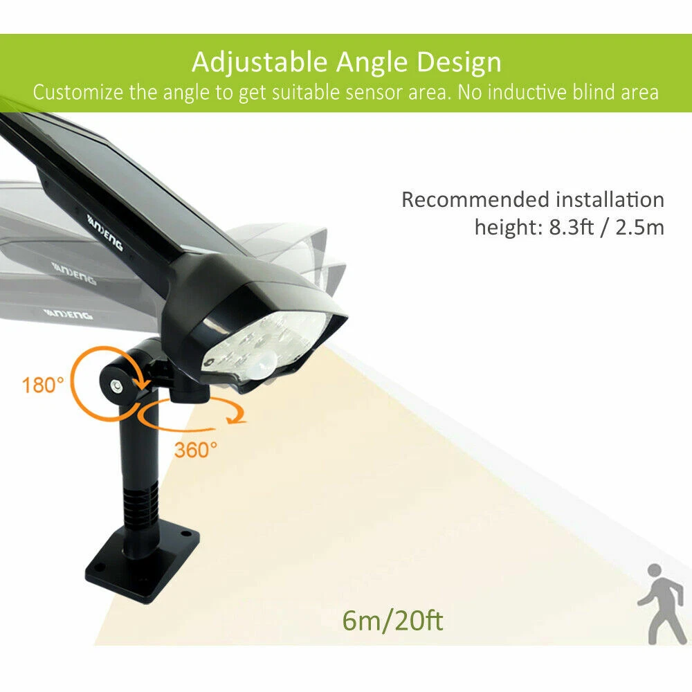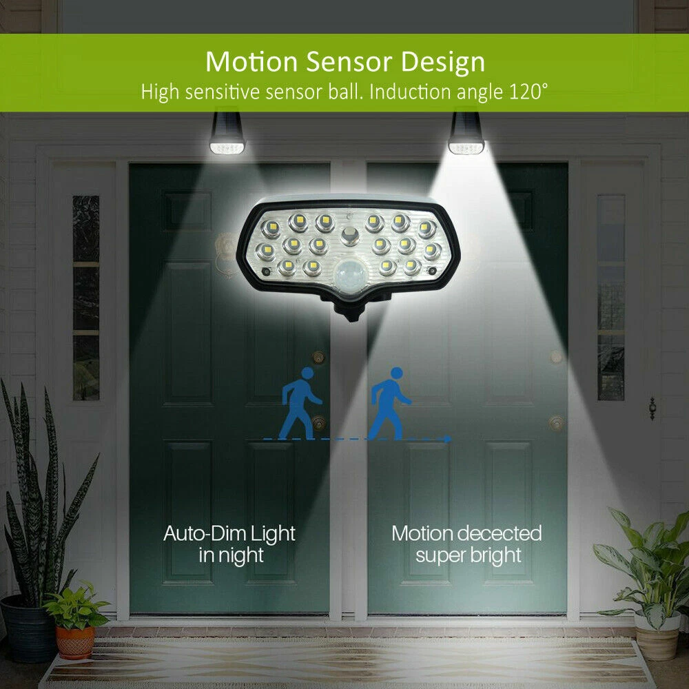 LED Solar Flood Light Motion Sensor Security Spot Wall Street Yard Outdoor Lamp DESCRIPTION: • Not Only A Wall Light: With unique adjustable angle design, you can place this light wherever you want to by twisting the knob screw , on the wall or ground or anywhere else, and you may place the solar panel vertically against the sunlight to maximize the absorption of solar energy. • Super Bright Solar Light: 2200 mAh rechargeable lithium-ion battery combining high power 16 LED beads with the innovative wide angle design, this solar wall light can reach 320 square feet. • Sense A Cat Highly Sensitivity PIR Motion Sensor System: With the adjustable angle design, the PIR sensor range comes to 23ft and there is no blind area like other brands always have. Our solar lights detect sensitively even a small pet like cats. • Innovative Ip65 Waterproof: The outside ABS shell is solid and durable with IP65Waterproof against any terrible weather. Adopted standard battery and high-quality LED, works longer than other brand lights with low price & bad quality. • Easy To Install: 1. Punch 4 holes on the wall with a drill bit and insert the attached wall plugs. 2. Twist the screws through the mounting hole of the light into the wall plug. 3. Adjust the angle then tighten holder and the light through knob screw. Turn on the light. SPECIFICATIONS: • Solar panel: 5.5V, 1.1W • Li-ion battery: 3.7V 2200mAh • LED: 16pcs, SMD2835,1.4W • Lumens: 150Lm • LED span life: 50,000 hours • Solar charging time: 8 hours • Lighting mode: Dark/DIM/bright; Bright: motion activate for lighting • Auto identify day or night • Li-ion battery span life: >500 circles PACKAGE INCLUDE: • 1 × Solar Motion Sensor Light; 4 × Wall Plugs; 4 × Screws; 1 × User Manual