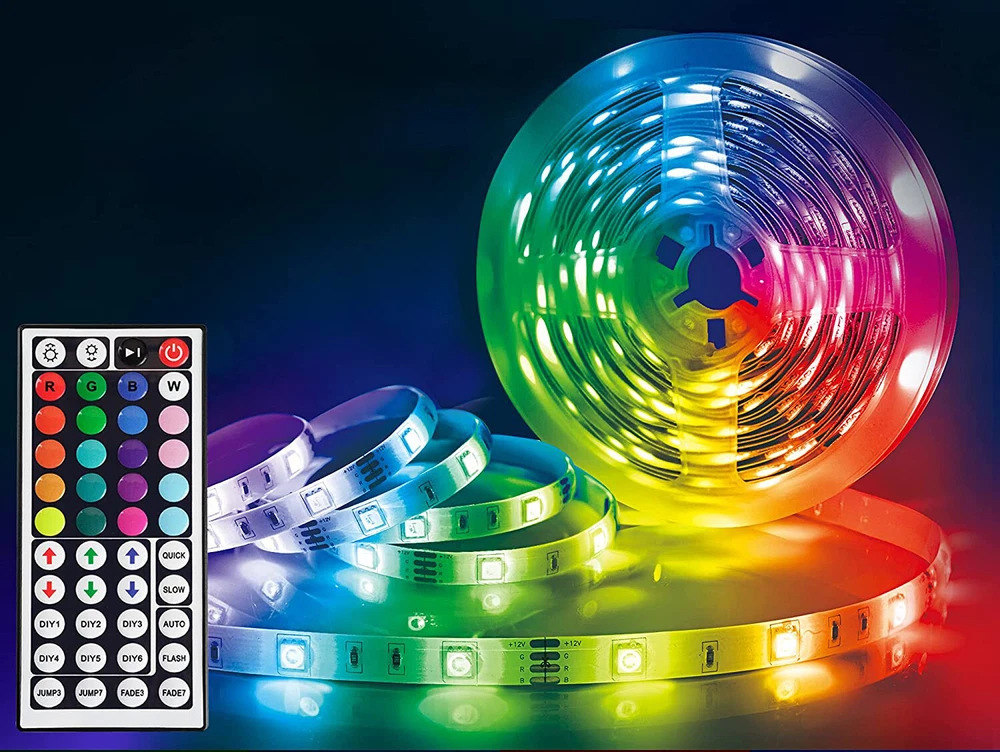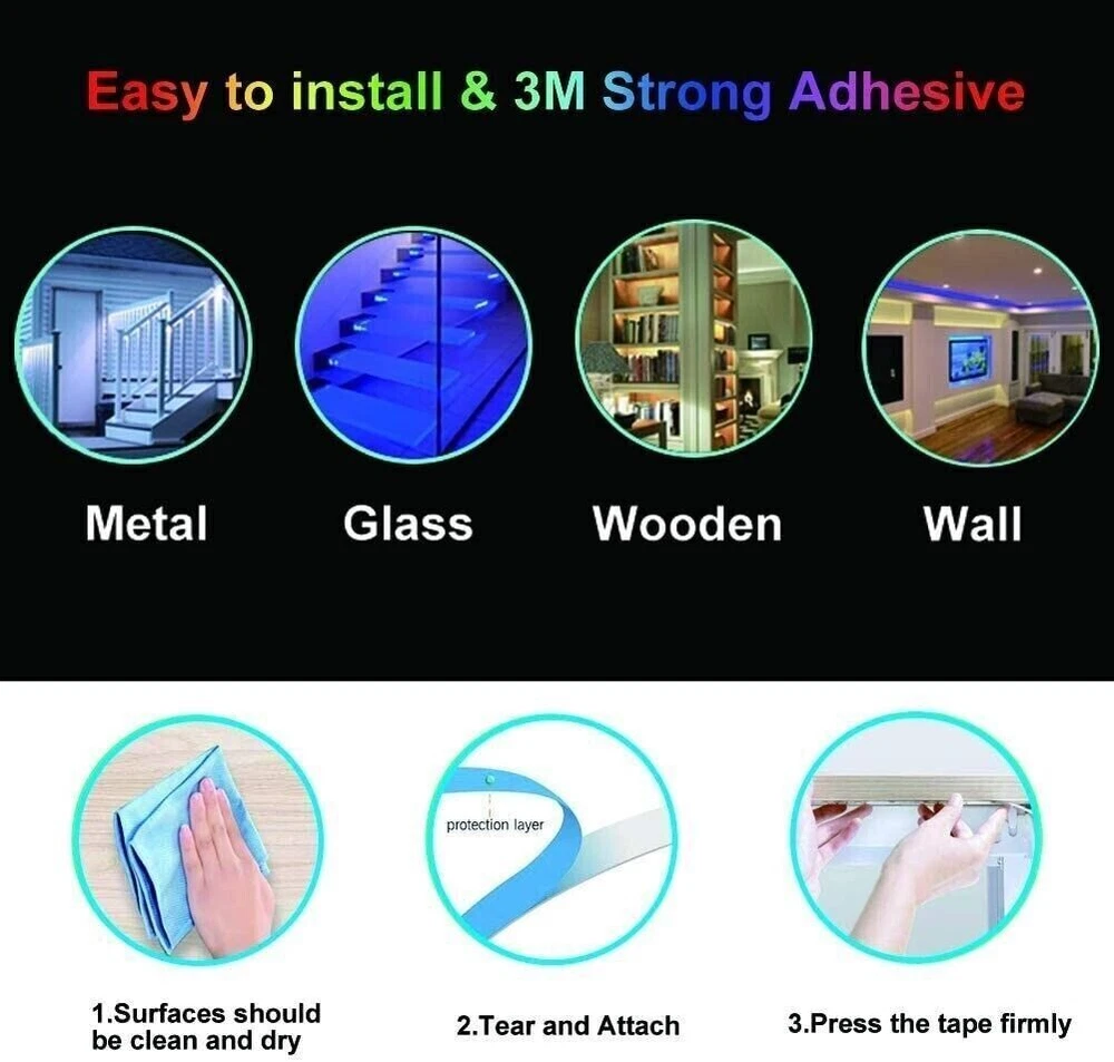 Flexible Strip Light 32ft LED Strip Lights Product Features: 【Multiple Choices LED Strip Light】: This RGB Led strip lights kit can change colors and speed automatically and periodically. It has not only RGB(Red, Green, Blue), 20 multicolored options, but also has DIY selection to create your great led mood lighting. 【Easy Installation and Use】: Led tape lights is cuttable between every 3 leds. You can cut off extra strips to adjust to a proper length. 3M self-adhesive tape can be fit on any dry and flat surface. Flexible to install anywhere you want. 【Connectable And Cuttable】: Strong sponge double-sided tape installation, super viscosity, just plug in all the parts and peel off the protective layer, then stick to the clean and flat surface. These light strips can be cut on all 3 LEDs along the cutting marks without damaging the rest. 【Safety LED Strip Lights】: This led strip light provide 12V/5A power supply no worry about prevent electric shock, short circuit etc, we promise it will provide a safety environment for your. 【Widely Application】: Low Power Consumption. The working voltage is 12V. Extremely low heat. It is touchable and safe to children. The strip lights can be used indoors decoration. Ideal for TV, home, bar, shop, etc.
