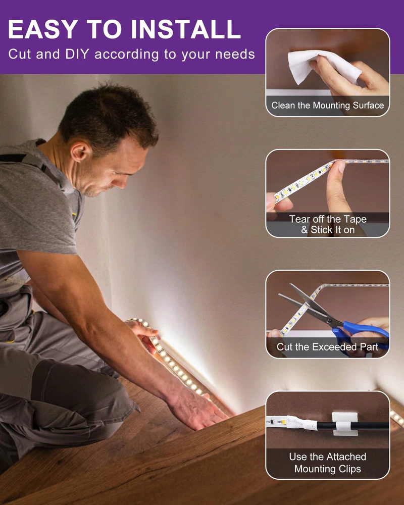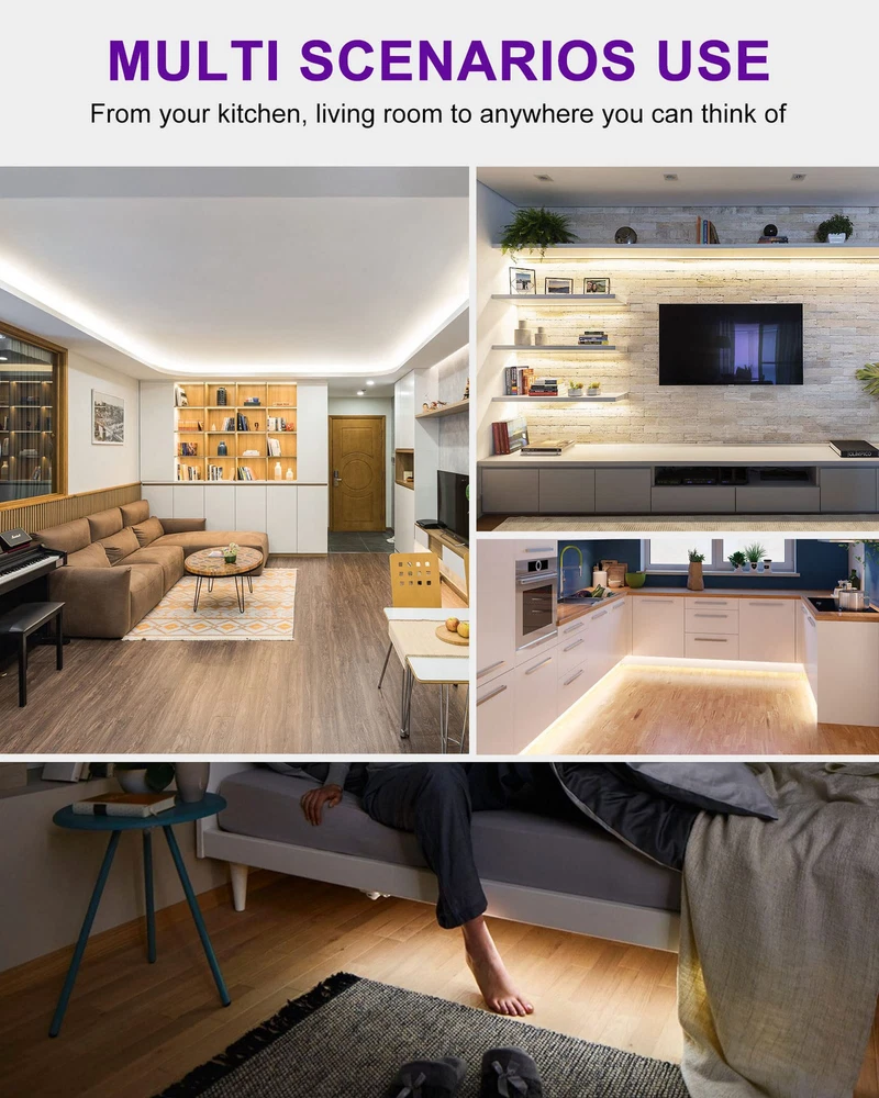 WHAT YOU'LL NEED: You will need a 12 volts Power Supply to light up your lights, or choose a dimmable driver and wire lead connector to customize your personalized lighting projects. (They are sold separately) HIGH DENSITY LED STRIPS: Made of double sized PCB board (2835 chips), making strips more durable and reliable for long-term use. With a lifespan of over 60,000 hours. These discreet strips feature closely packed LEDs for smooth, even light without any spots DIMMABLE AND FLEXIBLE: Our 4000K white LED tape light can be dimmable with a compatible dimmer. They are perfect for various indoor/interior uses including under cabinet lighting in kitchens, ambient accent lighting in bedrooms, toe-kick lighting in hallways, or adding a backlight source for vanity mirror, decorations, bookshelves SIMPLE AND EASY TO USE: Our 12v LED light strips come with a strong 3M self adhesive backing, quick and easy to install right out of the box, no soldering electrical experience or tools required. And they last for years with minimal power requirements. They are cuttable and connectable: just use scissors to cut along the cut lines, and compatible with our 10mm connector accessories SHOP WITH CONFIDENCE: UL Listed and 60,000 hours lifespan (10 hours/day for 16 years). Contact our US-based customer service team anytime for hassle-free troubleshooting and replacement or for any questions about purchasing or installation SPECIFICATIONS: Length: 24.6ft/7.5m; Strip Width: 10mm/0.4in; Input Voltage: DC 12v; Rated Power: 60 watts; 900 LEDs/reel; CRI(Ra): 90+; IP30 Rating(indoor use only); Packing List: 12V LED Strip Light x1, 10mm Wire Lead Connectors x 2, Mounting Clip x 1, Cleaning Wipes x 1, User Manual x 1 Please note that packaging may change without prior notice, but rest assured, our commitment to quality remains constant. Please note that accessories recommended by Amazon system in the "Frequently Bought Together" box may not be accurate. Please double check the light specifications to ensure that the items you are buying together are compatible