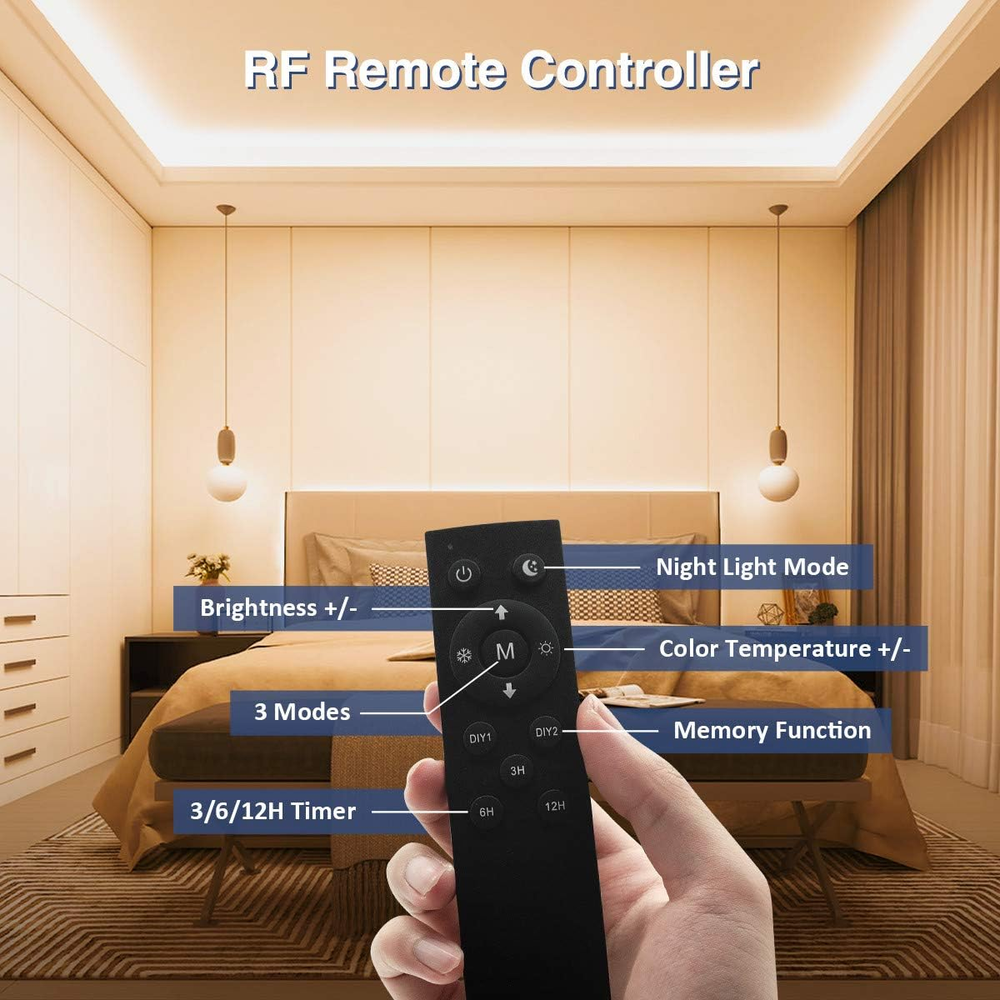 Store New Arrivals Add to Favorite View Feedback Contact LED Strip Lights White 52.5Ft 24V Dimmable 3000K-6000K LED Tape Rope Light with Remote Flexible 2835 LED Ribbon for Kitchen under Cabinet Mirror Room Indoor Home Daylight Warm White Description Item model number ULS-A Light Source Type LED Style decoration/home/bedroom/livingroom/kitchen Number of Items 1 Power Source Corded Electric Number of Light Sources 2835 Control Method Remote Theme Movie, Music, Neon, Christmas Tunable White LED Strip Lights, Fantasy, Halloween Batteries Included? No Assembled Height 0.1 inches Controller Type Remote Control Batteries Required? No Wireless Communication Technology Radio Frequency Product Dimensions 624 x 0.4 x 0.1 inches Material SMD/1920 LEDs Assembled Width 0.4 inches Seasons All Seasons Number of Batteries AAA batteries required. Included Components RF Remote*1, User Manual*1, Power Adapter*1, Controller*1, 26FT LED Strip Lights*2 Item dimensions L x W x H 624 x 0.4 x 0.1 inches Bulb Features Dimmable Indoor/Outdoor Usage Indoor Material Type SMD/1920 LEDs Light Color White Water Resistance Level Not Water Resistant Item Weight 10.9 ounces Connectivity Technology Radio Frequency Occasion Christmas, Bedroom, Father's Day, Congratulations, Birthday Special Features Adjustable Special Feature Adjustable Part Number ULS-A Color Temperature 6000 Kelvin Color White Wattage 36 watts Batteries AAA batteries required. Voltage 12 Volts Plug Format US Style Assembled Length 52 Feet Luminous Flux 2750 Lumen Size 52FT 24V Safe White LED Strip & Long Life: Low heat generation and low voltage of 24V. The tunable white led strip 26ft*2 is touchable and without danger. The dimmable LED strip lights of 52ft is UL & FCC listed for safety and quality assurance. The power supply is UL certified and thus guarantees a long service life. Please as soon as possible if you have any problems with the item. We will find the best solution for you within 24 hours. Dimmable White LED Strip & Multimode: The color temperature for the led strip lights is adjustable from 3000K-6500K (a total of 10 levels). You can flexibly switch between warm white, daylight and cold white. There are separate buttons to control multiple modes. Timer & extra DIY Buttons with memory function. Super Bright & Dimmable: Ustarus light strip 24v adopts new 2835 LEDs as conventional 3528 LEDs, guarantees higher brightness, nicer light, better heat dissipation. 1920 LEDs that can be dimmed from 10% to 100% provide you with sufficient light power from 10 levels of brightness. Please kindly note that you cannot dim the light without a remote. Easy Installation & can be shortened: Please clean the wall and keep the wall dry before installing the led strip lights so that the led tape could be adhesive to the walls. Multiple functions are adjustable by one button, easy to use. The LED tape can be cut at the marked points. Please search for “2835 4 pin connector” for a re-link. Practical 360 ° RF Remote Control: RF can control longer distance (up to 15M) than IR. It can also penetrate an obstacle. You can control the white led strip in every corner of the room. One Ustarus remote control connects to only one LED strip. Ustarus led strip lights is compatible with smart plug. Product Description • Ustarus is a company that focuses its activities on getting involved in the field of lighting for houses. • We are committed to creating excellent lighting for global families through constant innovation, dedicated work and excellent products. Why 52FT Ustarus LED light strips? When you need 50ft led strips • Voltage is only DC 24V. Thanks to the excellent heat dissipation, the LED light strip can be touched. There is no danger! • You can use the white led strip in cars safely. • No lead or mercury, no UV or IR radiation. • Adopted high quality LED 2835 with low heat generation ensures long life up to 50,000 hours. • 10 Brightness & 11 color temperature 100% security & non-toxic Durable Flexible operation Easy handling Warm white + natural white + daylight + cold white Widely used in hotel, kitchen, living room, architectural decoration, security and emergency lighting. Shortable & Foldable Please shorten the 2835 led strip directly along the marks. The thickness of the white led tape is about 0.4mm. This is convenient for you to bend the light strip at will at the corner. Connetor & Extension Wire Please search for “2835 4 pin connector” as keywords for the re-link. All extension wires suitable for 10mm, 4 pin connectors can be used for connection. 4 Steps to Install 1. Clean the surface; 2. Remove the adhesive; 3. Paste and press for 10 seconds; 4. Turn on the led strip lights. Package Inhalt 2X 26ft Dimmable White LED strips; 1X Upgraded RF remote controller, 1X ETL Listed power adaptor; 1X Controller Cable, 1 x User Manual Specification: Wattage: Max. 32W; LED Quantity: 1920 LEDs Color Temperature: 3000-6500k adjustable Color: warm white, daylight white, cool white Working Voltage: 24V; Protection Rating: IP20 Length: 16m/52ft; LED Type: 2835 Versatile Application You can decorate and light up your kitchen, living room, bedroom, TV background, mirror, door, wall, stairs, ceiling, cabinet, etc. Used to create a warm atmosphere and environment (wedding, birthday, party, bar) during the festival. Interior lighting Ideal for illuminating kitchens, cosmetic mirrors, dining tables, bays, benches, shelves or wardrobes or for commercial applications. Wherever you have a port, you have brilliant LED lighting in your home. Decoration Decorate your bedroom so that you have a restful and relaxed environment. The number of possible uses of the LED light strip is only limited by your imagination. DIY LED light strips are flexible and can be bent into any desired shape. Let your imagination run wild and create your own fairy lights. (Attention: Children must be accompanied by adults) The remote controller can control either one or many strips accordi