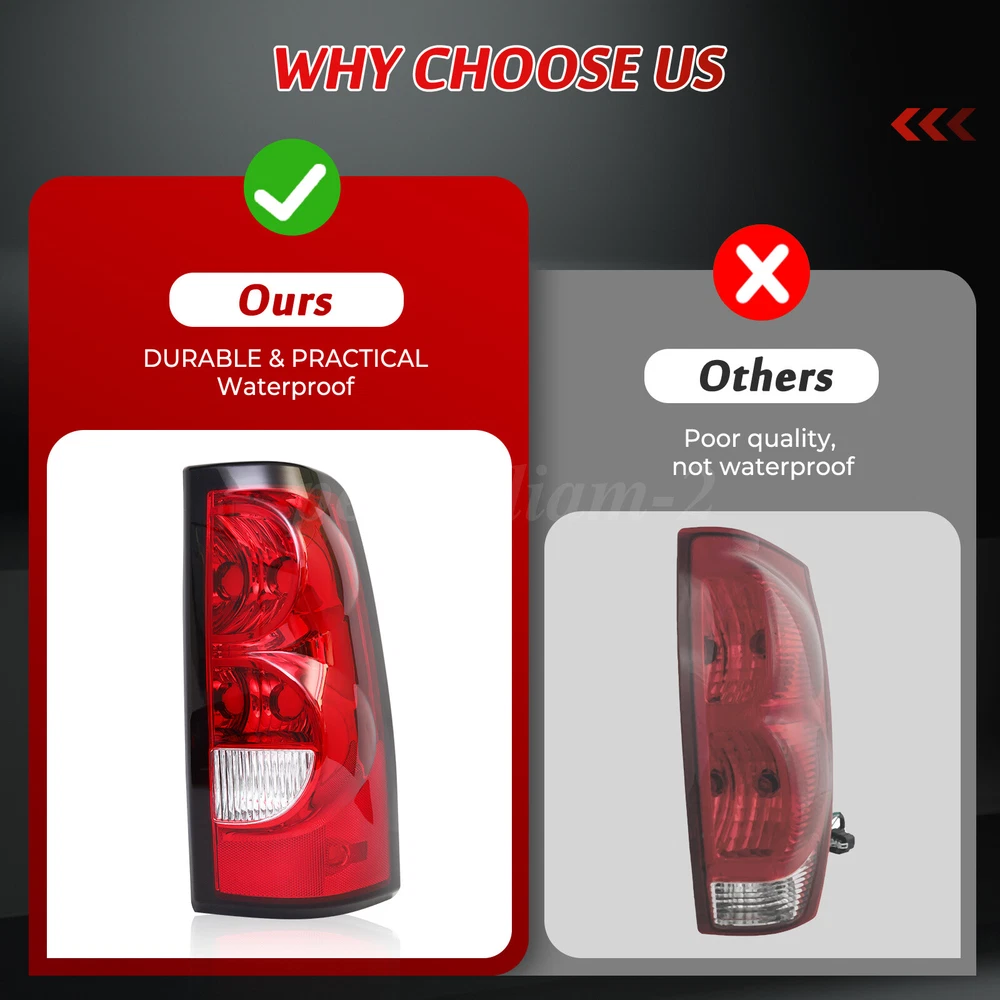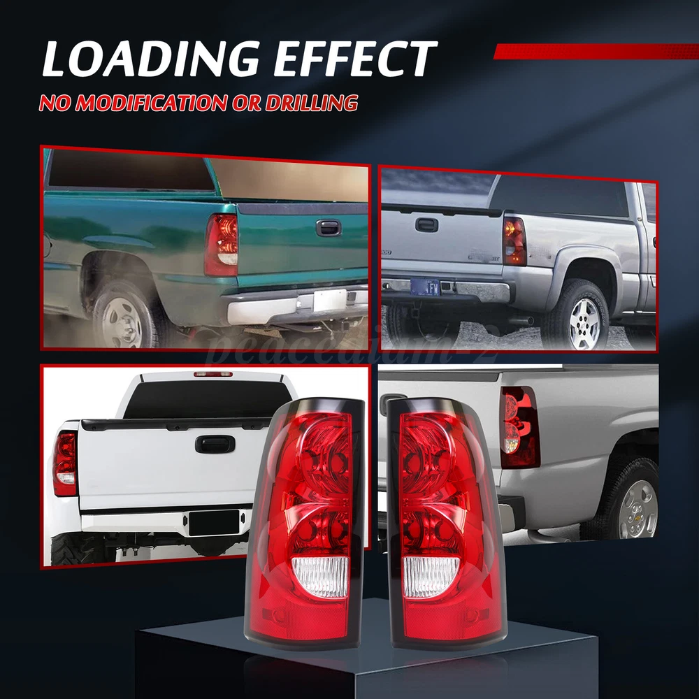 Tail Lights Pair for 1999-2006 Chevy Silverado 1500 2500 3500 99-03 GMC Sierra PRODUCT DETAILS Description: This tail light assembly is the ideal choice for drivers, renowned for its excellent performance and convenient usability. Designed with genuine OEM components, it ensures a perfect fit for your vehicle, allowing for direct replacement without any delays. In adverse weather conditions, its high brightness and strong penetration ensure clear visibility, providing peace of mind during nighttime, rainy, snowy, and foggy driving. Rigorous quality control measures guarantee that each tail light assembly meets national standards, enhancing your driving journey with safety and comfort. Upgrade your tail lights now and turn every drive into a pleasurable experience! Specification: Type: Tail Light Assembly Bulbs: Bulb and Wiring Harness Not Included Light Type: Halogen Housing Color: Chrome Lens Color: Red Border Color: Black Reverse Light Bulb: 3157 Turn Signal Light Bulb: 3157 Housing Material: ABS Plastic Lens Material: Polycarbonate Color: Chrome Housing + Red Lens Condition: 100% Brand New Installation Position: Left Rear, Right Rear Usage: Direct Replacement OE/OEM Part Number: GM2800174(Left), GM2801174(Right) Superseded Part Number: 19169004(Left), 19169005(Right) Features: 【Genuine OEM Components for Direct Replacement】Any issues with tail lights during your drive can potentially affect driving safety. Therefore, this tail light assembly uses genuine OEM components to ensure a perfect match with your vehicle. Simply replace when needed to keep your driving path clear. 【Sold as a Pair, Left and Right】Ensuring practicality and enhancing your driving experience, this tail light assembly is provided as a pair for the driver's side and passenger's side (left and right), ensuring comprehensive safety for both driver and passengers. 【Safety Assured in Adverse Weather】During heavy rain, snow, fog, and nighttime driving, impaired visibility is a major concern for every driver. This tail light assembly features advanced optical design with high brightness and strong penetration to provide clear visibility in adverse weather conditions, making your driving safer and more confident. Compatible Vehicles: For 2003 Chevy Silverado 1500, 1500HD, 2500, 2500HD For 2004-2006 Chevy Silverado 1500, 1500HD, 2500, 2500HD, 3500 For 2007 Chevy Silverado 1500 Classic, 2500HD Classic, 3500 Classic Fleetside Bed Models Only Package Contents: 2pcs (Pair) Tail Lights(NO BULB, NO HARNESS) Without Wiring Harness and Bulbs Note: 1. Please confirm if it fits your vehicle before purchasing. 2. Before driving, check if the installation is secure to ensure driving safety. 3. Due to differences in monitors and lighting, the product images may slightly differ from the actual product. 4. Installation instructions are not included; professional installation is strongly recommended. PAYMENT We only support transactions on the ebay, do not support offline or private transactions. Please make sure the address is accurate before you pay. SHIPPING We do not ship to PO Box, Alaska/Hawaii, APO/FPO, and US Protectorates. Item(s) would be shipped out within 1~2 working days after received your confirmed payment. Weekends and holidays are not working days. We will choose different warehouses according to the customer's address and item stock, shipped from CA and PA in the United States. RETURN Buyers may return or exchange an item which damaged within 30 days. eBay & PayPal money back guaranteed. CUSTOMER SERVICE We are committed to provide the best purchase experience for our customers. If you have any questions, just feel free to contact us, we respond queries within 24 hours in business days. On Jan 14, 2025 at 20:11:23 PST, seller added the following information: On Feb 20, 2025 at 02:53:11 PST, seller added the following information: On Mar 26, 2025 at 17:23:17 PDT, seller added the following information: