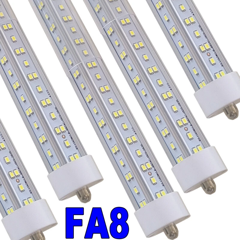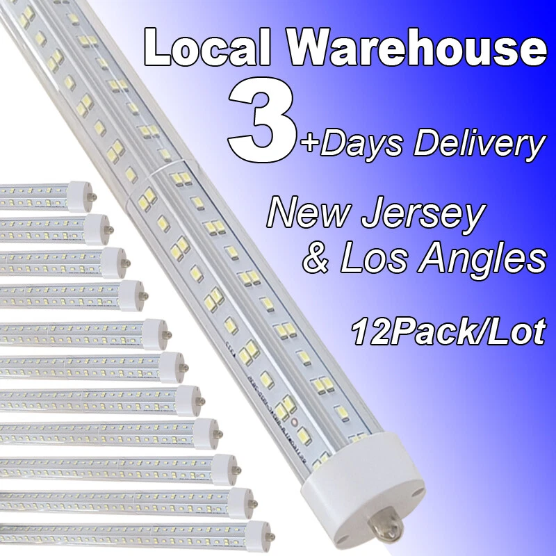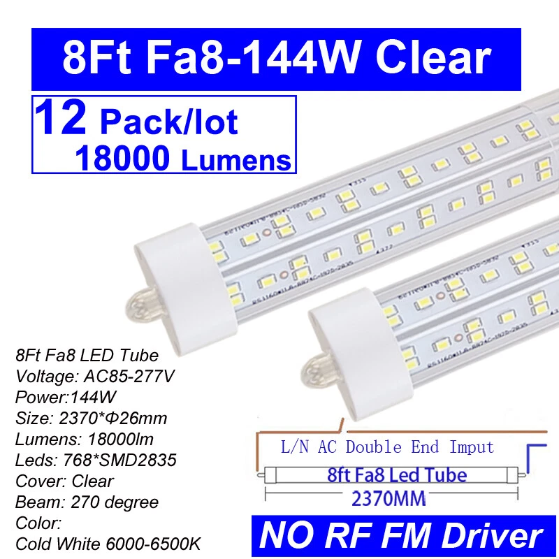 FAST DELIVERY - Ship from New Jersey or Los Angeles Warehouse via FedEx , 3-7 Days Delivered Your Door . SCIENTIFIC DESIGN - 8Ft LED Shop Lights Fixture is Made of 6500K Cold White SMD2835 LED Chip ,Plastic Clear Cover , Aluminum Bracket Housing ,and AC85-277V Constant Current Driver . It can work in -68F to 120F Temperature Conditions EASY INSTALLATION - The Integrated Tube Fixture Can be Install on Wall or Ceiling ,Easily Replace Traditional Fluorescent Tube Bulb . Plug and Play , Free Accessories (Power Cords, Connector , Extension Cords , Clip and Screw ) Come with Tube Lights Together WIDE APPLICATION - Linkable 8Ft Bulbs Widely Used in Garage Ceiling , Barbershop , Schools, Hospitals Basement , Factory Warehouses , Supermarkets Cooler Door , Offices, Shops,Hotels, etc LED Tube Light 8FT 144W T8 Single Pin FA8 Base Double Side V Shaped LED 12PCS 【No RF & FM Interference】LED Driver have passed Electromagnetic Magnetic Compatibility EMC tests,No cause EMI ,No longer subject to any RF & FM jamming. Never interfering with the signal of your garage roller shutter door,No make noise when you listen radio 【Easy to Install】Just simply bypass the ballast and connection AC85-277V AC power . Not compatible with single-ended powered sockets 【Wide Application】 - 8Ft 144W V Shaped FA8 HO LED Bulb fitted to replace traditional F96T12 T8 T10 T12 fluorescent bulbs. Widely used in Garage,supermarkets, offices , convenience stores , gas stations , warehouse,parking lot,shops, hotels,Refrigerator,coolers or freezers illumination,etc 【High Output】8Ft 144W 18000LM FA8 【Rotate Cap & Swivel End】 Easy Adjust rotated Lighting Direction within 180 degree after Installation