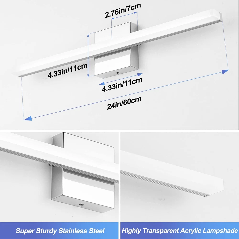 MODERN BATHROOM LAMP: Upgrade your bathroom with the sleek and modern design of this 14W/24Inch lamp. It provides 1250LM of natural white light at a color temperature of 6000K, offering a softer and comfortable atmosphere. Please note that it is not dimmable and is controlled by a common switch. HIGH-QUALITY CONSTRUCTION: The bathroom wall light over the mirror is crafted with a durable stainless steel base and acrylic material, ensuring long-lasting performance and preventing rust. PREMIUM LED INTEGRATED: Equipped with premium 2835SMD, this bath lighting fixture delivers brilliant light while protecting your eyes and eliminating any flash. It also features short circuit protection for enhanced safety. Additionally, its energy-saving design contributes to save your money on electricity bills. AUXILIARY LIGHTING: Please note that this light serves as an auxiliary source and is not intended to provide enough illumination to light up the entire bathroom. However, it is perfect for adding extra brightness and enhancing specific areas, such as mirrors or vanity spaces. WIDE APPLICATION: This mirror light is versatile and suitable for various applications, including bathroom lighting and makeup application. It can be installed in toilets, bathrooms, bedrooms, mirror cabinets, and other similar scenarios. IP44 ANTI-FOG: The body of the restroom light fixture is specifically designed to resist fog and water vapor in the bathroom, ensuring clear visibility. It is built to withstand the humid environment and maintain optimal performance. Please note: if using with a dimmer switch will cause stroboscopic Flicker, please use a GENERAL switch(Not included in the package)