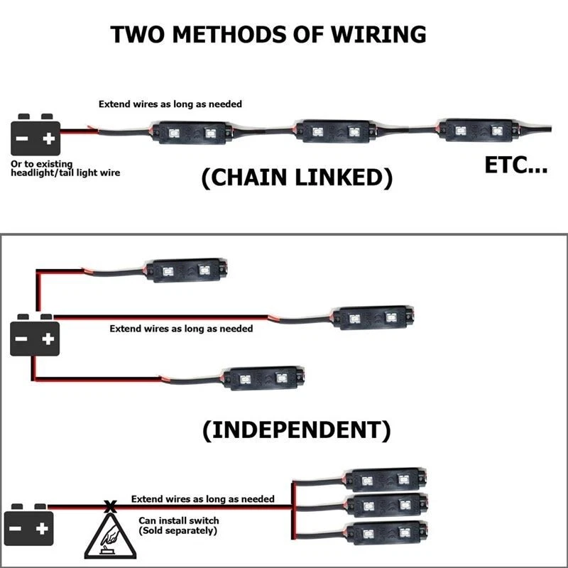 ORDER INCLUDES: 4 Individual LED POD Lights in the color of your choice. These LED light pods include 12v DC current with either COOL WHITE or WARM WHITE color temperature. - 12v DC - POD Wire Length: 1 side 30cm (under 1ft) 1 side 90cm (under 3 ft) - Cool White or Warm White color options - 3 LED Chips for more brightness than the 2 LED pods - They include 4 independent LED pods you can wire together in PARALLEL or in SERIES as shown on the pictures with your own power source, optional On/Off switch. They are universal for any vehicle including pick up trucks, 18 wheelers, regular cars, motorcycles, options are endless, that's why we offer 4 pack. You just need to connect your own power source and/or on and off switch. We made these LED pods with 20 gauge wire with a wire protective sleeve on both sides, bare tips ready to connect to each other in 2 ways, connect the pods in series or parallel, see picture diagram for this. They are splash proof, can sustain water splashes for example when you wash your car. The pods also come equipped with very good quality 3M stick pad on the back to stick the pods in many flat, clean surfaces and screw holes to use screws for more secured installation. PLEASE NOTE: These 4 individual LED pods do not include a power supply or a relay on/off switch, you can wire them to any power source like side markers, DRL (Day Time Running Lights), fog lights, tail lights or to your own on/off switch. Do not recommend wiring them straight to car battery because the lights will get constant power from your battery and can drain it.