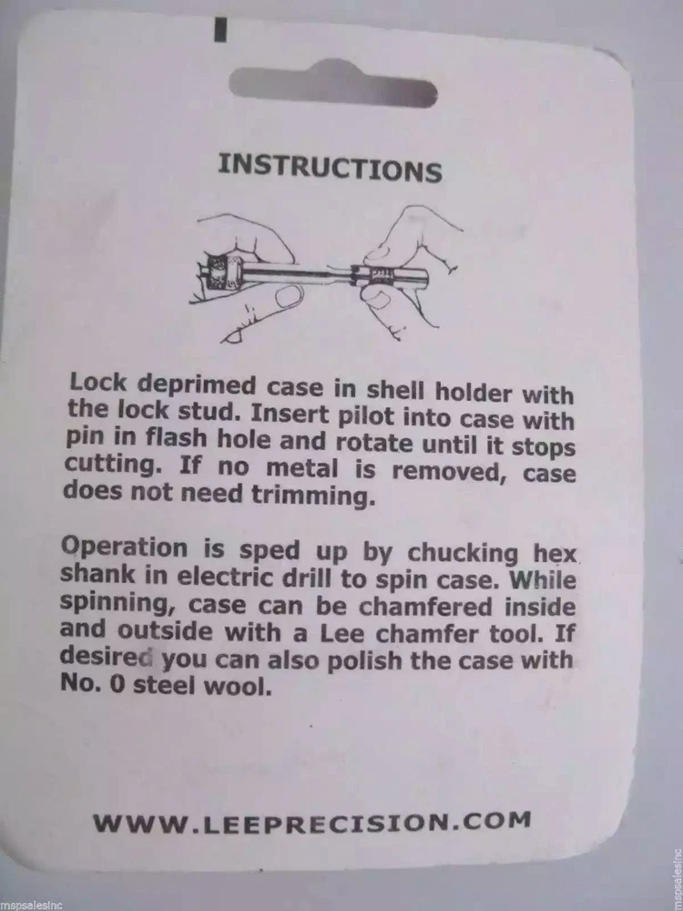 Cutter & Lock Stud Use the Lee Cutter and Lock Stud with the Case Length Gauge & Shell Holder to trim cases. Can be used by hand or with an electric drill. Works on all brass less than .475 base diameter. This item is brand new sealed in retail packaging. Fast Shipping and 100% Satisfaction Guaranteed! Any item we sell can be returned for a full refund. Backed by the MSP Sports Guarantee. If your item is lost or damaged in transit we will replace your item or refund you 100% including any shipping charges!