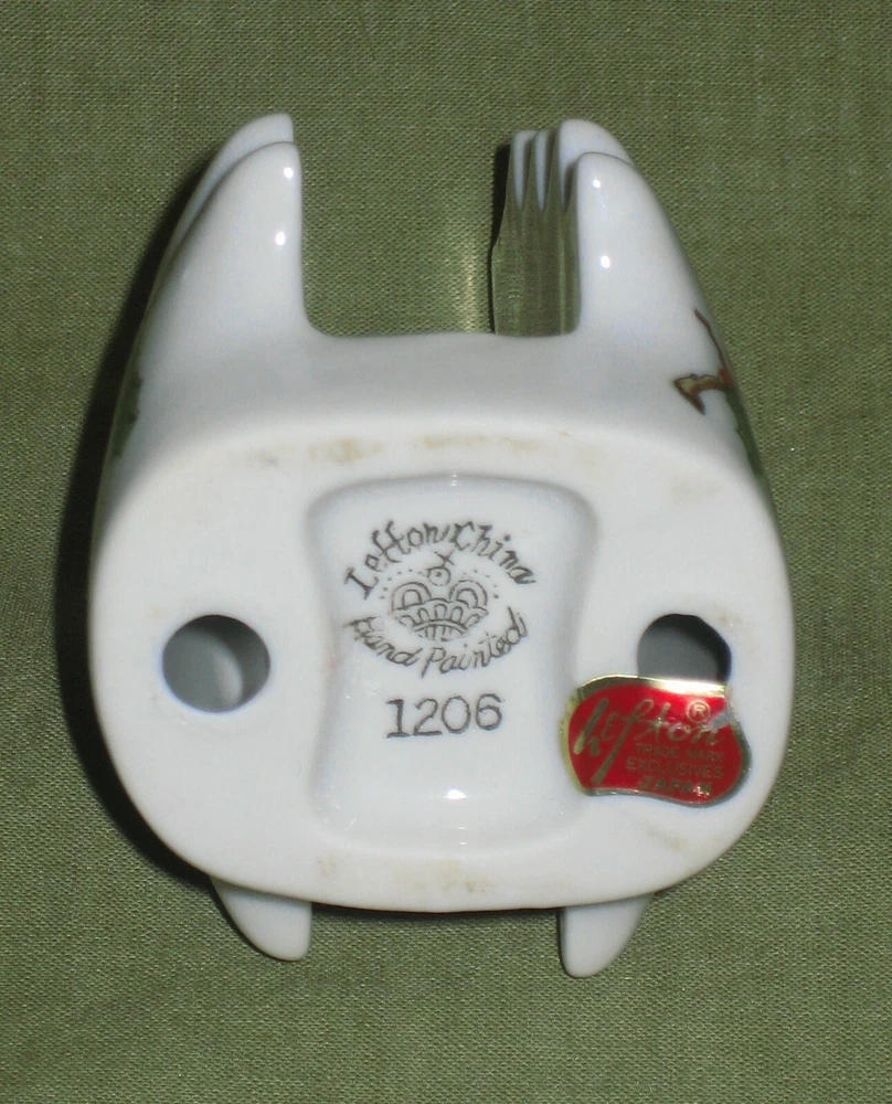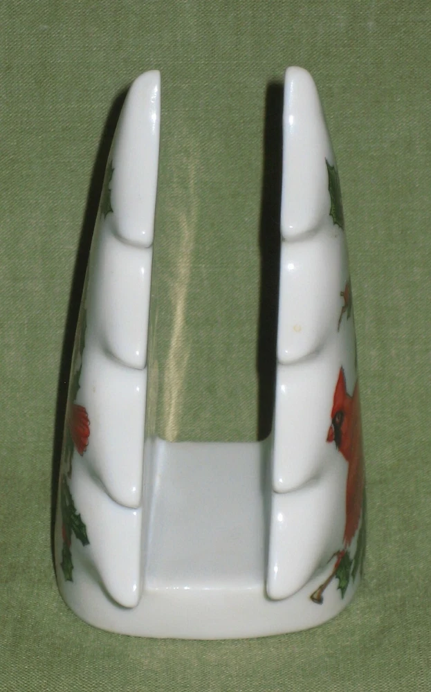 Lefton napkin holder in Christmas cardinal and holly pattern most of which was produce between 1960-1983. Red foil label on the bottom reads: Lefton Trade Mark Exclusive Japan. It is also marked in gold (thought the camera didn't catch that) with Lefton Hand Painted 1206. Image is the same on both sides. Overall condition is quite good and clean without chips or cracks. Measures 4" tall by 3" wide by 2" deep and space for napkins is 0.75". Please refer to pictures and ask any questions prior to bidding. This item will ship wrapped and double boxed to protect it from the shipping gorillas across the country. I pack items quite well - as I would want my items packed - to ensure they arrive safely. I do add a minimal handling fee to actual shipping charges. I will post your feedback asap after I receive yours to close out the transaction. I have been a seller for quite some time and do my best to describe items as accurately as possible to ensur e your satisfaction. If for some reason you are inclined to leave negative feedback, please email me so that we may resolve the issue prior to that action.