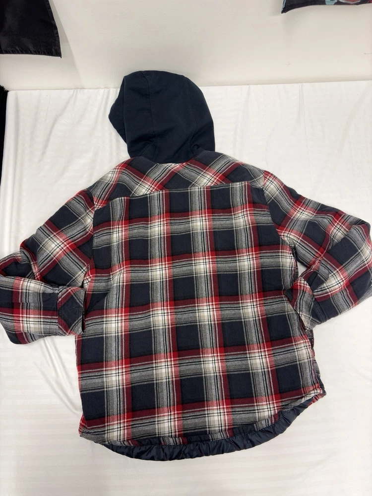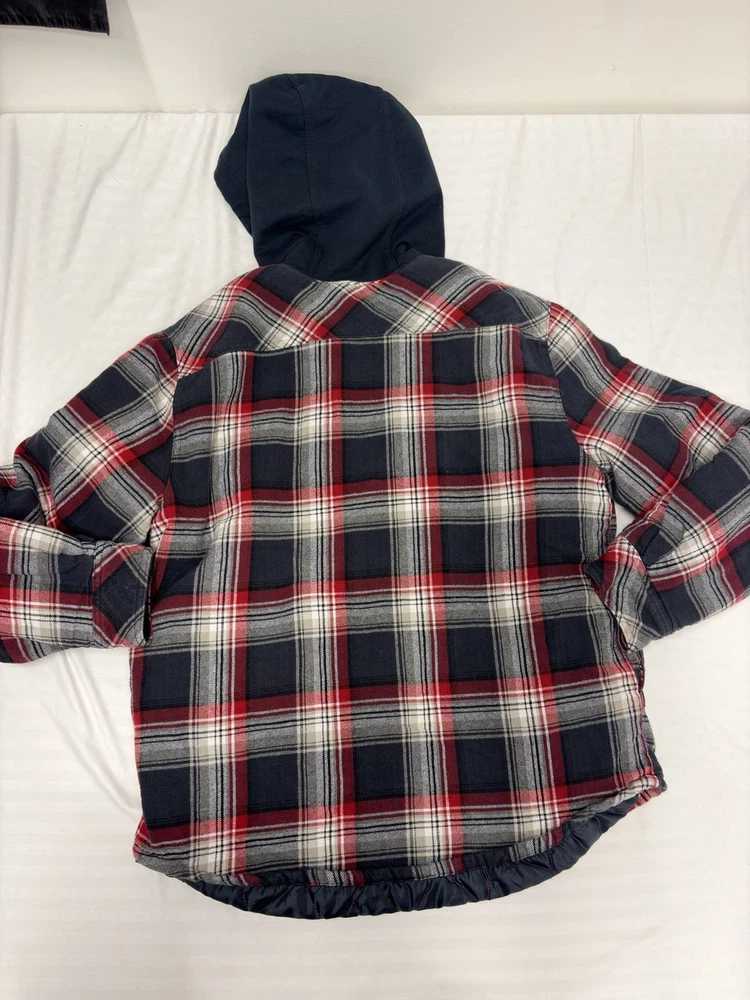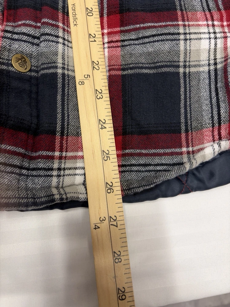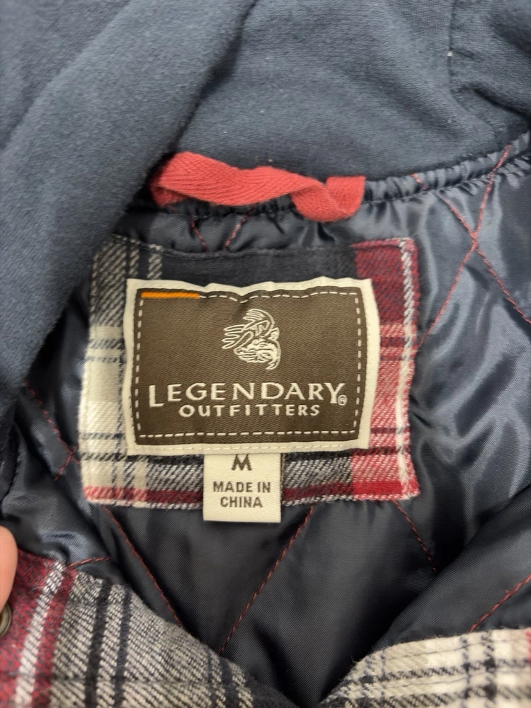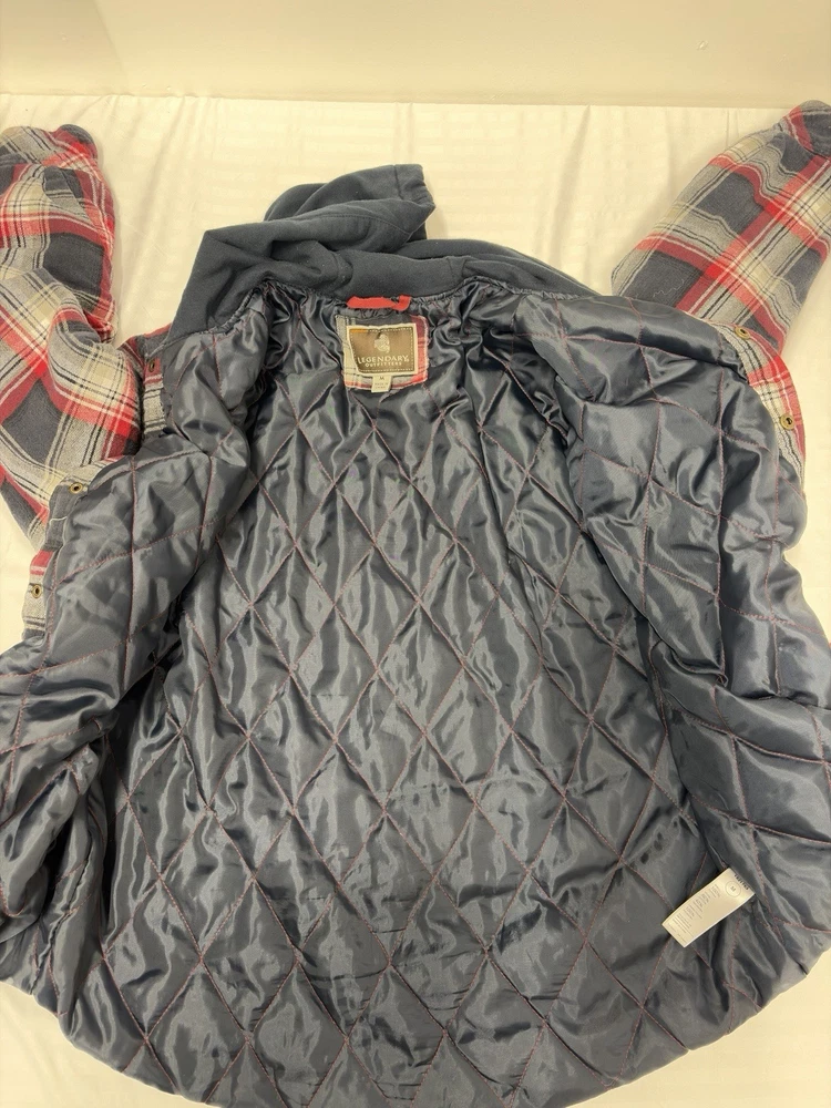 LEGENDARY WHITETAILS FLANNEL SHIRT JACKET SHACKET MENS MEDIUM QUILT LINED HOODED Red White Blue Gray Plaid Pockets, Pre owned shipped with usps ground advantage, we offer combined shipping with multiple items feel free to contact me.