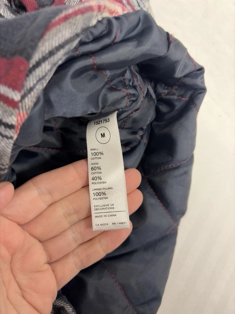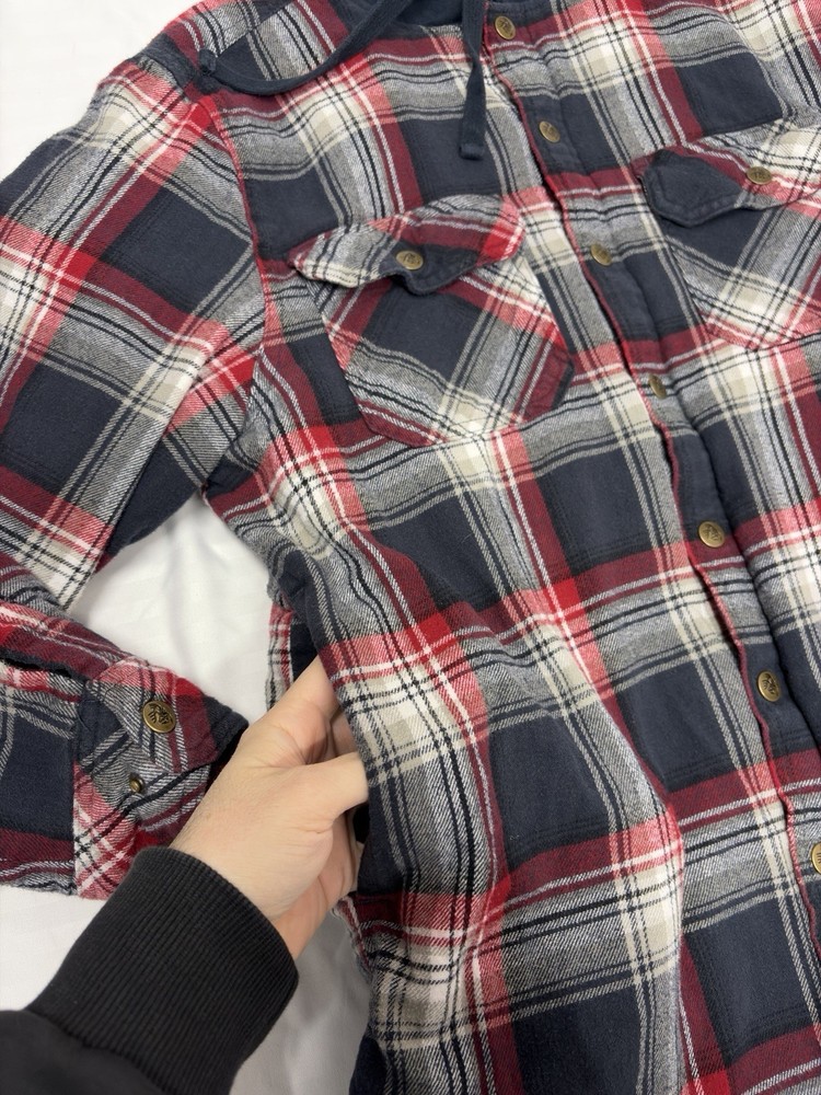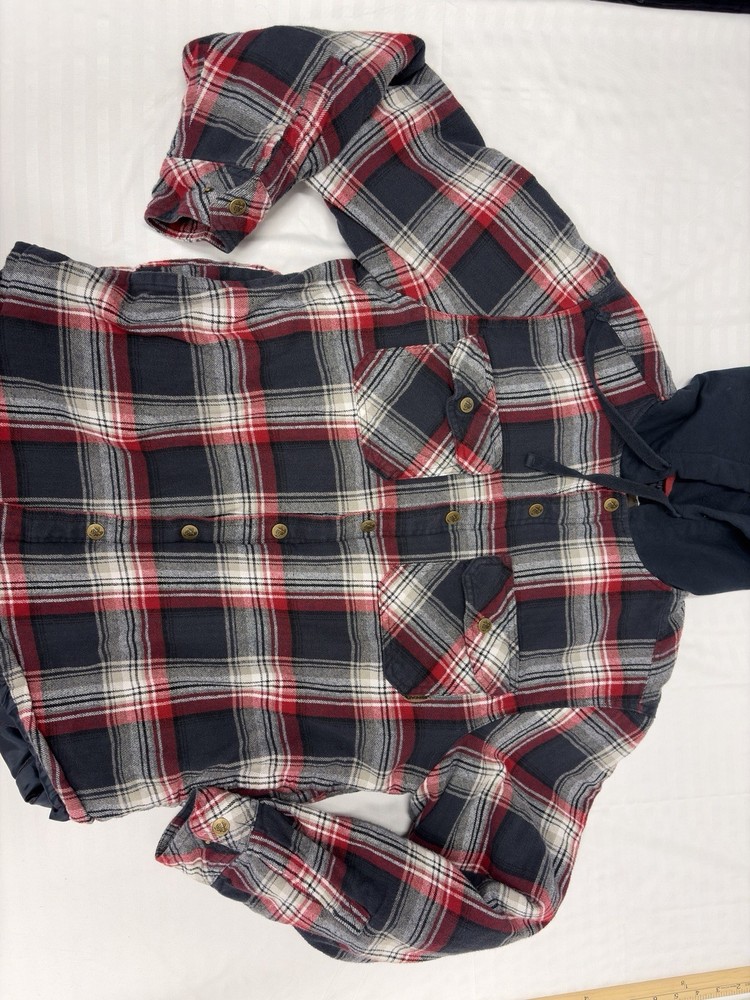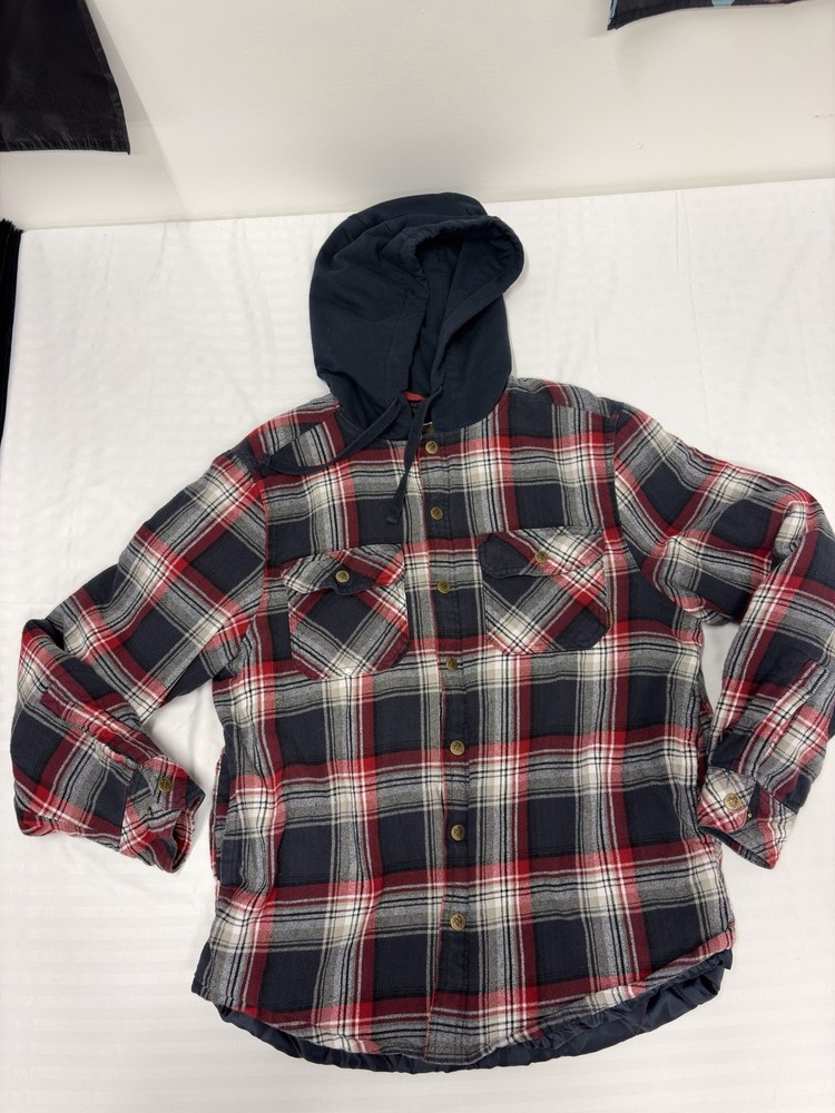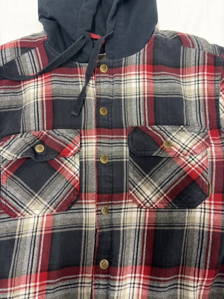 LEGENDARY WHITETAILS FLANNEL SHIRT JACKET SHACKET MENS MEDIUM QUILT LINED HOODED Red White Blue Gray Plaid Pockets, Pre owned shipped with usps ground advantage, we offer combined shipping with multiple items feel free to contact me.