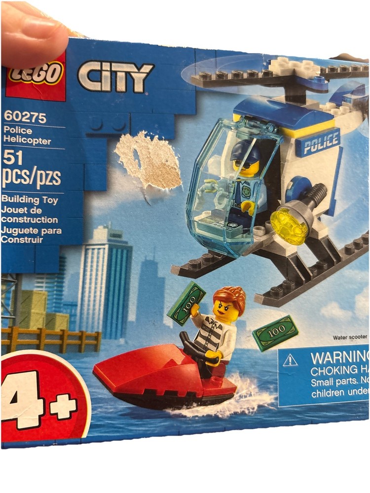 Unopened box. Box has some damage (pictured), but the Legos are just fine! The LEGO CITY Police Helicopter (60275) is a 2021 release from LEGO's CITY theme. This set includes a police helicopter with a sleek design, measuring 6.1 inches in height, 10.12 inches in length, and 6.73 inches in width. Suitable for children aged 4 and above, this set provides a fun building experience and encourages imaginative play. With the iconic LEGO brand behind it, this Police Helicopter set is sure to be a hit with fans of building toys and LEGO in general.