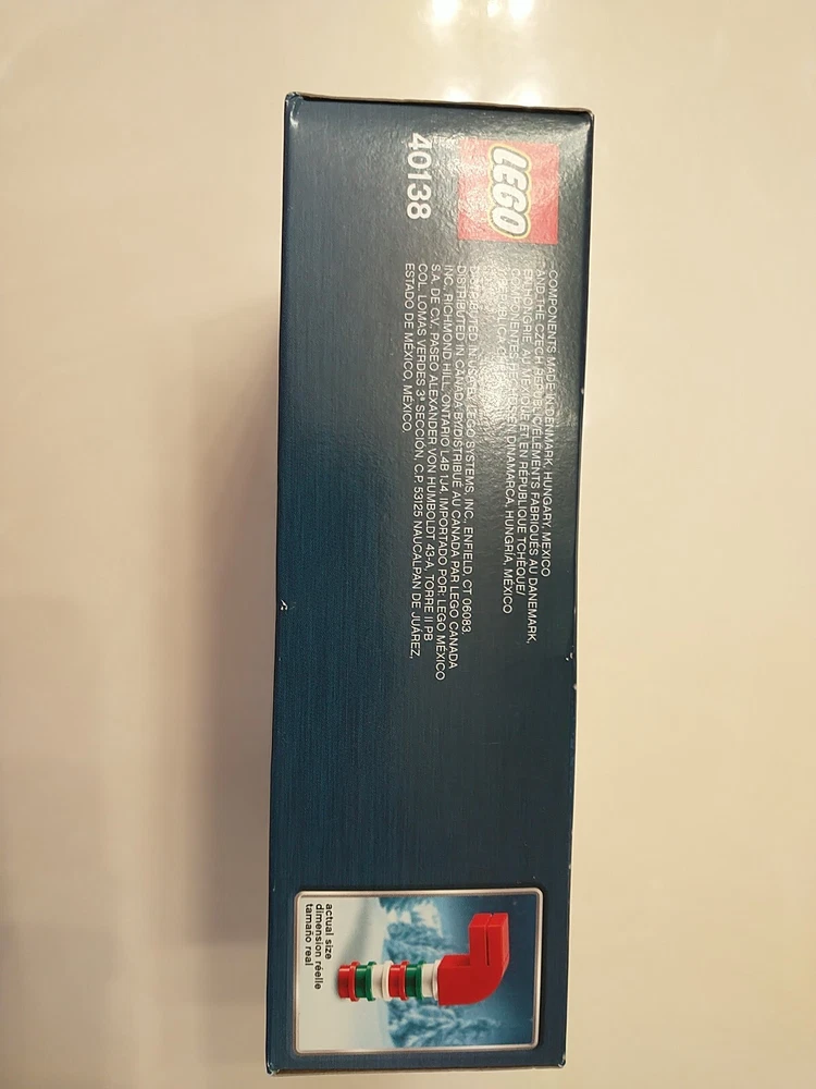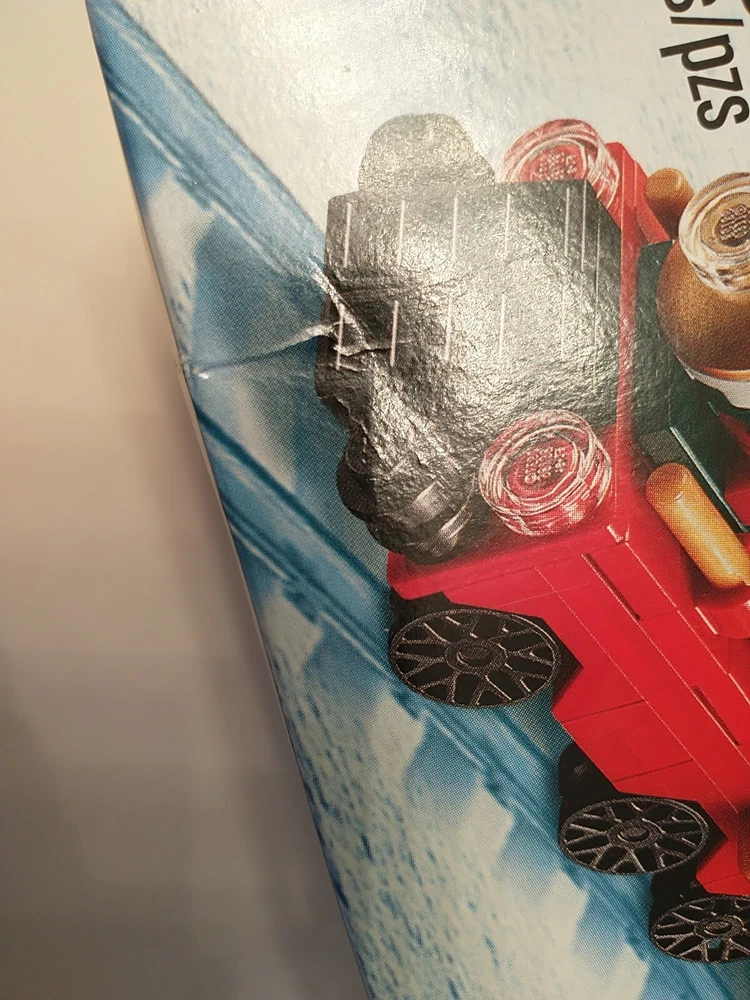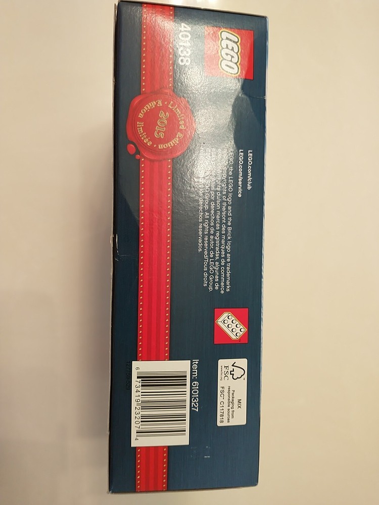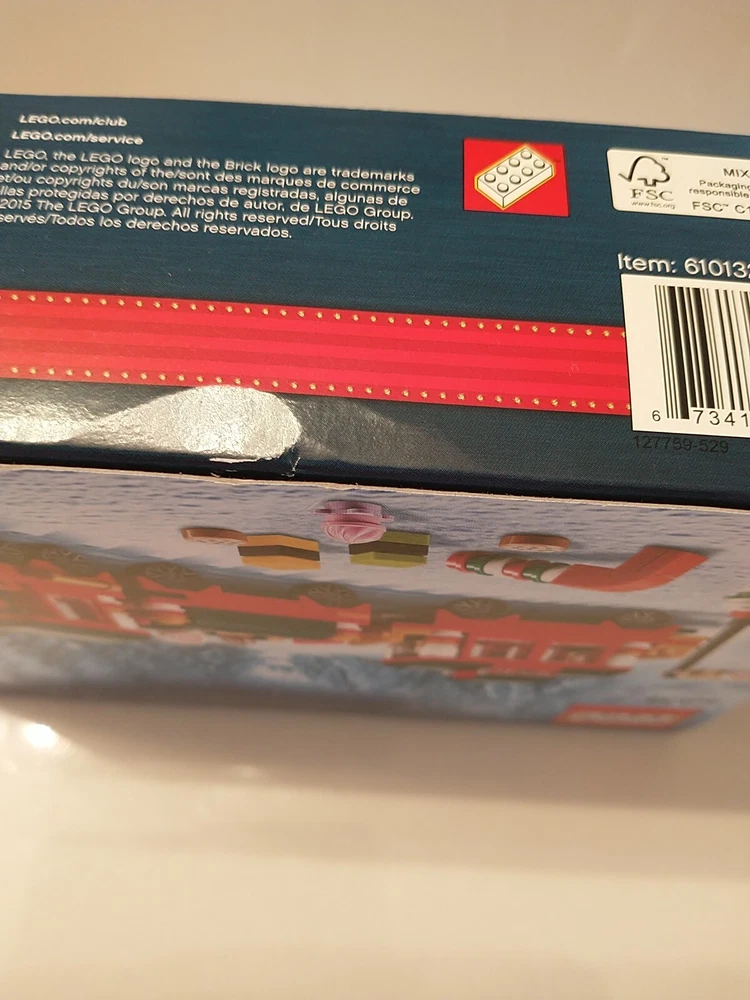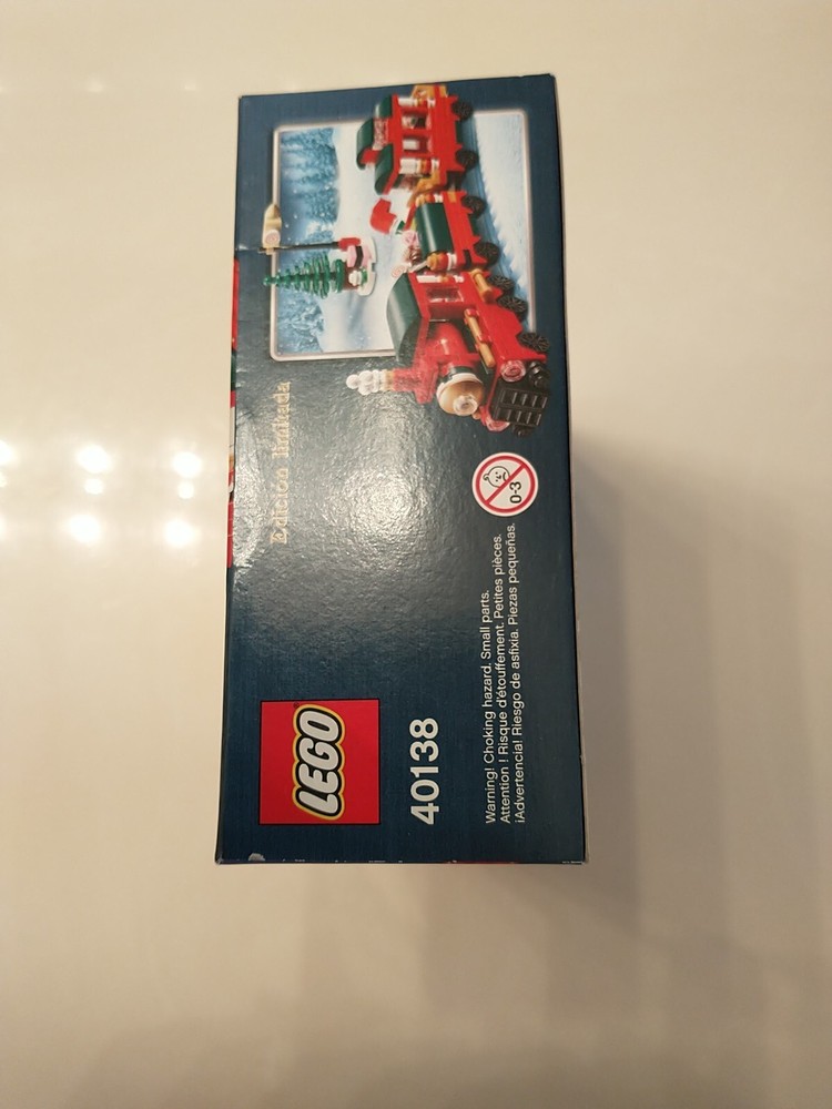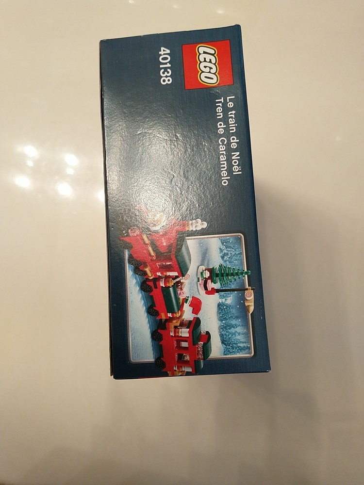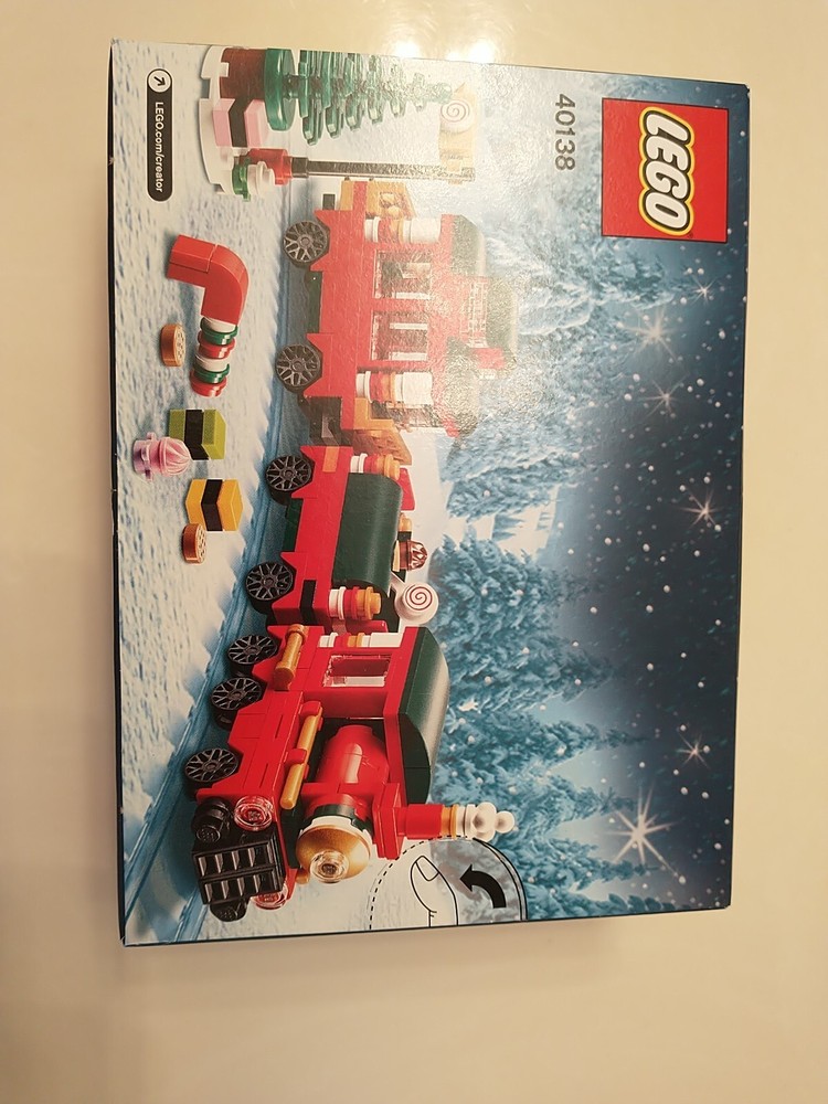 The LEGO Seasonal Christmas Train (40138) set is a retired holiday-themed LEGO set released in 2015. It contains 233 plastic pieces and is designed for builders aged 7 and up. The set includes a Christmas train model with dimensions of 7.5 inches in length, 2.4 inches in height, and 5.6 inches in width, packaged in a box. This set is part of the LEGO Christmas subtheme and appeals to those interested in seasonal LEGO sets. This Lego set has two slight creases. One near the bottom of the front of the train, and the other in the middle of the bottom face. (As shown in the pictures.)