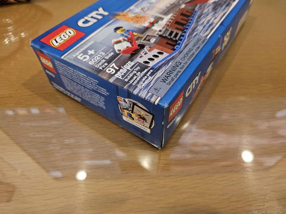 This is a LEGO City set numbered 60213, called Dock Side Fire. It includes 97 pieces and is designed for ages 5 and up. The set features a firefighter character and a boat, and is part of the Fire subtheme. Released in 2019, the set comes in a box packaging and measures approximately 11.77 inches in length, 11.02 inches in height, and 7.83 inches in width.