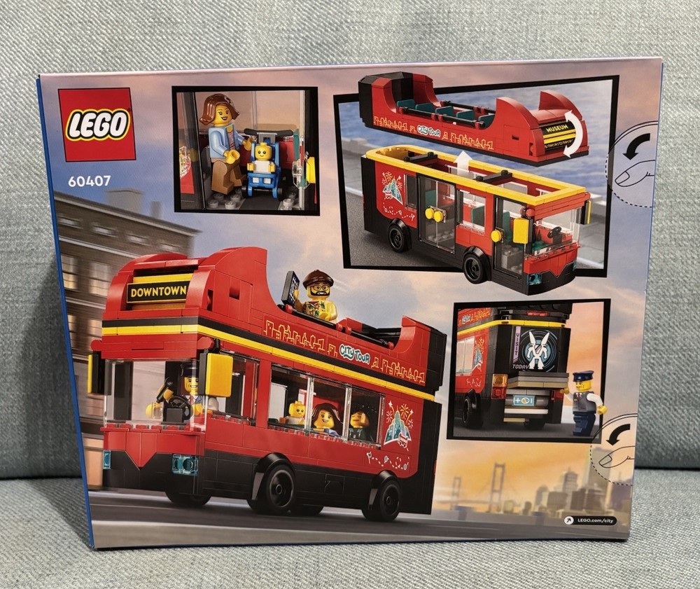 LEGO City Red Double-Decker Sightseeing Bus Toy 60407. Brand New & Sealed! Bubble wrapped & card-boarded for secure postage. Product details Treat kids to fun city tour adventures with this LEGO City Red Double-Decker Sightseeing Bus toy (60407) for ages 7 and over. Kids can rotate the destination display, pick up waiting passengers and seat them on the lower deck or open-air sightseeing deck. This iconic model is great for display and includes 5 minifigures, including a baby with a buggy, for imaginative play and storytelling. This LEGO City red-bus toy includes a step-by-step printed building guide and 3D instructions in the LEGO Builder app – a digital building companion with intuitive zoom and rotate tools that enable kids to visualise models from all angles as they build. LEGO City sets make great Christmas and birthday gifts for kids, with cool vehicle toys, realistic structures and fun characters that inspire imaginative play without limits. Kids can add this LEGO City bus to other playsets (sold separately) from the LEGO City range to expand the world of play possibilities. Product Features: LEGO City Red Double-Decker Sightseeing Bus for boys and girls aged 7 and over Double-decker bus toy with a sightseeing deck, plus 5 minifigures Kids can rotate the destination display to choose between 4 LEGO City bus stops LEGO City toy accessories include a buggy, microphone, phone and camera Give this LEGO red bus set as a Christmas or birthday gift for kids aged 7 plus Boost the play when you combine sets (sold separately) from the LEGO City range LEGO City is a place where kids can set their limitless imaginations free The double-decker bus in this 384-piece set measures over 21 cm (8 in.) long