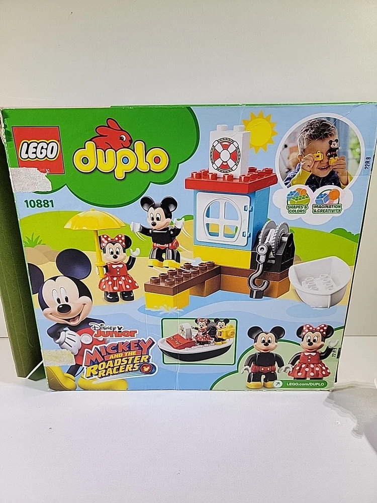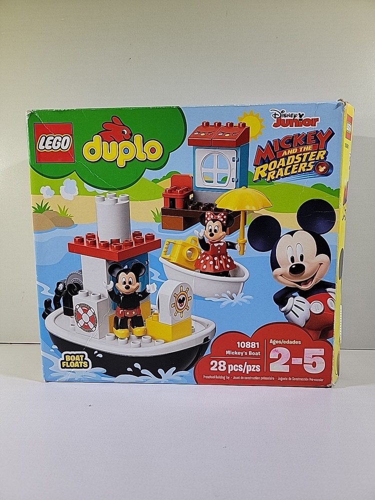 This is a LEGO Duplo set featuring Mickey Mouse and his friends from The Roadster Racers. The set includes 28 pieces and allows you to build Mickey's boat. It comes in its original packaging and is a retired set from 2018. The set number is 10881, and it belongs to the Mickey Mouse theme. The set includes both Mickey and Minnie Mouse characters and is suitable for children aged 2-5 years old. The set is made of plastic and was manufactured in Denmark, Hungary, Mexico, China, and the Czech Republic.