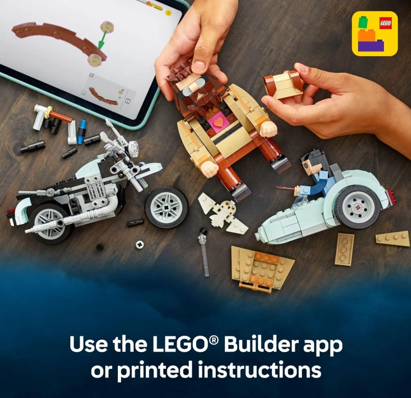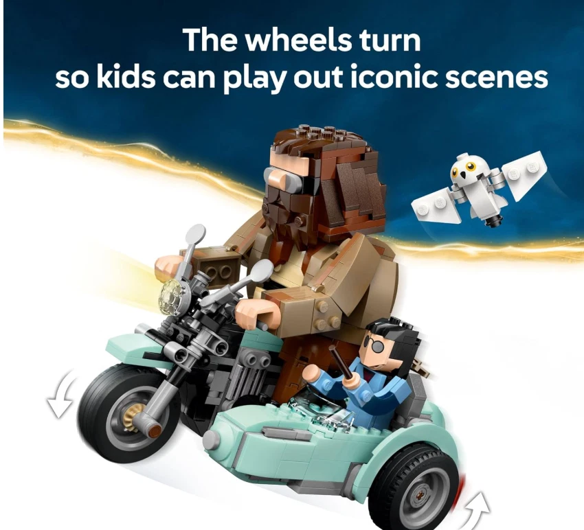Hold tight and head for The Burrow on Hagrid's flying motorcycle! Play out dramatic Harry Potter and the Deathly Hallows scenes and make your own stories with this detailed model. Drive the bike with the half-giant Hagrid and Harry Potter in the sidecar, plus Hedwig the owl on the back. Or simply display your magical creation as part of your brick-built collection of LEGO Harry Potter sets!
