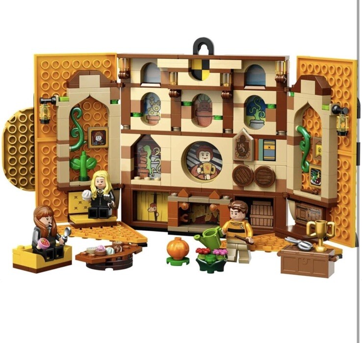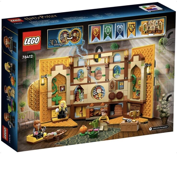 With this LEGO Harry Potter Hufflepuff dorm banner building set, kids can show off their loyalty to their house in Hogwarts with an detailed living room Construction set with minifigures by Cedric Diggory, Susan Bones and Hannah Abbott with accompanying accessories for fun role playing When the banner is opened, a detailed reenactment of the Hufflepuff living room with comfortable furniture is revealed In the plant filled pet you will find a buildable chest, a pumpkin and a table with various dining sections that give the room an authentic atmosphere A retractable lens-shaped background creates magical 3D effects like a mandragora that jumps up and down behind the curtain and a niffer hiding behind a barrel This 313 piece building toy is a perfect gift idea for upcoming birthdays or other special days in children's life