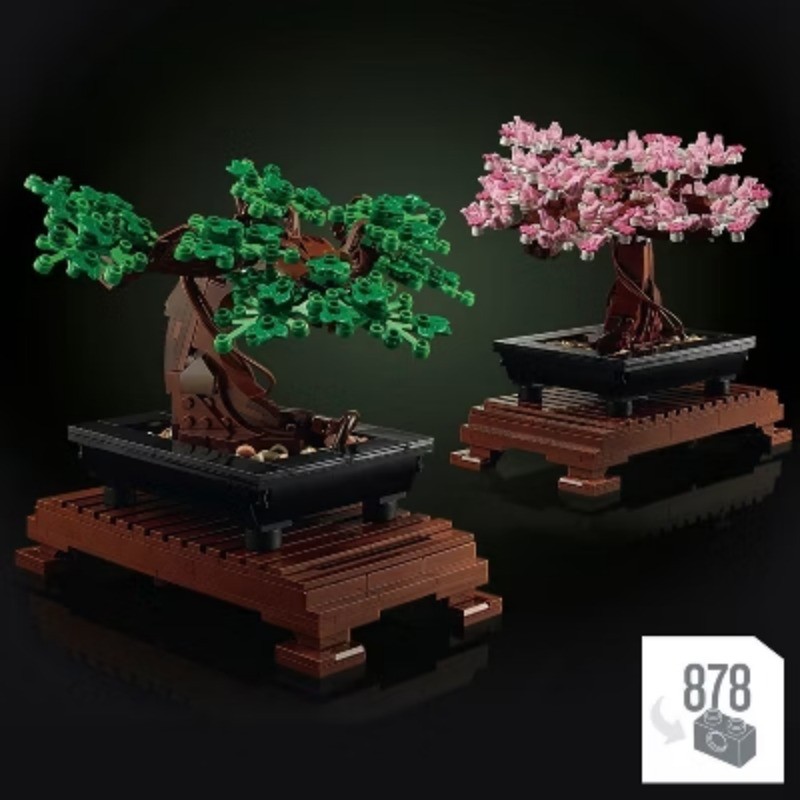 Description The art of bonsai has captured the imaginations of tree lovers for centuries. Now you can celebrate this ancient art with the LEGO Bonsai Tree model building kit. Enjoy a sense of calm as you carefully shape the bonsai tree model with either green leaves or pink cherry blossoms. When you're ready for a change, it's easy to swap the colored crowns to create a totally new look. Take a closer look at the pink blooms – do you see the tiny frogs that make up each blossom flower? The LEGO Bonsai Tree model comes with a rectangular pot and a slatted wood-effect LEGO stand, creating a pretty display piece to take pride of place in any home or office. Whether it’s a Mother's Day gift, birthday gift, or a treat for you, this set is sure to capture the imagination with its beauty. Part of the LEGO Botanical Collection for adults, it includes leaf elements made from a plant-based plastic, produced using sustainably sourced sugarcane. Measures over 7 in. (18 cm) high, 8.5 in. (21 cm) long and 7.5 in. (20 cm) wide. Contains 878 pieces. highlights Botanical Collection - This set is part of the unique adult LEGO Botanical Collection, including Flower Bouquet (10280), Wildflower Bouquet (10313), Dried Flower Centerpiece (10314), and Orchid (10311) Bonsai Tree Model - Features a LEGO bonsai tree model with a rectangular pot and slatted wood-effect stand, designed for adult builders Mindful Cherry Blossom - In this LEGO set for adults, designers created a mindful build with a unique cherry blossom pattern that becomes tiny frogs for fun Perfect Gift Idea - The Bonsai Tree makes a great gift for any occasion, such as birthdays, anniversaries, Mother's Day, and Father's Day. Also makes a great Valentine gift. Custom Arrangement - Both sets of leaves can be custom arranged, creating an eye-catching, unique decoration for any home or office Sustainable Plant-Based - Plants from plants: the collection uses several elements made from plant-based plastic, produced using sustainably sourced sugarcane Interchangeable Leaves - Includes pieces to style the artificial plant with classic green leaves or vibrant pink cherry blossom blooms